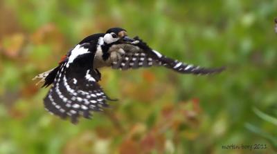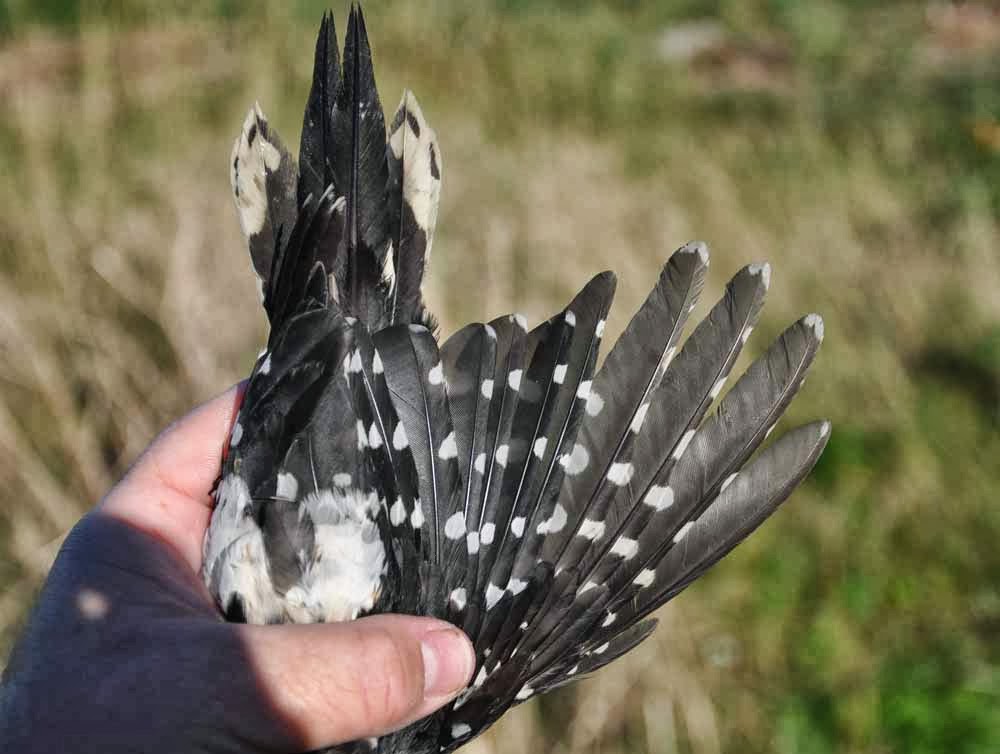 Alt tyder på at det er vingefjær fra en flaggspett. Om vinteren spiser den både kongler og nøtter, men om sommeren spiser den mest insekter, men også fugleunger fra fuglekasser og lignende. Den graver også ofte i maurtuer på leting etter mat.
