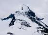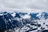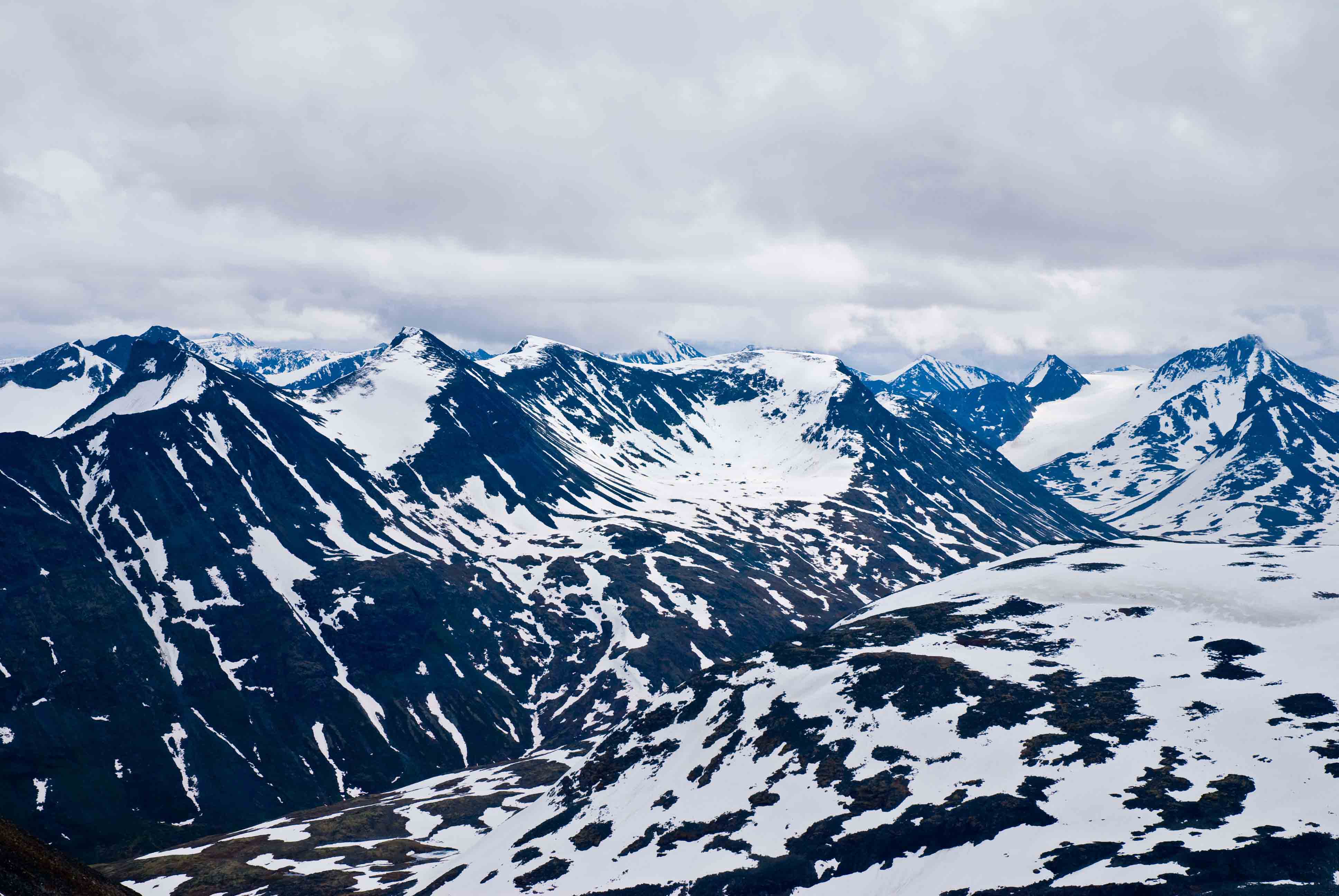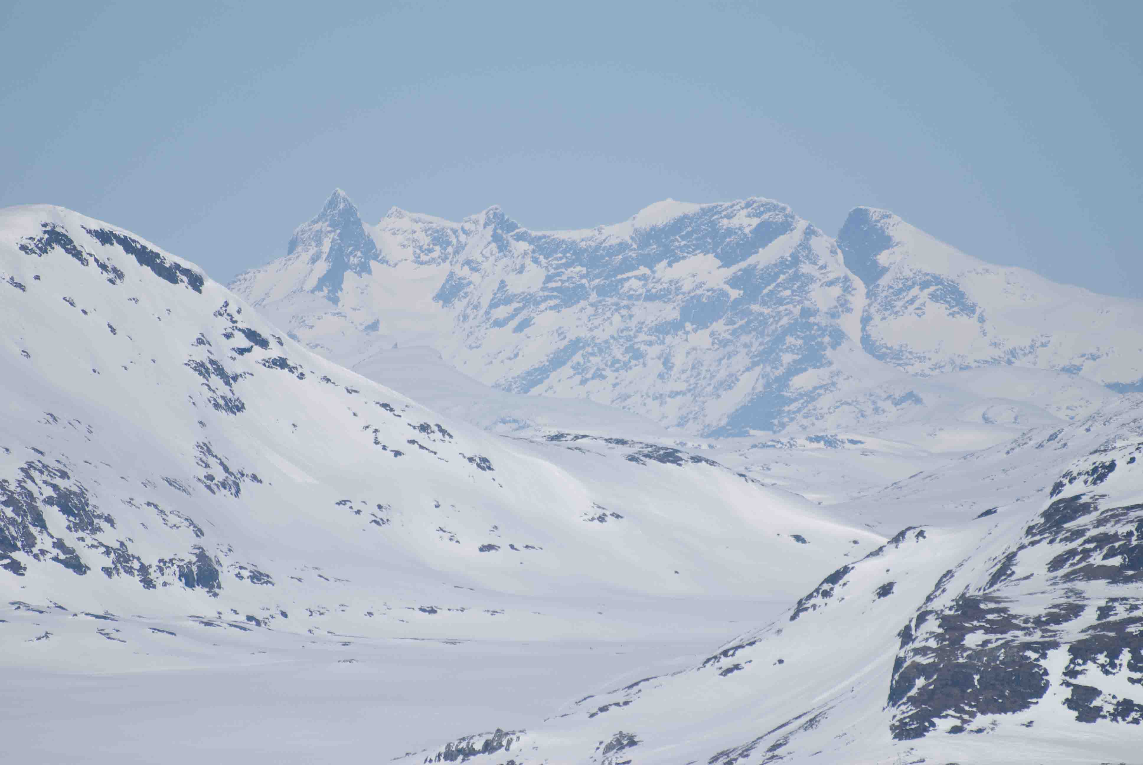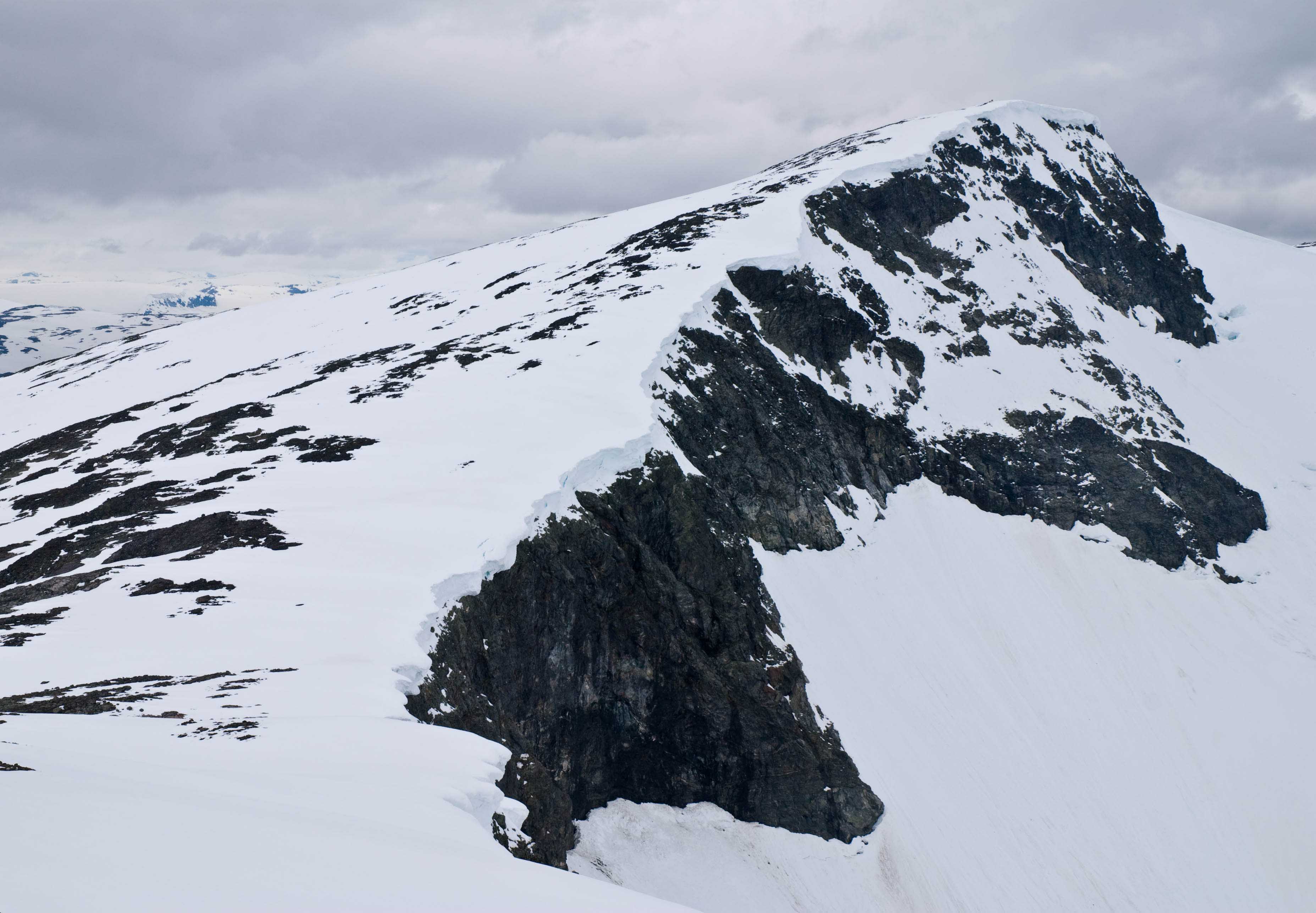 Eg må innrømme at eg tenkte ikkje så mykje over det dei få minuttane eg sat oppå der. Det kom ein del skyer og skodde austfrå akkurat mens eg var på toppen i tillegg til at det snødde, så eg knipsa omtrent berre bildet mot Storen før eg snudde ned att. Eg vil nok tru at det er meir stein som stikk opp langs ryggen enn det var nede i dalførene, men den øverste delen mot toppen har nok ein del snø fortsatt.
