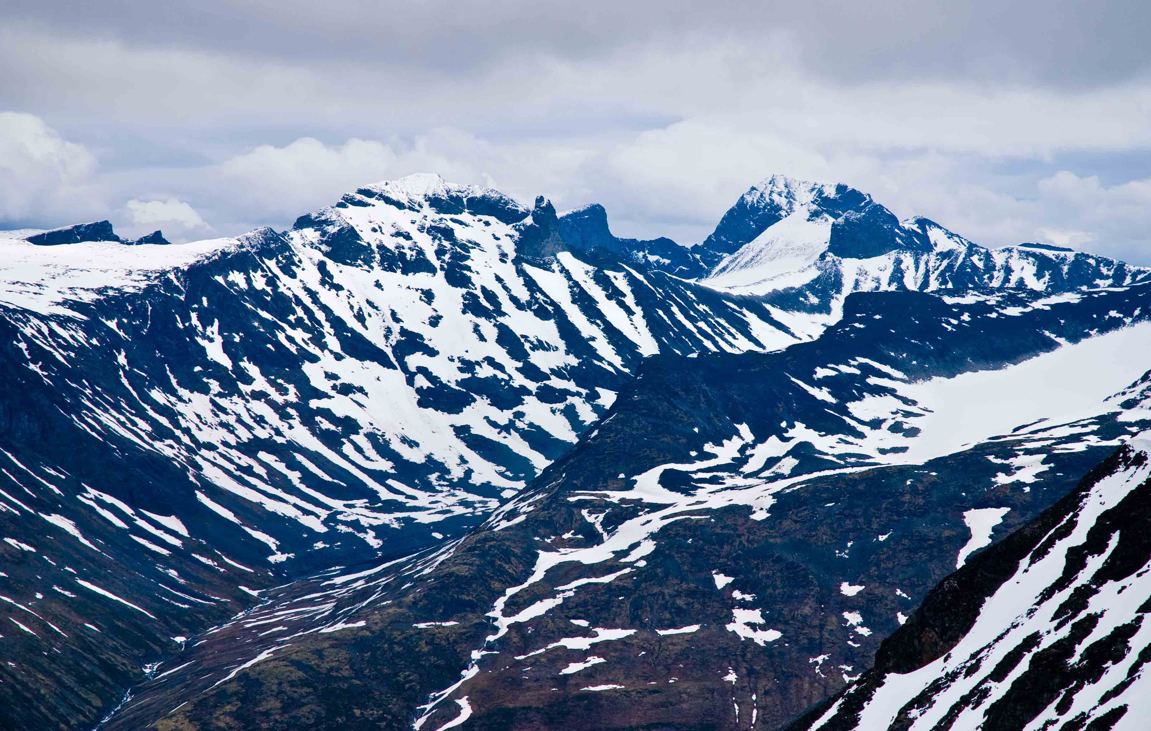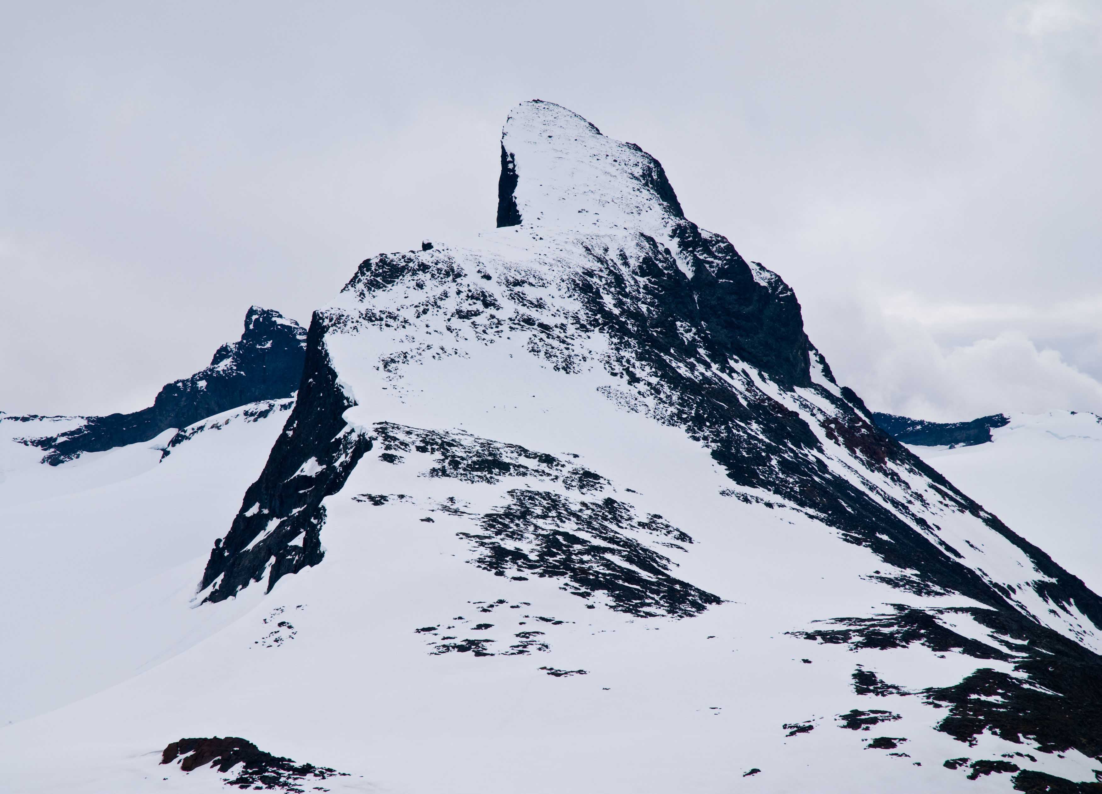 Siste fredagen i juni tenkte eg det var på tide å ta Store Stølsmaradalstind. Litt utpå ettermiddagen samme dag, fann eg ut at ein betre dag ville vore å venta ein måned eller to, men moro var det likevel. Eg kom meg ut av bilen ved Murane ca. klokka 0800 og tok fatt på spaserturen opp Austanbotn. Det såg rett så bra ut, med lite snø og eit brukbart vær som besto av litt skiftande skydekke med opningar av blå himmel. Austanbottstindane reiste seg raskt opp framfor meg, og kom ut av skodda som låg rundt mange av toppane i Hurrungane. Det gjekk enkelt og fint opp det vesle dalføret så eg nådde relativt raskt ryggen nedanfor Austanbottstindane. Der oppdaga eg to ting som ein start på ein litt tyngre tur. For det fyrste hadde eg ringa rundt Austanbottstindane alt for høgt, så eg måtte ned att eit par-tre hundre høgdemeter. Hadde ikkje sett tydeleg nok på kartet før eg stappa det ned i sekken i iveren på å komme meg ut. Den andre saken eg oppdaga var at øverste delen av Gravdalen i praksis var dekka av snø, så det var berre steinar som stakk opp her og der. Jaja, berre å hive seg ut i det. Eg sklei raskt ned i frå høgda på snøen og vabba meg over dalen og bort til foten av Stølsmaradalstind ved vatn 1368. Eg heiv i meg litt mat før eg byrja opp breen som ligg lengst ut mot Gravdalen. Det var tungt oppover, men ikkje så bratt som eg trudde det skulle være. Eg var likvel glad eg hadde med meg isøksa den aller siste biten av breen for å få litt betre tak, då det var nokre bratte snødekte meter heilt øverst. Resten av vegen til topps er relativt slakk og fin, men med all snøen måtte eg være forsiktig, for eg datt igjennom og mellom steinar med foten både støtt og stadig. Det går med ein del krefter på slikt føre også. Det snødde på toppen, så eg slappa berre av ei lita stund mens eg naut utsikten av Storen og Styggedalsryggen som halvvegs stakk ut av skodda. Eg kom meg så ned att så raskt eg orka, då det såg ut til at det skulle tjukne til. Men då eg hadde sklidd ned breen att mot 1368 så lysna det opp att, og sola kom fram. Eg vabba meg gjennom snøen som til tider gjekk langt opp på leggen (og låret dei gongene eg datt heilt igjennom) på vegen bort til Gravdalsbandet. Må innrømme at eg var dyktig sliten då eg kom meg bort mot Austanbotn att og kunne få litt bar bakke under føtene. Tusla så dei siste kilometrane ned til bilen og gleda meg til middag heime hjå foreldra mine. Neste tur på denn toppen blir litt seinare på året PS! Det var to fuglar som stupte etter meg i Austanbotn, då eg sikkert var i nærleiken av eit reir. Nokon som kan hjelpe meg med å finne ut kva det var (sjå bilete nedanfor). Eg tenkte umiddelbart hauk for dei virka for små til å være ørner, men eg er strengt tatt ganske uvitande når det gjeld fuglar...