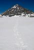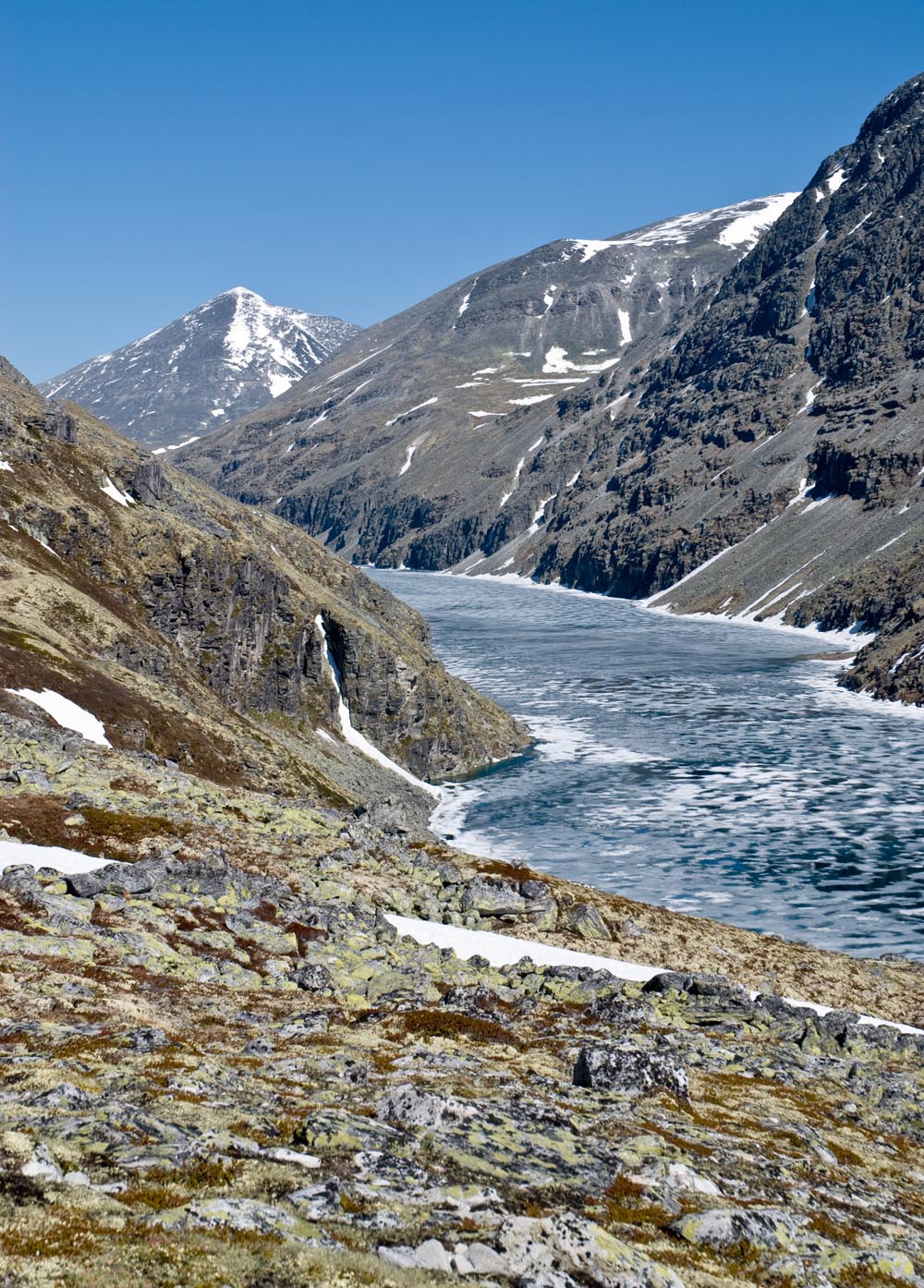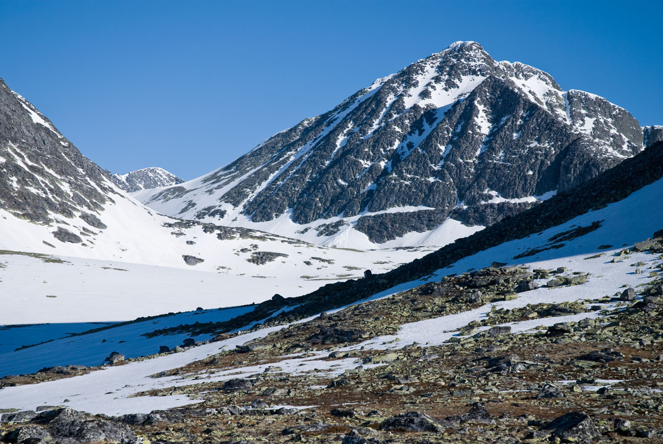 Fikk ikke noe svar, men var en tur på Storsmeden i går via Kaldbekkbotn fra hyttefeltet ved Bergetjønne. Tenkte å skrive en liten rapport på hjemmesiden min i morgen, og kan legge ut noen bilder her i samme slengen. Er fortsatt en del snø fra 14-15 hundre meter i Kaldbekkbotn. Gikk fint med med truger nede i dalen. Jeg gikk igjennom noen ganger (med sekk veier jeg 85-90 kg og har truger for folk opp til ca. 95 kg), men da det begynte bli bratt så ville ikke trugene sitte i snøen (taggene får ikke tak) så de fungert mer som akebrett. Og uten truger så sto jeg kjapt med snø til skrittet. Det ble derfor til at jeg måtte delvis krabbe oppover for å få mest mulig flate på snøen, og i tillegg gå mest mulig der steinene kom frem fra snøen. Det var mildt sagt litt tyngre enn jeg hadde forventet. Trodde det hadde satt seg litt mer i sørvest-skråningen, men den gang ei. Måtte være veldig forsiktig på veien ned igjen. Ellers kunne det gått en legg (eller minimum et alvorlig kutt). Gikk igjennom hele tiden.