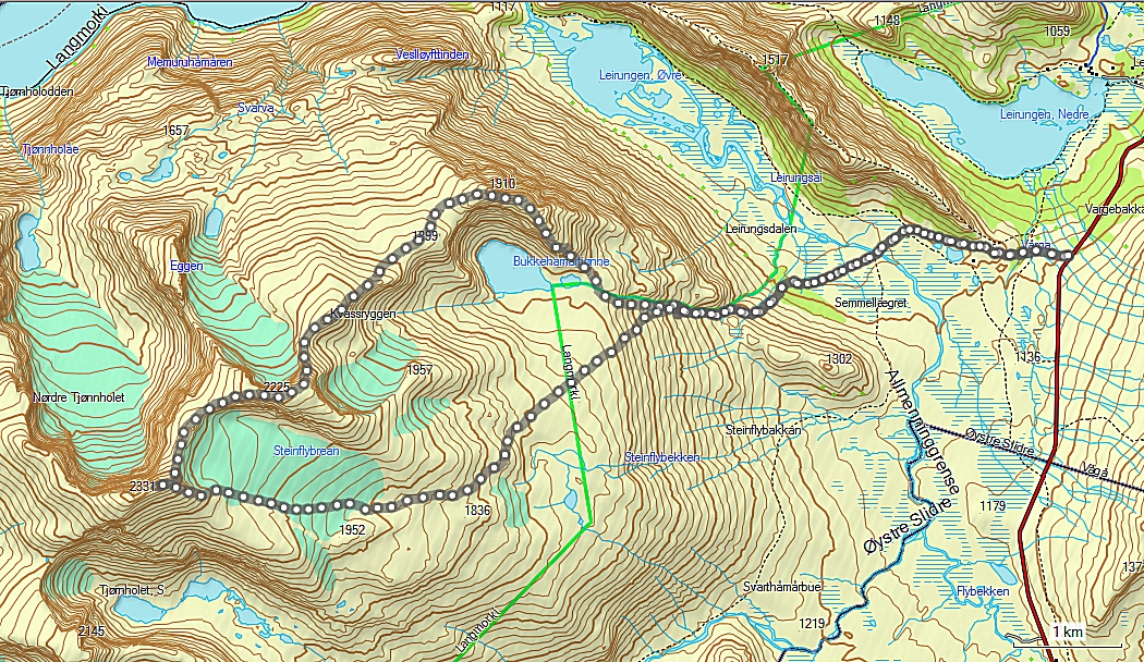 1. Jeg gikk denne turen 20. juli sammen med andre gjester på Grønolen Fjellgard. Noen luftige partier, men ikke bruk for tau eller stegjern. Vi brukte 10 timer t/r Vargebakken.