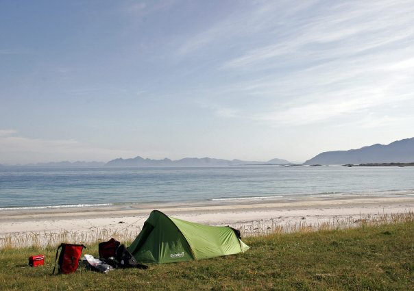 Jeg var selv på sykkelferie i Lofoten og Vesterålen for noen uker siden, og teltet bl.a. ved Utakleiv. Jeg synes derfor jeg bør komme med en rettelse: Utakleiv er ikke en kort avstikker fra E10. Det er over en mil fra E10 til Utakleiv og med endel oppoverbakker det siste stykket fram til gammelveien. På gammelveien er det tre km til til Utakleiv hvis man ikke velger å sykle gjennom den kortere tunnellen ved Haukland. Utakleiv er en langstrakt strand og det er mange som telter der. Det koster også 100 kr for å sette opp vinylboligen der, men dette virket det som om det var mere eller mindre frivillig om man ville betale. Det gikk også endel sauer da jeg var der, og jeg måtte fjerne endel sauemøkk på teltplassen. Bortsett fra det er Utakleiv helt klart en kjempefin strand å telte ved. Personlig likte jeg stranden ved Hovsund (mellom Saupstad og Vinje) på Gimsøya mye bedre. Avstikkeren dit er trivelig å sykle, flatt og lettsyklet på vaskebrettgrus og asfalt omkranset av store myrer og idylliske vann. Svært få mennesker, man har så og si stranda for seg selv, utsikten er formidabel, og får man midnattssol er det en opplevelse som man garantert vil huske. Jeg var heldig og fikk solnedgang mens jeg tuslet rundt i boksershorts og t-skjorte kl. 22-23 om kvelden. Jeg følte meg priviligert av å kunne oppleve slik idyll... Hovsund. Klikk på bildet for større versjon. Ellers er alle bildene fra turen lagt ut her: http://www.facebook.com/p.php?i=904335570&k=Z2B25YTRP24CUCG1VK6XW4U