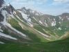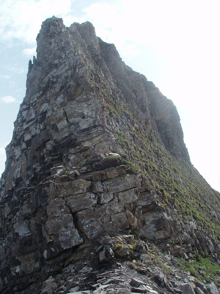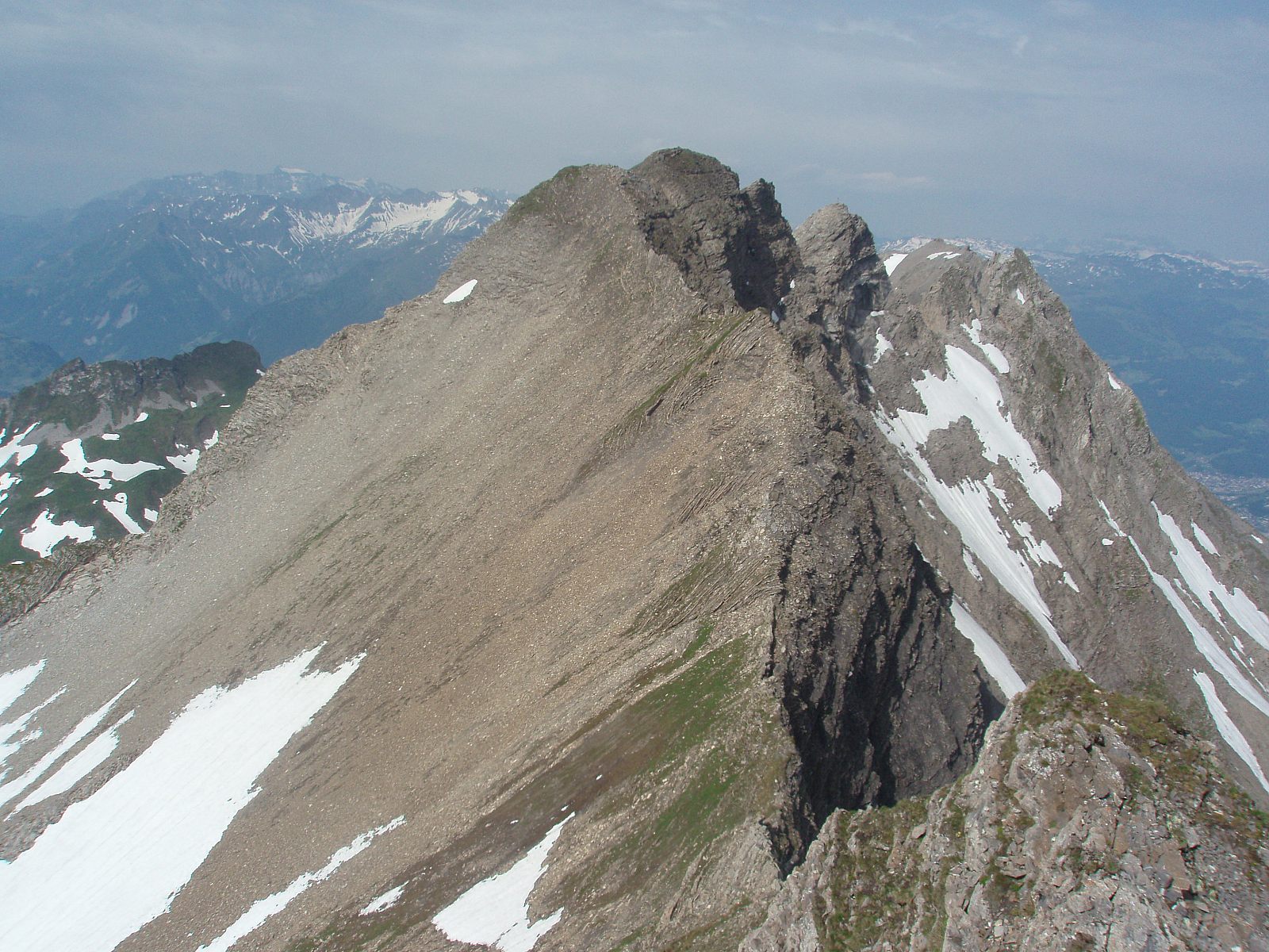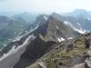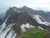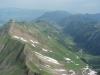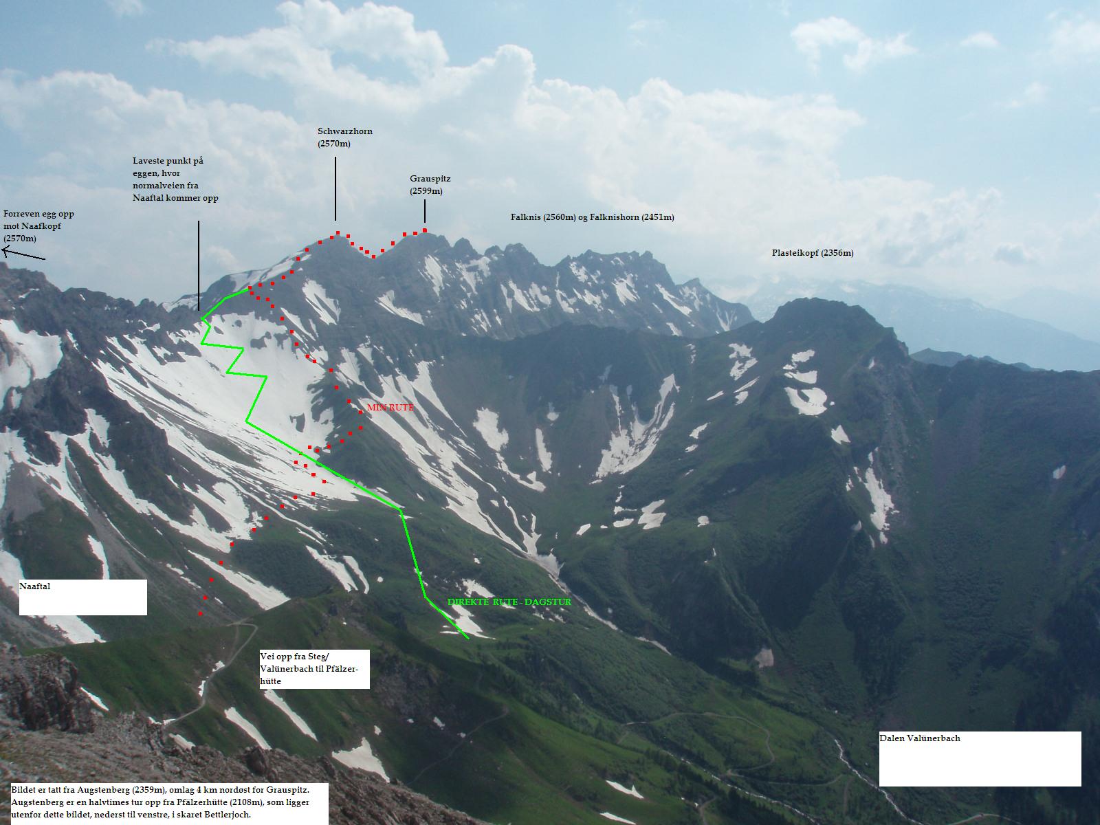 Grauspitz er en lite beskrevet topp, selv om man søker på internasjonale forum for fjellsport. Jeg var spent på denne toppen, høyeste punkt i fyrstedømmet Liechtenstein (2599m), da det var til dels motstridende, men også sparsommelige opplysninger om hvor enkel/vanskelig den var. Alene og i flott vær viste det seg at min variant til topps var en kurant tur, men med et utsatt klyvepunkt. Med leiebil kjørte jeg inn i Østerrike, og på motorveien mellom Bregenz og Innsbruck var det skiltet til Vaduz og landskjennetegnet FL (Fürstentum Liechtenstein). Etter å ha kjørt tvers gjennom byen Feldkirchen, kom jeg inn i dette lille fjellandet, inneklemt mellom Sveits og Østerrike. På turistkontoret fikk jeg en fin oversikt over fjellturer og hytter i landet, og kjørte straks opp bratte bakker, gjennom landsbyen Triesenberg, og videre til Steg. Det tok vel en halv time, og Steg var knapt annet enn et lite hotell og noe spredt bebyggelse. Veien inn til dalen Valünerbach tok av litt tidligere, så jeg måtte noen meter tilbake fra hotellet. Langs et irrgrønt vann gikk veien, og etter en halv kilometer var det en stor parkeringsplass. Antakelig kan man også bestille transport på firehjuling videre, hvis man vil spare atskillige høydemetre og flere kilometer på vei. Min høydemåler viste drøyt 1300 meter på p-plassen. Et alternativ til min rute, som gikk fra Steg, er å fortsette veien helt inn til Malbun på 1600 meter. Herfra kan man bestille tur med taubane opp til 2000 meter, men veien til Grauspitz blir da (horisontalt) atskillig lengre. I nær 30 varmegrader og vindstille brukte jeg 2,5 svette timer opp til en hytte i skaret Bettlerjoch. Hytta, Pfälzerhütte, ligger flott plassert på 2100 meter, og er betjent. Med overnatting og middag ga jeg snaut 30 euro – en fin pris i forhold til betjente hytter i Norge. Vann fikk jeg fylle gratis på hytta, og det anbefaltes ikke å drikke av bekker underveis. Slikt sett elsker jeg Norge! Fra Steg gikk det vei helt til hytta, men med muligheter for å velge også stier underveis. Etter 3 km mot sør passerte jeg Valüna, som var en bondegård. Like etter denne tok det av en sti via Gritsch, som skulle føre til hytta, men denne stien mistet jeg raskt, og returnerte til veien. Underveis var det stadig fin utsikt opp mot Grauspitz, selv om det er andre topper som tar seg bedre ut, og som er mer framtredende. I motbakkene tok det snart av en sti østover og inn i Naaftal, og denne var en fin avveksling til veien. Det hadde også vært en mulighet å gå rett sørover og bratt opp, og kommet inn på ”stien til Grauspitz” – dersom en vil ta toppen på en dag. Dette punktet å ta av stien på, ligger på omtrent 1740 meter, med gps-koordinatene 32 T 544926 5212930. Ingen merking eller skilting her… Etter 7,5 km fra bilen, og 2,5 timer og 800 høydemeter senere, var jeg altså framme på hytta. Før kvelden senket seg tok jeg en liten tur opp på merket sti til Augstenberg, 2359m, og fikk dermed flott utsikt bort på morgendagens mål. Fra toppen så jeg i motsatt retning rett ned i landsbyen Malbun. Topp dag Neste morgen startet jeg kl 7.30, og måtte dessverre gå 200 høydemeter ned igjen, og tilbake (vestover) fra hytta, før jeg kunne ta fatt på oppstigningen. Her fant jeg en utydelig sti, og lagde en liten varde ved koordinatene 32 T 545885 5213092 på 1898 meter. Tråkket gikk sørvestover i ganske hellende terreng, tidvis i steinur, og en flokk steinbukker fulgte oppmerksomt med meg fra stor høyde i snøhellinger oppunder eggen til Naafkopf. Murmeldyrenes skrik varierte: 1 skrik betyr visstnok umiddelbar fare - alle må gjemme seg. Flere skrik betyr fare - pass på. I en forsenkning ved et digert snøfelt så jeg noen i øverste del av feltet, som var i ferd med å komme opp på laveste punkt på eggen, som forbinder Naafkopf og Schwarzhorn. Sistenevnte må man gå over for å komme til Grauspitz. (Eggen fra Naafkopf til dette skaret innebærer garantert mye klatring og flere større rappeller, og er svært forreven.) Jeg er ikke glad i å gå oppover på snø, og valgte heller en gresskledd svært skarp egg, som ledet opp mot tidligere nevnte egg, men nærmere Schwarzhorn. På slutten ble det ganske bratt og løs steinur, men helt uten problemer opp til eggen mellom Schwarzhorn og Naakopf, og så videre lett opp i mer vestlig retning til Schwarzhorn 2570 m. Her var utsikten mot Grauspitz flott, og jeg var spent på hvor bratt det egentlig var ned i skaret mellom de to toppene. Jeg satte igjen sekken, og kløv tidlig ned et bratt og noe løst parti på 3-4 meter, men ikke så utsatt. Det var nok grad 2 her, og kanskje en pluss også. Videre var det grad 1 og fortsatt løst, så vær forsiktig! (Det bratteste punktet øverst kan nok omgås ved å gå ned en bratt renne med gress, og traversere i bratt gresslendt terreng tilbake til eggen igjen. Men dette blir utsatt klyving på gress og løse steiner, og neppe et bedre alternativ, tror jeg.) Eventuelt får en ta med 15-20 meter tau i sekken. Det ble 100 hm nedover, før eggen igjen reiste seg mot Grauspitz. Det var grei fottur opp til toppunktet på 2599 meter, og kun markert med en steinhaug. På de andre toppene omkring var det kors på nær sagt alle. Gps: 32 T 544147 5211186. Jeg skrev meg inn i toppboka, som nummer to i år (24/6 2008). Toppen er ikke mest besøkt, og de lokale vandrerne skriver seg visstnok ikke inn i disse bøkene. Eggen videre i retning Falknis virket tøff, og krever nok taubruk. Jeg rekognoserte ikke denne nærmere, men returnerte de om lag 3 kilometerne (horisontalt) tilbake til Pfälzerhütte. Totalt 5,5 timer. På ettermiddagen tok jeg en tur opp på godt merket og artig sti til Naafkopf også (2570m), og fikk fin utsikt mot Grauspitz også fra øst. Anbefales. 1,5 t meget frisk gange t/r.