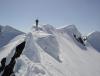 6. Med Kniven og Saksa ”i beina” fra dagen før, skulle dagens mål være peanuts: Sørlige Smørstabber og Gravdalstinden. Vi mente å ha gjort et genialt trekk da vi parkerte ved Fantesteinen, og lett kunne kjøre på skaren nedover og i retning Bøverbreeen. (Da jeg etter turen måtte traske veien fra Krossbu og opp til Fantesteinen, 25 min, var jeg ikke like sikker på det geniale i dette.) Ved foten av Bøverbreen fikk Lars-Petter skifellene mine, mens jeg gikk med stegjern på den harde skaren. Det gikk raskt oppover i sørkanten av breen, og snart var vi oppe på breflata. Storen skiller seg ut fra Vesle Skagastølstind fra denne vinkelen, og det var et interessant skue. 2 timer etter start begynte vi på de siste bakkene opp til det vi trodde var Smørstabbtinden SV (2045m), men undret oss over at GPS-en ikke var helt på bølgelengde. Det flotte været gjorde at det først var på toppen at jeg dro fram kartet igjen, og kunne slå fast at GPS-en hadde rett; dette var bare høyde 1927 nordvest for dagens første mål. Vi ruslet ned og fant ut at det egentlig ikke var noe tap; det var fantastisk bare å leve i dag, så å si vindstille og sol fra klar himmel. Frokost ble inntatt i motbakkene opp mot Smørstabbtinden SV, som bød på overraskende fin egg og nydelig utsikt oppover. Etter 3 timer fra bilen kunne vi notere oss dagens første topp, fotograferte, og gikk raskt videre. Nå strømmet det folk til fra alle kanter, virket det som. I skaret sør for S-1 satte vi fra oss skiene og sekkene, og tok fatt på Gravdalstinden. Gravdalstinden (2113m) og vinkelmåling Sporene gikk dype litt sørøst for eggen og opp. Det var en bratt helling her, som man dermed kunne runde. Det gikk såret greit opp, snaut 20 minutter. Fortsatt var det flott og enkelt å gå med stegjern på skaren. Nye bilder og deilig utsikt, før returen; der jeg ville prøve å ta meg ned den bratte hellinga stien opp hadde unngått. Det var jammen bratt, men uten problemer med stegjern. Midt i bakken målte jeg hellinga med skistavene mine: Jeg har markert hver 10 cm på stavene, og målte midt i bakken: Vertikalt mål 100 cm, horisontalt mål 70 cm, antatt 90 grader mellom stavene. 100/70 er om lag 1,43. Inv TAN av dette gir en bakkehelling på 55 grader – kjekt å vite og grei erfaring å ha med seg.) Noen folk på ski lurte etterpå hva for en gærning som hadde gått ned der, men jeg følte det helt trygt med stegjerna mine, og det var egentlig ikke så altfor langt å rutsje heller, om en hadde prestert å falle. En artig egg Opp mot 2033 var det blitt svært bløtt i solhellinga, med stadige gjennomslag, og i sitrende spenning over neste egg som ventet formelig småløp vi nedover østeggen. Jeg rakk knapt å ta bilde på toppen (2033). Snart ble det overraskende bråstans ned eggen, og jeg husket med ett å ha lest noe om dette. Heldigvis gikk det en liten hylle tilbake i den isete skyggesiden – og det var ikke utsatt her. Et fall ville bare gi en begrenset rutsjetur, så jeg sparket opp skikkelige trinn med stegjerna, sønnen sendte sekkene ned til meg, og snart kunne vi lett fortsette bort den tidvis luftige eggen. Denne eggen var høydepunktet denne dagen, se bildene! Vi kom etter hvert ned i et skar igjen, satte igjen sekkene med skiene på, og ruslet lett opp på 2030 – dagens fjerde 2k, med flott utsikt rett bort på Storebjørn. Nordeggen ned denne så helt grei ut, men vi skulle tilbake til sekken, og spente skiene på, og suste som dagen før ned til Krossbu. Da gjensto bare å rusle opp til Fantesteinen, hvor bilen sto parkert. Det var nok bedre å gå asfalt tilbake til bilen, enn å slite i våt og tung snø samme vei. Selv om godværet var meldt å fortsette, var vi nå vel fornøyde og svidde i ansiktet, og satte nesa hjemover.