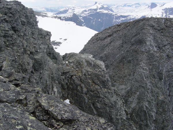 Rask ankomst 1.juli var værmeldingen topp for Romsdalen, og tanken min om at det å kjøre riktig tidlig om morgenen fra Bagn i Valdres, for derved å få lite trafikk, viste seg å være en av de lureste ideene denne sommeren. Avreisen skjedde 6:30, etter at Sondre også var hentet, og vi møtte knapt en bil over Valdresflya, seinere over Slådalsvegen til Lesja. Allerede 10:30 var vi parkert i Vengedalen, og det faktum at jeg kjører Volkswagen Caravelle – diesel – sier noe om at farten ikke kan ha vært akkurat halsbrekkende… Stekende anmarsj Forholdene var perfekte, vindstille og stekende sol, men nordveggen på Hornet kom nok til å bli klatret i skygge, så det ut til. Planen var å gå videre over Lillehornet og Hornaksla, og så løpe/skli på snøen hele veien ned igjen. Snøen lå ennå omtrent helt ned til veien i Vengedalen, og en slik retur på snø var langt å foretrekke framfor 4-5 rappeller i løsgods ned nordveggen, kanskje med en rekke taulag på vei oppover samme rute. Vi holdt oss mest mulig på barmark, der vi skrådde oppover mot ryggen som fører fra Lillefjellet til skaret under nordveggen. Etter hvert kunne vi ikke unngå snø, og vi følte oss snart som nygrilla kyllinger, stekt i eget fett, der vi stabbet oss oppover det siste drøye snøfeltet. Heldigvis var snøen passe hard slik at vi slapp gjennomslag. Vi var begge så gira at det egentlig gikk litt for fort, og i alle fall var jeg rimelig kjørt da vi kom fram til skaret i skyggen under Hornet allerede etter halvannen time. Her ble det obligatorisk fotografering i stort skrev med Store Trolltind i bakgrunnen, og med Romsdalen under. Så skiftet vi til klatresko – og moroa kunne begynne! Nordveggen Den første taulengden (grad 2) unngikk vi glatt ved å holde mer til venstre, mot Vengedalen, og på denne måten passere vi også et taulag på vei opp. Så ble det markant brattere, og klatringen (grad 3-4) begynte. For Sondre var dette ”plankekjøring” – og han så det hele mer som trening på å legge gode sikringer. Han valgte slett ikke alltid letteste vei, og på de to første taulengdene kom klatringen tidvis garantert opp i 4+. Selv om jeg hadde sekken, kunne jeg jo ikke klage så lenge jeg fikk tau ovenfra… Etter to taulengder flatet det noe ut, og klatringen endret retning på skrå oppover mot venstre. Dette virket så lett at jeg ba om å få lede. Det var samtidig en god unnskyldning for å slippe sekken litt. Vel oppe på en solid hvit avsats var det satt en kraftig ringbolt i fjellet. Herfra valgte vi å gå usikret resten av veien til topps, for det var tørt og fint fjell, lite utsatt klatring, og solide bøttetak hele tiden. Toppen var stor, flat og – solfylt (!), akkurat slik jeg husket den fra 1991, 14 år tidligere, den gang Aak Fjellsportsenter avsluttet klatrekurset i juni med en tur opp nettopp nordveggen, og den gang jeg hadde lært taubruk for første gang – litt nostalgisk i grunn. Når vi tenkte etter hadde turen opp nordveggen gått overraskende enkelt i grunn, og jeg som hadde forventet mye løsgods kunne slå fast at det slett ikke var så ille. Trafikken i veggen en fredag så tidlig i sesongen var også laber, heldigvis. Lillehornet Etter mat og fotografering ruslet vi bort til sydeggen, og fant raskt ut at vi ikke gadd legge en rappell ned til skaret øverst i Halls renne. Litt forsiktig klyving, og vips var vi nede i skaret. Jeg kikket ned ”normalveien” med tanke på en eventuell bestigning via denne veien en gang, og som forventet var de øverste 10 metrene ganske bratte. Sikkert kjekt med tauet akkurat her, men ikke så utsatt klatring i grunn. Videre lå det en lang snørenne nedover i renna nå, som virket både bratt og hard. Jeg var glad vi skulle videre. Fra skaret klatret vi også enkelt opp på Lillehornet – uten å kjenne behov for tau. Nye fotografier, og så søkte vi videre sørover. Eggen gikk først tålelig bratt nedover, og ved meget forsiktig klyving kom vi oss rundt 20 meter ned på et slakere parti. Her forventet vi en rappell snart, og sannelig: Dette så ut til å bli luftig, ja! Luftig rappell ned søreggen på Lillehornet For første gang på turen kjente jeg en følelse av svimmelhet, særlig fordi jeg skjønte at vi ikke kom helt ned med bare en rappell. Vi hadde bare tatt med ett tau, og måtte altså finne et nytt feste lenger ned i veggen. Det var svakt utover-hellende sva ut mot Romsdalen 1500 meter under, og jeg lot med glede Sondre søke først nedover og utover, til han fant passende rappellfeste: To små bolter i en liten sprekk, litt på ”feil side” av kanten på fjellet. Jeg forankret meg i disse før jeg turte gå helt ut mot stupet. Heldigvis var det en meget stor og solid hylle om lag 20 meter under. Der ville vi sikkert finne nytt rappellfeste, og der ville vi ikke stå så eksponert, heller. Sondre la tauet rett i gjennom hullet i bolten, og suste ned som førstemann, men da han prøvde å dra tauet etter seg satt det bom fast. Jammen er det lurt at førstemann sjekker slikt! Jeg la rappellen litt annerledes, men Sondre klarte fortsatt ikke dra en centimeter. Dermed måtte alt tauet opp, og jeg la en karabinkrok gjennom den andre bolten, og lot tauet løpe gjennom denne. Ulempen var at karabinkroken ble liggende å vippe på kanten – ikke akkurat optimalt, men Sondre klarte nå å dra tauet i gjennom. Dermed kom jeg forsiktig etter. Underveis var jeg glad vi ikke skulle opp denne veien, for her var det jammen luftig og utsatt. Nede på hylla/avsatsen fant vi en grei blokk som dugde til nytt rappellfeste, og så var vi nede på ryggen opp mot Hornaksla. Igjen var jeg glad vi ikke skulle opp der vi nettopp hadde firt oss ned, og forsto godt at opptaket var en solid femmer. Hornaksla og retur på snøen Eggen opp til Hornaksla var utsatt, men med gode tak i sprekker på ”godsiden” – den siden som vendte vekk fra stupet mot Romsdalen, og krevde ikke tau på tørt fjell. Vel oppe skiftet vi til fjellst