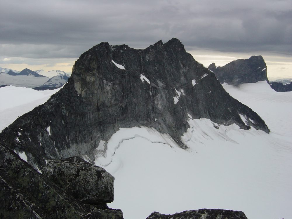 Tirsdag 26.juli var dagen jeg skulle avslutte ”prosjekt 2300-meter”: Ved å bestige Styggedalstind, Sentraltind og Vesle Skagastølstind ville alle landets topper over 2300 meter være komplett. Sondre var med meg, og med en slik crag-rotte foran i tauet skulle det mye til å stoppe oss. Vi startet 5.15 fra bommen i Helgedalen – ikke noe for tidlig for en tur med slike ambisjoner. Med mye klatreutstyr, klær for mulig væromslag, to tau, mat og drikke i sekken, gikk det ikke overvettes fort oppover bakkene innerst i Helgedalen. Jeg hadde nyinnkjøpte stegjern med meg, og vi prøvde dem ut på blåisen oppover Styggedalsbreen. Det hadde nok vært raskere å gått opp i Styggedalen, og svingt sørover opp til punkt 1838. Nordvestryggen Etter nær 4 timer sto vi på laveste punkt (ca 1800 m) på eggen som skiller Styggedalsbreen fra Jervvassbreen. Vi betraktet ryggen oppover, som så vanskeligst ut i starten, der et snøfelt måtte krysses. På fjell følte vi oss mer trygge, men vi hadde med isskruer også, i tilfelle… Opp til 2000 meter var det svært grov ur, før eggen smalnet av, og vi måtte ut på snø. Snøen var imidlertid ikke hard, og vi tok oss greit opp feltet som hadde sett litt ekkelt ut. Så snart vi kunne svingte vi inn på fjell igjen, og jeg la om til svasko – det ga meg litt mer å gå på følte jeg. (Sondre fullførte hele turen med sine klatresko i sekken…) Vi holdt oss på fjell i underkant av snøfeltet videre, men ett punkt måtte jeg igjen ut i snøen. Da var det godt å tråkke i sporene til Sondre. Det ble litt isete, men ikke utsatt, for å komme inn på fjellet igjen, og jeg fikk nytte av isøksa i det jeg svingte meg inn – og skled! Øksa holdt taket, og så var det toerklatring oppover eggen. Etter kanskje 20-30 meter ble det markert brattere, og jeg forlangte tau. Vi hadde nok kommet for langt til høyre, og fikk en 20-meters taulengde treerklatring, før vi igjen la tauet i sekken, og svingte mot venstre. Ved å krysse litt oppover, vesentlig i venstre side her nede, var det akkurat som føreren hadde sagt; klatring av grad 2-3. Vi følte ikke behov for tau, og fulgte naturlige drag og renner som ikke var spesielt utsatt. Litt overrasket kom vi helt opp på denne måten, etter hvert litt mer klyvende på selve eggen. Vi var aldri over på høyre side (slik at vi så rett ned i Styggedalsbreen). I blant var det ganske mye løst, men ved å prøve takene forsiktig gikk det greit. Hadde det vært en del mer snø, hadde turen blitt ganske annerledes, og vanskeligere. Klokka var blitt rundt ett da vi var på toppen, og vi droppet planene om å rusle bort til østtoppen, som omtrent forsvant i tåka. Tidvis fikk vi litt utsikt denne dagen, og var raskt framme med kamera da. Sentraltind Veien videre var enkel, særlig fordi det var tørt. En kort renne a grad to måtte klyves ned, på Midtmaradalssiden. Oppover mot Sentraltind, som tidvis forsvant i skyene, så det mer skummelt ut, men vi fant greie omveier til høyre for to bratte punkt. Så ble det snart virkelig skarpt og bratt, men med gode tak: Helt tydelig treerklatring her! Tauet ble tatt fram, og dagens andre lille taulengde (20 m) gikk svært greit. Klyving den siste biten førte oss til topps, og vi hørte med ett mange stemmer: Helt sikkert fra Storen. Tidvis fikk vi glimt av toppene omkring, men jeg tenkte mest på en ting nå: Vann! Og like etter toppen lå en liten snøflekk, som produserte en halv liter på flaska mi i løpet av et minutts tid – supert! Vesle Skagastølstind Også videre mot Vesle Skagastølstind var det overraskende greit, sikkert fordi det var bart og tørt. En bratt hammer kunne ved undersøkelse omgås uten tau ut mot Styggedalssiden. Utsatt, ja, men gode tak. Litt rester av snø måtte vi over oppover mot Vesle, men her var det ikke utsatt, og snøen var myk og fin. Det ble noe brattere, samtidig som vi fikk fantastisk utsikt et øyeblikk bort på Storen. Den så skremmende bratt ut herfra. Sondre, som hadde litt mer krefter, gikk opp i forveien og sjekket veien videre. Jeg kom etter, og jublende svett kunne jeg la meg fotografere på toppen. Med denne var alle toppene over 2300 meter endelig beseiret! Et mål jeg hadde hatt i mange år. Klokka var nå nærmere 18, og vi begynte å få det travelt. Skulle vi velge Skagastølsryggen ned, eller over Storen? Sondre var nok svært interessert i denne, så vi lagde i stand 50 meter rappell ned i Mohns skar, og firte oss greit ned. Selvsagt ville ikke tauet ned igjen, og Sondre gikk armgang opp og rettet på det hele. Så gikk det greit, men klokka var blitt 19 innen vi sto i Mohns skar. Storen og uværet Svært spente gikk vi løs på eggen oppover mot Storen. På avstand så det rett og slett avsindig ut, og regnet som nå satte inn gjorde det ikke mer attraktivt. Men det gikk overraskende greit, og føltes ikke så utsatt som forventet. Gode tak og litt kryssing til høyre og til venstre gjorde at vi ikke følte behov for tau nå heller! Jeg var imidlertid glad jeg gikk i svasko, for det ga litt ekstra: Jeg kunne stå trygt på forholdsvis små hyller. Slingsbys fortopp ble passert i tåke og regn, og på ett bratt punkt opp litt lenger borte, ba jeg Sondre hive ned tauenden til meg, og fikk sikring opp de 3-4 meterne. Noen kjappe bilder av varden i tåkehavet ble tatt, før vi listet oss ned i skaret der Andrews rute kommer opp. Like etter fant vi digre slynger, og tok tre rappeller (med ett tau) ned til Hjørnet. Vi hørte stemmer nede i tåkehavet, og var ekstra forsiktige med tanke på steinsprang. Det regnet mer og mer, og etter om lag 100 høydemeter kom vi til ett markert svaparti. Her var to fedre med to unge gutter i gang med rappell på glatta. Vi betraktet det hele en liten stund, mens det satte inn med et voldsomt sluddvær. På minutter ble det dannet store bekker med vann, og svafeltet ble om mulig enda mer såpeglatt. Vi nølte ikke med å legge en rappell her, vi heller! Heldigvis ble det etter det