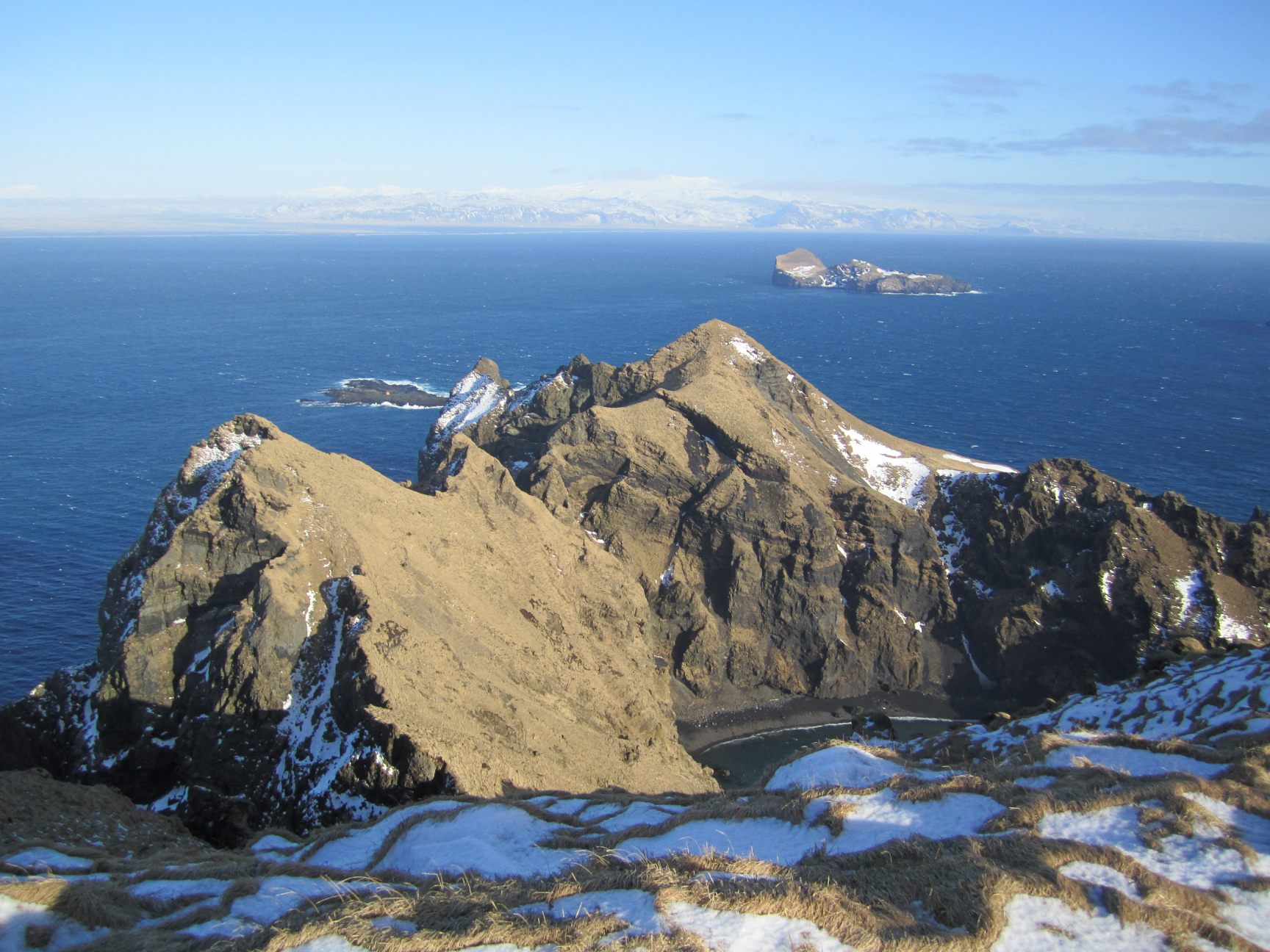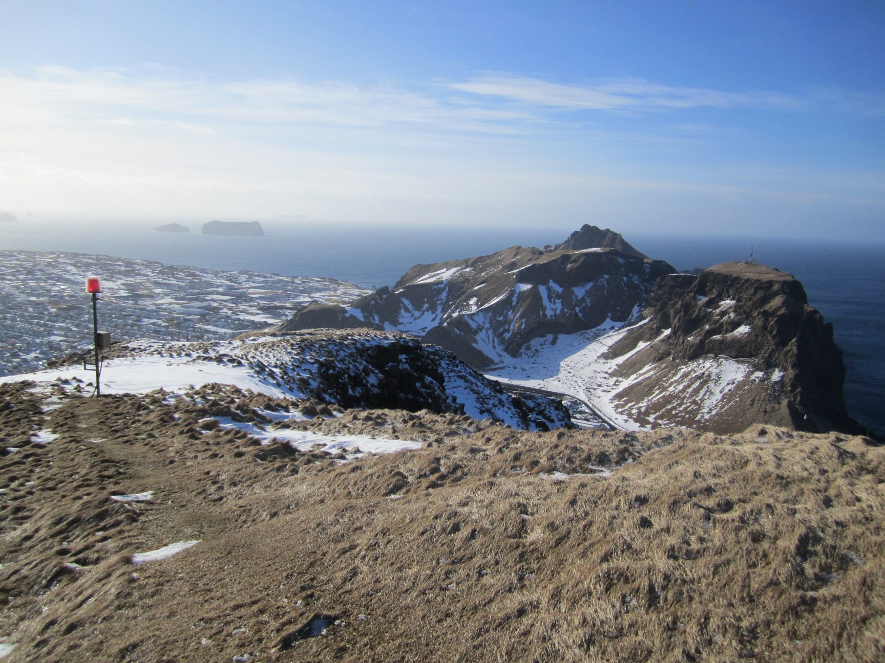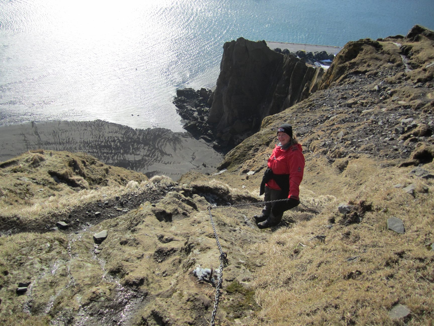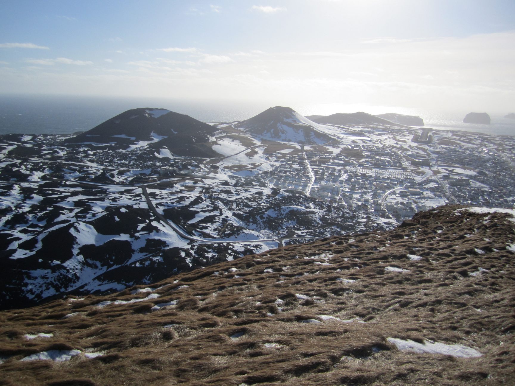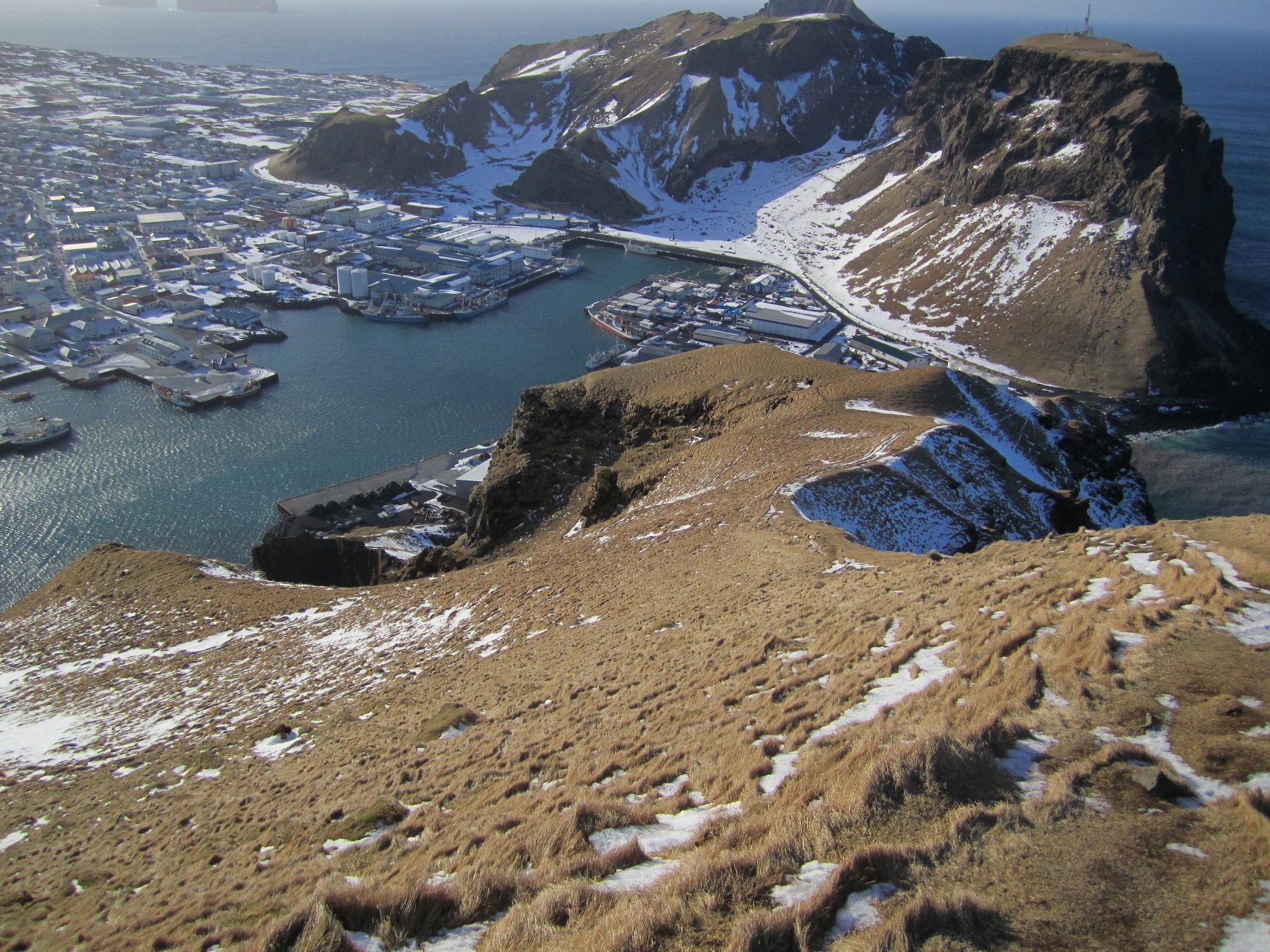 Vi (jeg) kunne ikke være bekjent av å ha vært på Vestmannaeyar, uten å ha besøkt det høyeste punktet, og særlig ikke når turistguiden sa det var grei sti til topps. At det også var satt opp stiger og kjetting på vanskelige punkter, betydde krydring av turopplevelsen for min del. Kona skjønte tidlig tegningen, og ga meg fri fart oppover, siden hun med rette antok at jeg med tiden ville komme ned samme vei igjen. Her var det ikke mulig å gå ned andre steder uten å rappellere. Sola var nå kommet skikkelig fram, og vinden sørget for ytterligere spenning – i alle fall i øvre deler av fjellet. Jeg kløv energisk opp flere passasjer med stiger i vestflanken av fjellet, og konstaterte at dette ellers ville vært avansert klatring så langt jeg kunne vurdere det. Snart kom jeg over i bratt gresskledt lende i sørvestflanken, med loddrett utsikt ned til fjæra og byen. Kjetting var satt opp på et par utsatte steder, og i de kraftige vindkastene benyttet jeg meg av hjelpen. Stien ble etter hvert fylt av snø og is, og det var ikke tilrådelig å fortsette på denne (fordi det var bratt og utsatt og sterk vind), så jeg gikk i stedet rett oppover på grasstustene og krysset utallige dyretråkk, antakelig etter sau. Et par ganger ble vindtrykket så stort at jeg kom i ubalanse, og måtte ned med en hånd eller to, og jeg var litt spent på hvor bratt og utsatt toppeggen egentlig var. Savnet stavene sterk nå! Så ble endelig spenningen avløst av lettelse; det var gressegg til topps, men den var ikke sylkvass, og stort sett snøfri også. Etter rundt tre kvarter kunne jeg skrive meg inn i toppboka på Heimaklettur, og nyte utsikten i solskinnet. Særlig var eggen videre imponerende, og neppe tilrådelig uten tau. Utsikten mot Islands sørkyst fascinerte, og vulkanen Hekla mente jeg også å kunne se der inne i horisonten. På veien ned valgte jeg for spenningens skyld å følge toppeggen mye lenger. Sterk vind, bratt og til tider smal egg med gress, gjorde meg faktisk litt skjelven, og jammen gled jeg ikke også! Det ble ikke store rutsjeturen, men klærne ble møkkete, og jeg fikk et øyeblikk opp pulsen betydelig. Bekymrede måker fra den bratte og snøkledte nordsiden av fjellet kom svært nær, og noen gjorde det jeg vil kalle advarende manøver mot meg; jeg var nok uønsket! Men jeg hadde ingen interesse av å utforske nordsida uten tau, og tok meg etter hvert ned gresslia til stien og stigene igjen. Heimaklettur anbefales varmt om en først har kommet seg ut på Heimaey! Gps-koordinater for toppen: 27 V 536844 7035940 Jeg målte den til 296 meter. Det går bilvei fram til foten av fjellet, og den ender i en stor parkeringsplass.
