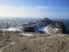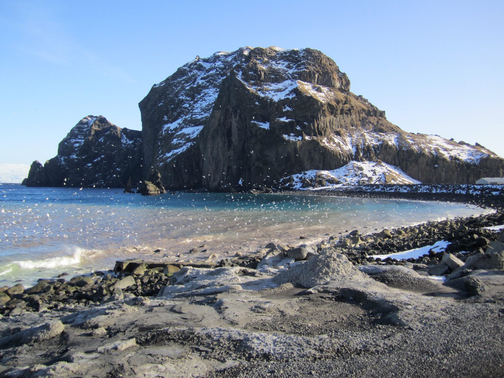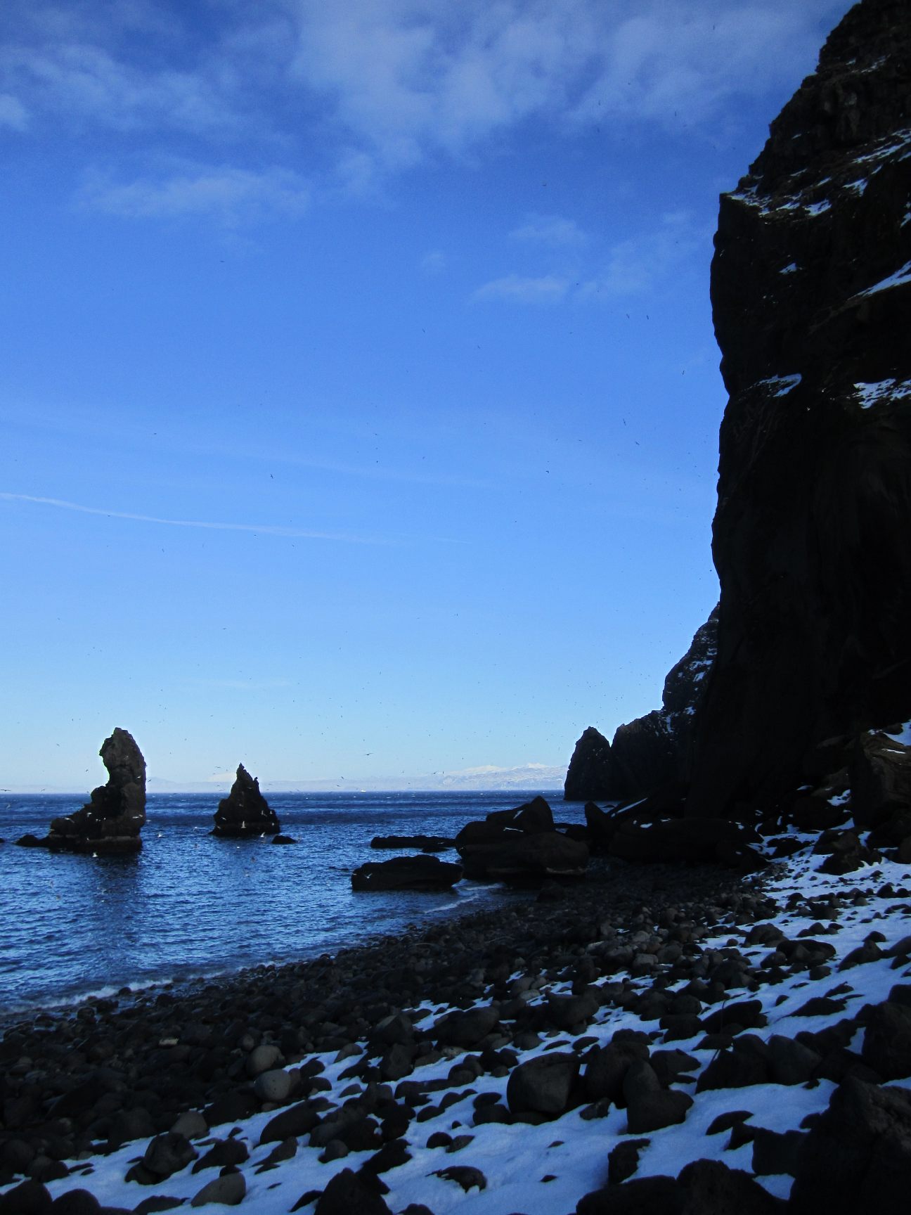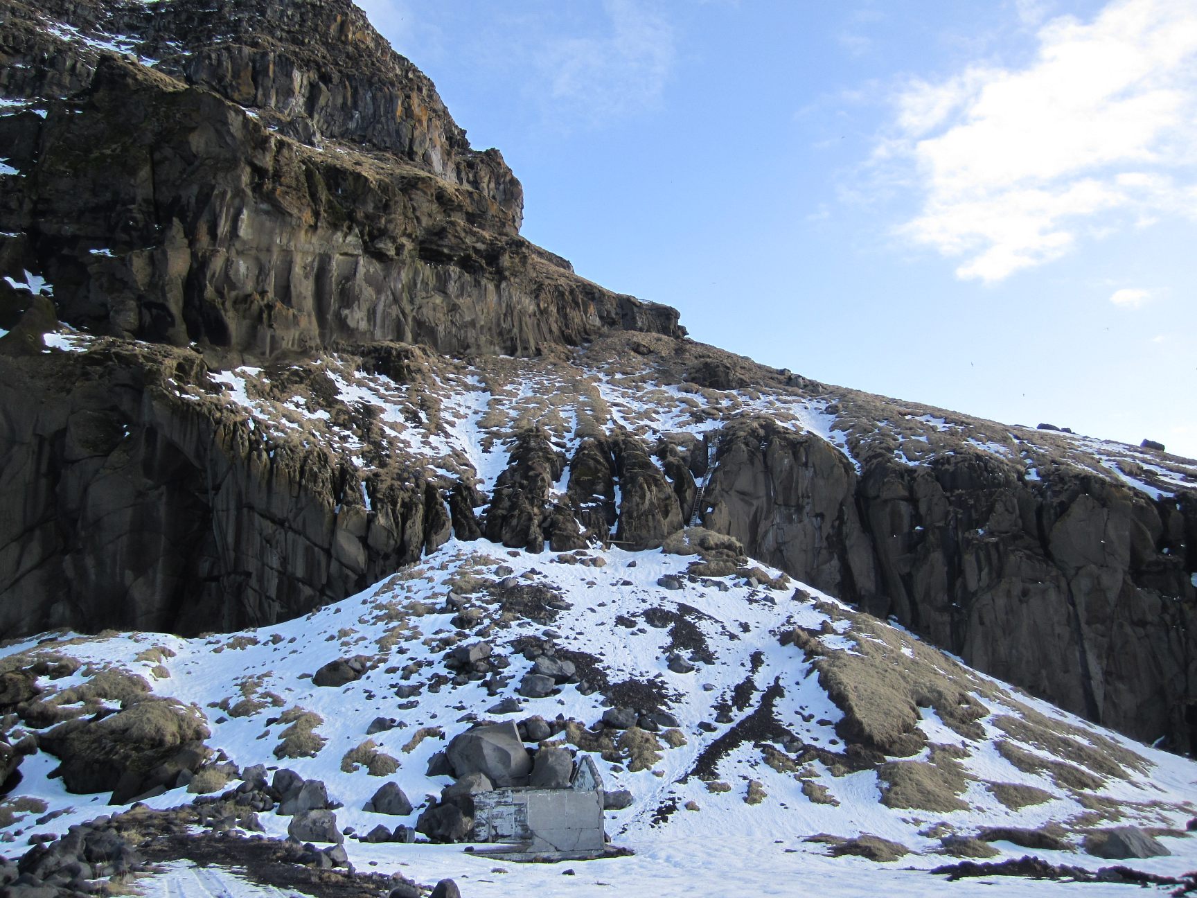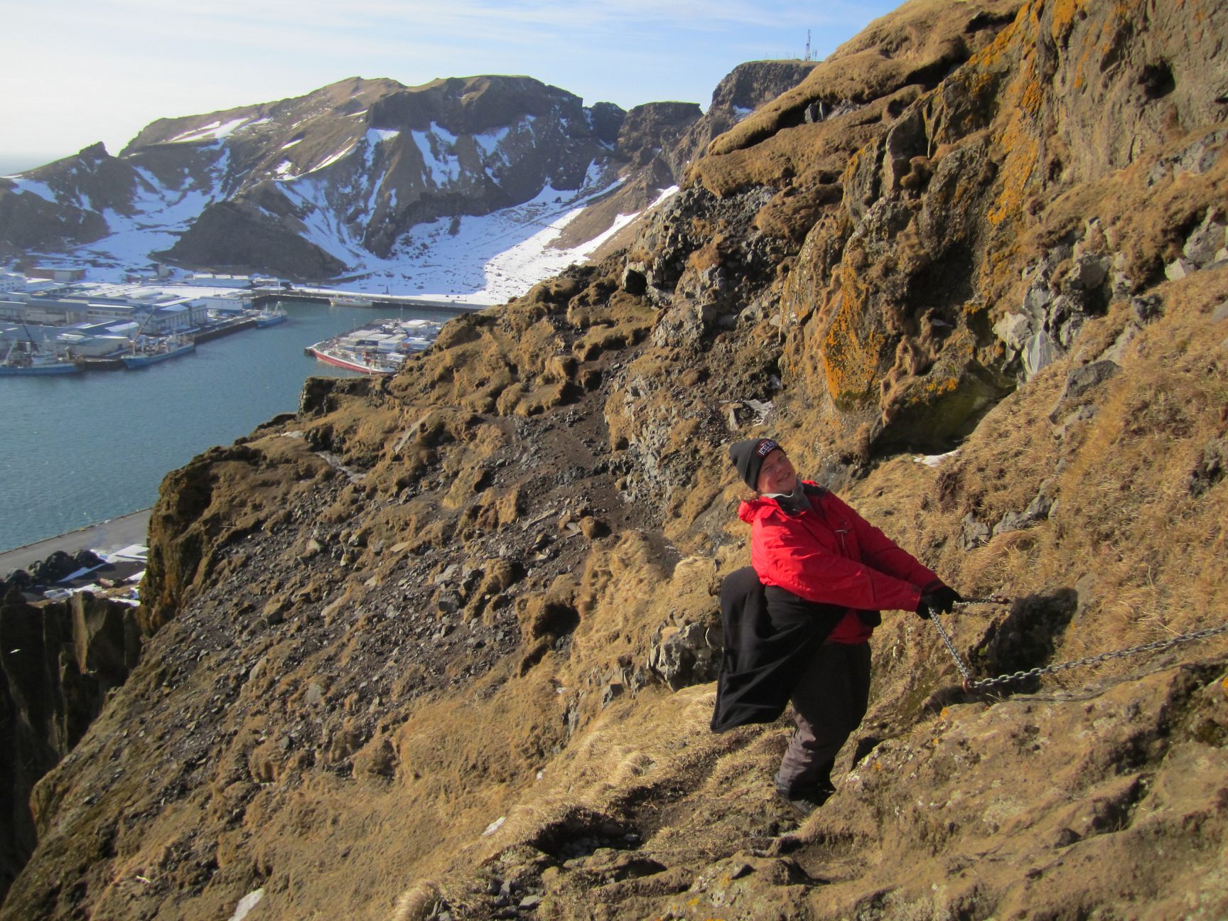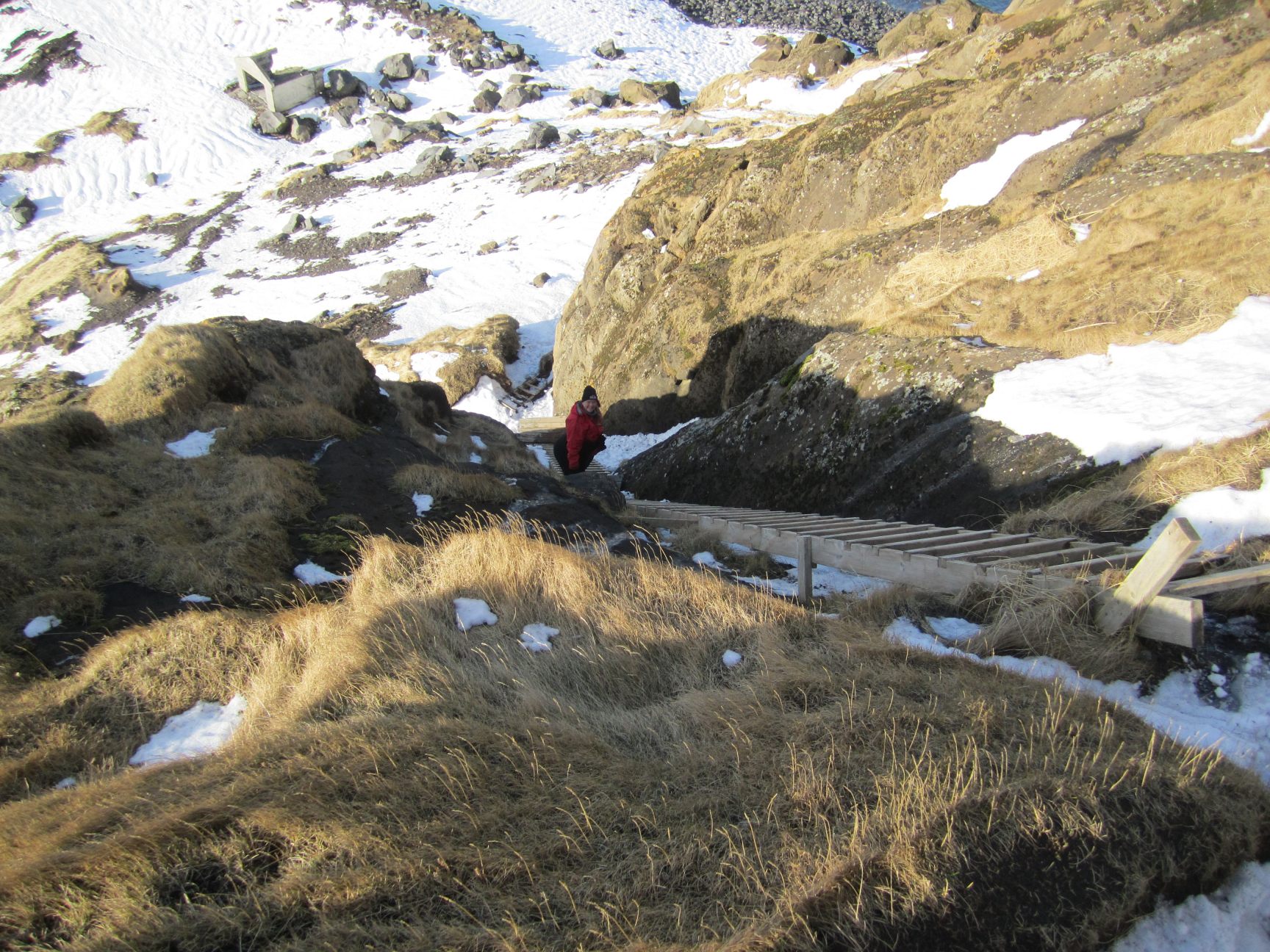 Vi (jeg) kunne ikke være bekjent av å ha vært på Vestmannaeyar, uten å ha besøkt det høyeste punktet, og særlig ikke når turistguiden sa det var grei sti til topps. At det også var satt opp stiger og kjetting på vanskelige punkter, betydde krydring av turopplevelsen for min del. Kona skjønte tidlig tegningen, og ga meg fri fart oppover, siden hun med rette antok at jeg med tiden ville komme ned samme vei igjen. Her var det ikke mulig å gå ned andre steder uten å rappellere. Sola var nå kommet skikkelig fram, og vinden sørget for ytterligere spenning – i alle fall i øvre deler av fjellet. Jeg kløv energisk opp flere passasjer med stiger i vestflanken av fjellet, og konstaterte at dette ellers ville vært avansert klatring så langt jeg kunne vurdere det. Snart kom jeg over i bratt gresskledt lende i sørvestflanken, med loddrett utsikt ned til fjæra og byen. Kjetting var satt opp på et par utsatte steder, og i de kraftige vindkastene benyttet jeg meg av hjelpen. Stien ble etter hvert fylt av snø og is, og det var ikke tilrådelig å fortsette på denne (fordi det var bratt og utsatt og sterk vind), så jeg gikk i stedet rett oppover på grasstustene og krysset utallige dyretråkk, antakelig etter sau. Et par ganger ble vindtrykket så stort at jeg kom i ubalanse, og måtte ned med en hånd eller to, og jeg var litt spent på hvor bratt og utsatt toppeggen egentlig var. Savnet stavene sterk nå! Så ble endelig spenningen avløst av lettelse; det var gressegg til topps, men den var ikke sylkvass, og stort sett snøfri også. Etter rundt tre kvarter kunne jeg skrive meg inn i toppboka på Heimaklettur, og nyte utsikten i solskinnet. Særlig var eggen videre imponerende, og neppe tilrådelig uten tau. Utsikten mot Islands sørkyst fascinerte, og vulkanen Hekla mente jeg også å kunne se der inne i horisonten. På veien ned valgte jeg for spenningens skyld å følge toppeggen mye lenger. Sterk vind, bratt og til tider smal egg med gress, gjorde meg faktisk litt skjelven, og jammen gled jeg ikke også! Det ble ikke store rutsjeturen, men klærne ble møkkete, og jeg fikk et øyeblikk opp pulsen betydelig. Bekymrede måker fra den bratte og snøkledte nordsiden av fjellet kom svært nær, og noen gjorde det jeg vil kalle advarende manøver mot meg; jeg var nok uønsket! Men jeg hadde ingen interesse av å utforske nordsida uten tau, og tok meg etter hvert ned gresslia til stien og stigene igjen. Heimaklettur anbefales varmt om en først har kommet seg ut på Heimaey! Gps-koordinater for toppen: 27 V 536844 7035940 Jeg målte den til 296 meter. Det går bilvei fram til foten av fjellet, og den ender i en stor parkeringsplass.