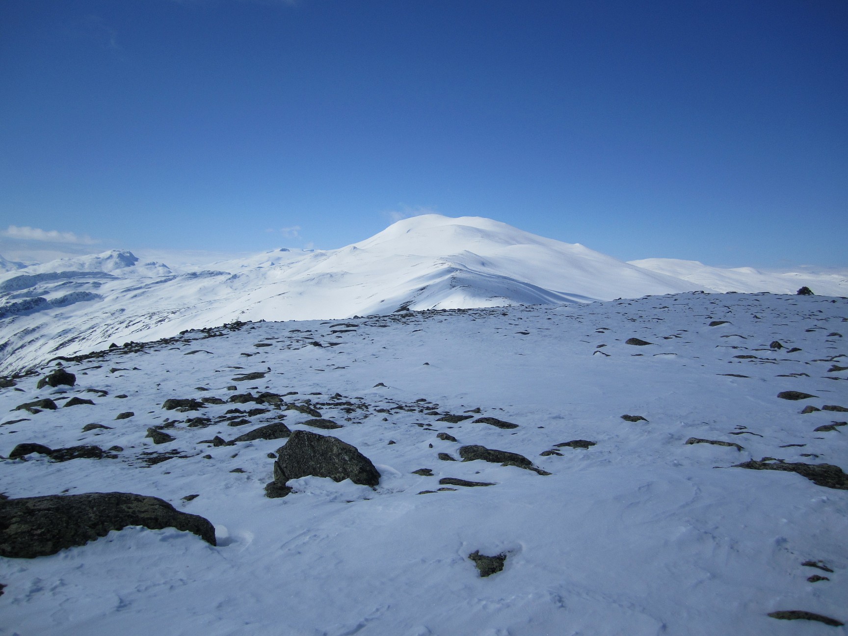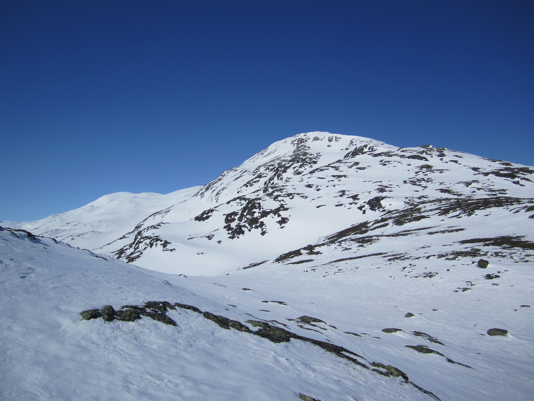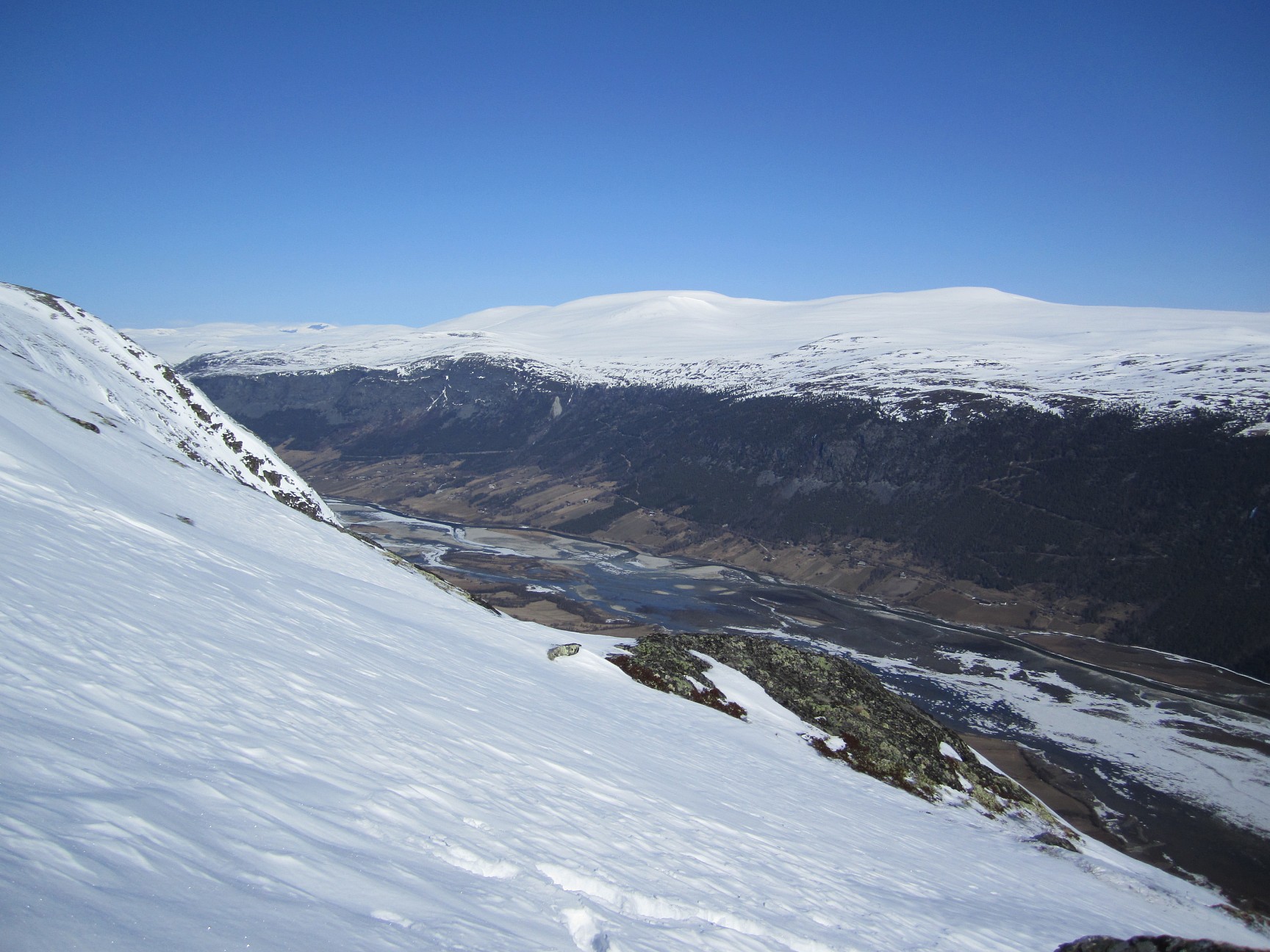 Hadde spart denne kommunetoppen til en dag med skikkelig vær, og fikk det! Avspaseringsdagen var perfekt "timet"! Gunstig føre gjorde turen til topps til en sann nytelse. Fulgte Sondres (500fjell) beskrivelse og tidsskjema, med mål om å slå ham, siden føret antakeligvis var mer gunstig for meg enn for ham! (Noen fordeler må vel en 39-åring få ha...) Skifeller er gunstig, da det er jevn stigning omtrent hele veien (800 hm). Og så er det jo bare å ta dem av og skli hele veien tilbake etterpå. Gikk jevnt og hardt, med mål om å klare toppen under 3 timer. Det gikk så vidt; 2:57. Tok det så rolig bortover viddene i en stor omvei tilbake, og koste meg i sola. De siste bakkene ned er ganske bratte i tett bjørkeskog, så jeg tok av skiene og ruslet et stykke i scootersporet. Totalt 5:30 på tur. Nå står bare Liers kommunetopp igjen i Buskerud fylke, men den får nok vente litt til, siden Jotunheimen er lett tilgjengelig nå, siden Flya nylig åpnet. -