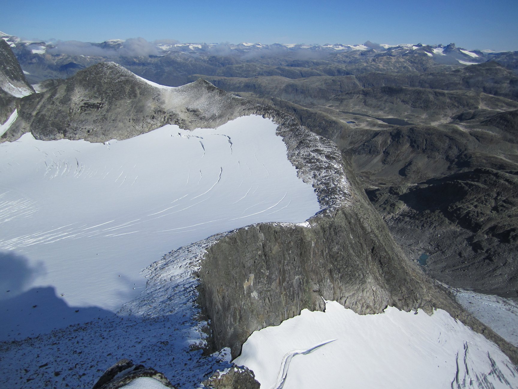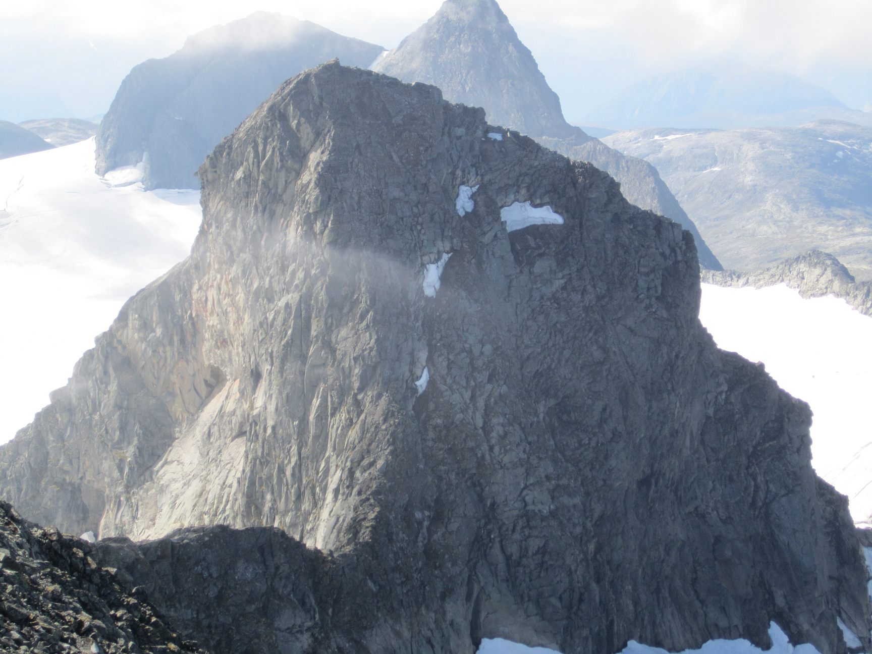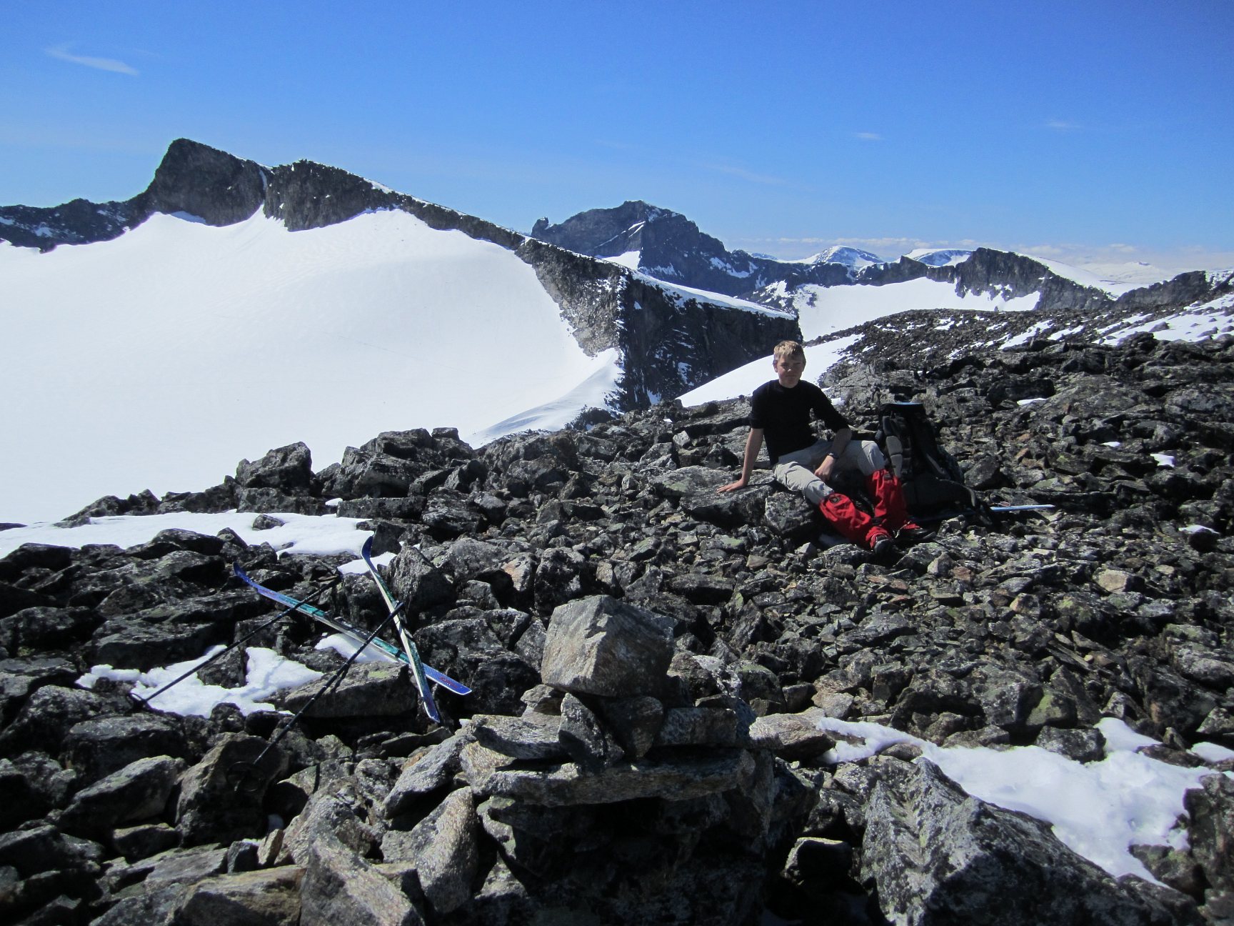 Noen ord fra drømmehelga i starten av juni: Overnatta i telt like ved Tindeveien, som de profilerer veien med mellom Turtagrø og Øvre Årdal. Sein start (kl 9), men vi hadde god tid siden egentlig bare Midtre Ringstind sto på programmet. Vi hadde med tau og litt sikringutstyr også, i tilfelle problemer. Med skia på sekken til fots innover i Ringsdalen, der vi møtte på snø etter ca 1 time. I sikk sakk mellom steiner, men etter hvert sammenhengende store flater. Vi fortsatte forbi det vi antar er normalveien opp, og inn til en bratt utløper av breen innerst i botnen. Her var det tydelig tråkk, og hardt, så stegjern og isøks var nyttig. Vi følte ikke behov for tau, men det gjorde en av de tre bergenserne som kom etter oss, og fikk fine opptråkka spor. På toppen av renna opp mot høyre, siden det var loddrett brefall til venstre. Da kom vi opp på breen på dette gps-punktet: 32 V 437206 6813290 på 1500 m – kan jo være kjekt å ha for andre også. Videre fulgte vi breen i nedkant nord for dagens mål, og kom så opp i skaret på drøyt 1700 m vest for Midtre Ringstind. Det lokket og dro opp mot Ringstind også, men der hadde vi vært før. 4 timer hadde vi brukt nå – neppe noen racertid akkurat. Vi spiste i godværet, og satte igjen ski, sekker og sikringsutstyr, da veien opp så ganske grei ut. Til topps på Midtre Det var ganske grei klyving opp, men vi kom nok bort i et punkt av grad 2, siden vi unngikk de harde snøfeltene og rennene som fortsatt lå her så tidlig på året. Skiskoa var dårlige å klatre med, så vi ville prøve snøen ned igjen. Herlig utsikt på toppen, og jeg rekognoserte litt mot øst. Vi klarte ikke å finne hvor eggen går ned på østsida av Midtre Ringstind, noe som ”bare skal være grad 2” – det virket atskillig verre ovenfra, kanskje pga snøfonna vi stod på? Vi fulgte snøen ned igjen, men det var litt i bratteste laget uten stegjern syntes vi. Far trampet gode hælspor til sønnen som kom bak, kan du si. Lenger nede var snøen ypperlig for enkel glissade, før det selvsagt ble råttent på enkelte steder. Nesten uhell her: Jeg tråkket i gjennom i fart og fikk leggen kilt mellom to steiner, og holdt på å ramle framover – det kunne blitt storknekk! Slapp unna med skrubbsår heldigvis. Nede ved skiene rundet vi toppen igjen på nordsida, høyere opp denne gangen, og med vel kraftig helling på breen, syntes vi – faktisk så bratt og hardt at vi ikke våget å snu, men snart flatet det ut, og vi svingte opp i skaret mellom Midtre og Østre for å rekognosere. Vi gikk uten tau på breen – men altså på ski hele tiden, og følte oss ganske trygge da. Det skal mer til med gjennomslag på ski enn til fots. På bandet syntes jeg fortsatt at østeggen opp til Midtre virket tøffere enn grad 2, men synet kan jo bedra? Seinere på sommeren er det jo også langt mindre snø. Vi kikket litt opp mot Østre også, men tomme for drikke og mat, følte vi for retur. Vi utnyttet høyden og tok en stor sving til høyre på breen nedover, og kom ned på ryggen der normalveien kommer opp. Denne bratte snøflanken var helt i oppløsning nå, og da vi fant et slyngebånd for rappellfeste var valget enkelt. Gps for dette punktet: 32 V 437175 6813811 på 1532 m. Kjekt å ha? Det var første gang vi rappellerte med ski på sekken – og moro å få litt luft under vingene igjen. Nede på snøen var det pill råttent nå, og om å gjøre å få på seg skia så fort som mulig. Og når snøen seinere tok slutt var det egentlig bare deilig å gå litt på bar mark også tilbake til veien. 10 timers variert kosetur! Dagen etter Etter gårsdagens tur på Midtre Ringstind var junior innstilt på noe enkelt, og siden han ikke hadde vært på Veslepiggen var planen klar: Ta skiheisen opp fra Juvasshytta og plukke Kjelhøi og Galdhøi på ski, og så gå ned til Løyfti og opp på Veslepiggen. Det gikk utmerket på 3,5 timer totalt. Vi var overrasket over at heisen tok deg helt opp på 2196 meter. Gps: 32 V 464931 6836738. Herfra var det 5 min på ski bort til Kjelhøi, som gjør denne toppen til landets klart enkleste 2k-topp på ski. Vi møtte to karer på vei ned Løyfti, som fortalte fra gårsdagens tur på Storgrovtind-massivet, og satte meg kraftig på ideen om å ta denne som vårskitur til neste år – høyt prioritert skal den bli. -