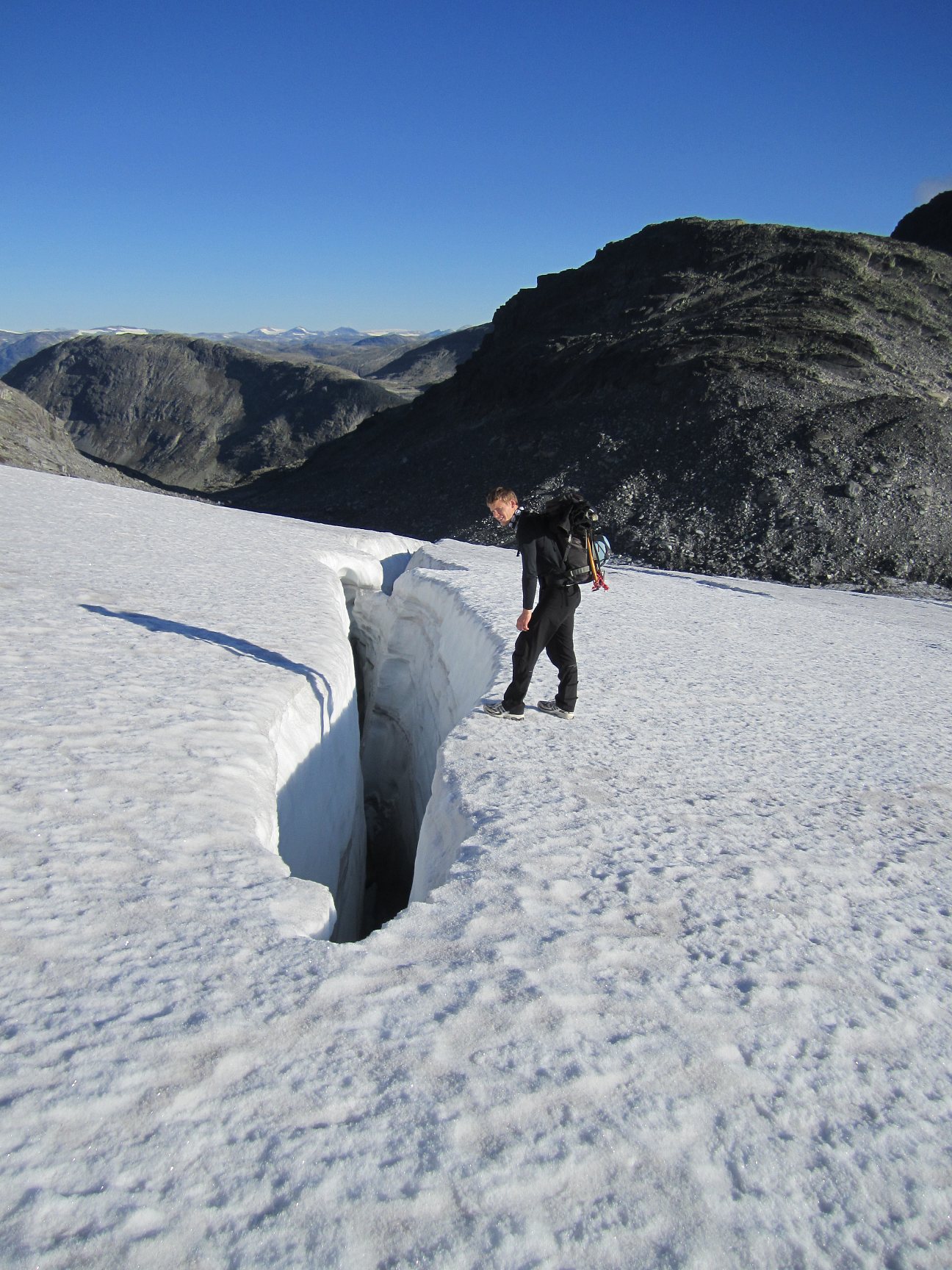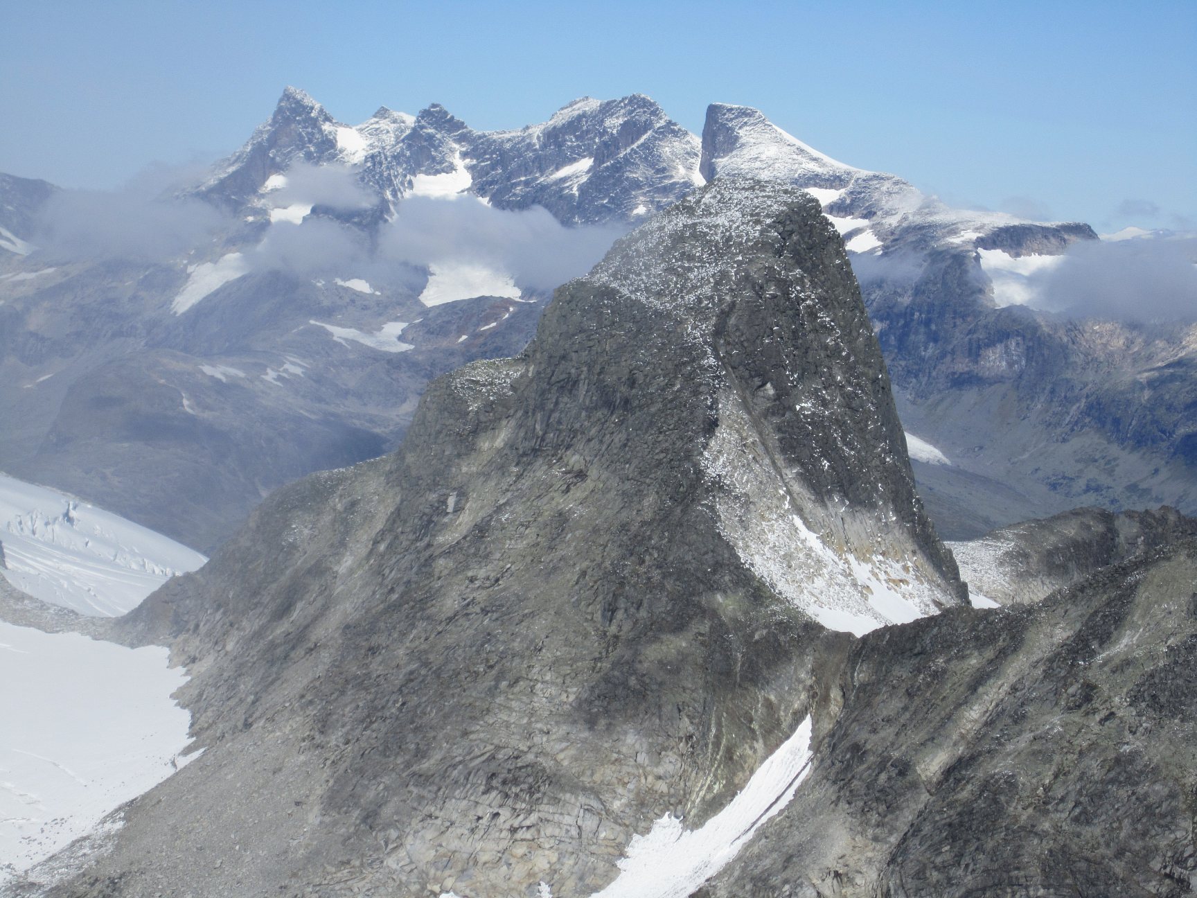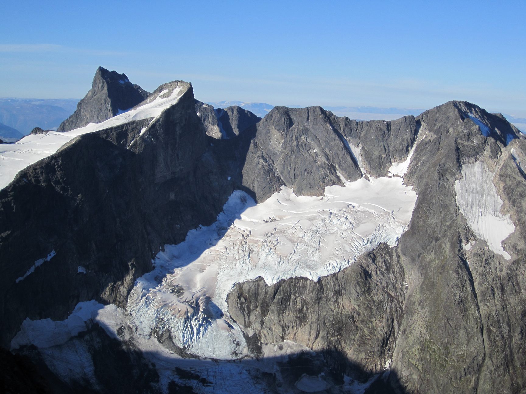 Noen ord fra drømmehelga i starten av juni: Overnatta i telt like ved Tindeveien, som de profilerer veien med mellom Turtagrø og Øvre Årdal. Sein start (kl 9), men vi hadde god tid siden egentlig bare Midtre Ringstind sto på programmet. Vi hadde med tau og litt sikringutstyr også, i tilfelle problemer. Med skia på sekken til fots innover i Ringsdalen, der vi møtte på snø etter ca 1 time. I sikk sakk mellom steiner, men etter hvert sammenhengende store flater. Vi fortsatte forbi det vi antar er normalveien opp, og inn til en bratt utløper av breen innerst i botnen. Her var det tydelig tråkk, og hardt, så stegjern og isøks var nyttig. Vi følte ikke behov for tau, men det gjorde en av de tre bergenserne som kom etter oss, og fikk fine opptråkka spor. På toppen av renna opp mot høyre, siden det var loddrett brefall til venstre. Da kom vi opp på breen på dette gps-punktet: 32 V 437206 6813290 på 1500 m – kan jo være kjekt å ha for andre også. Videre fulgte vi breen i nedkant nord for dagens mål, og kom så opp i skaret på drøyt 1700 m vest for Midtre Ringstind. Det lokket og dro opp mot Ringstind også, men der hadde vi vært før. 4 timer hadde vi brukt nå – neppe noen racertid akkurat. Vi spiste i godværet, og satte igjen ski, sekker og sikringsutstyr, da veien opp så ganske grei ut. Til topps på Midtre Det var ganske grei klyving opp, men vi kom nok bort i et punkt av grad 2, siden vi unngikk de harde snøfeltene og rennene som fortsatt lå her så tidlig på året. Skiskoa var dårlige å klatre med, så vi ville prøve snøen ned igjen. Herlig utsikt på toppen, og jeg rekognoserte litt mot øst. Vi klarte ikke å finne hvor eggen går ned på østsida av Midtre Ringstind, noe som ”bare skal være grad 2” – det virket atskillig verre ovenfra, kanskje pga snøfonna vi stod på? Vi fulgte snøen ned igjen, men det var litt i bratteste laget uten stegjern syntes vi. Far trampet gode hælspor til sønnen som kom bak, kan du si. Lenger nede var snøen ypperlig for enkel glissade, før det selvsagt ble råttent på enkelte steder. Nesten uhell her: Jeg tråkket i gjennom i fart og fikk leggen kilt mellom to steiner, og holdt på å ramle framover – det kunne blitt storknekk! Slapp unna med skrubbsår heldigvis. Nede ved skiene rundet vi toppen igjen på nordsida, høyere opp denne gangen, og med vel kraftig helling på breen, syntes vi – faktisk så bratt og hardt at vi ikke våget å snu, men snart flatet det ut, og vi svingte opp i skaret mellom Midtre og Østre for å rekognosere. Vi gikk uten tau på breen – men altså på ski hele tiden, og følte oss ganske trygge da. Det skal mer til med gjennomslag på ski enn til fots. På bandet syntes jeg fortsatt at østeggen opp til Midtre virket tøffere enn grad 2, men synet kan jo bedra? Seinere på sommeren er det jo også langt mindre snø. Vi kikket litt opp mot Østre også, men tomme for drikke og mat, følte vi for retur. Vi utnyttet høyden og tok en stor sving til høyre på breen nedover, og kom ned på ryggen der normalveien kommer opp. Denne bratte snøflanken var helt i oppløsning nå, og da vi fant et slyngebånd for rappellfeste var valget enkelt. Gps for dette punktet: 32 V 437175 6813811 på 1532 m. Kjekt å ha? Det var første gang vi rappellerte med ski på sekken – og moro å få litt luft under vingene igjen. Nede på snøen var det pill råttent nå, og om å gjøre å få på seg skia så fort som mulig. Og når snøen seinere tok slutt var det egentlig bare deilig å gå litt på bar mark også tilbake til veien. 10 timers variert kosetur! Dagen etter Etter gårsdagens tur på Midtre Ringstind var junior innstilt på noe enkelt, og siden han ikke hadde vært på Veslepiggen var planen klar: Ta skiheisen opp fra Juvasshytta og plukke Kjelhøi og Galdhøi på ski, og så gå ned til Løyfti og opp på Veslepiggen. Det gikk utmerket på 3,5 timer totalt. Vi var overrasket over at heisen tok deg helt opp på 2196 meter. Gps: 32 V 464931 6836738. Herfra var det 5 min på ski bort til Kjelhøi, som gjør denne toppen til landets klart enkleste 2k-topp på ski. Vi møtte to karer på vei ned Løyfti, som fortalte fra gårsdagens tur på Storgrovtind-massivet, og satte meg kraftig på ideen om å ta denne som vårskitur til neste år – høyt prioritert skal den bli. -
