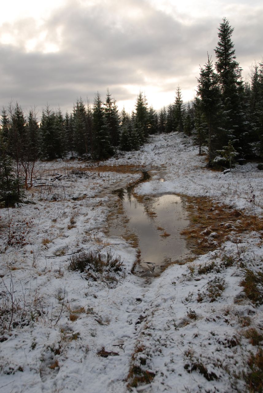 I år virke høsten i Trøndelag uendelig lang. Regn de fleste dagan - og på toppen hevde meteorologan at nedbøren i oktober ligg under normalen! For min del kunna det godt ha regna skikkelig når det først regne, men "litt" hver eneste dag Itj e det skiføre, og itj friste det te å gå en tur te topps - e visst litt deprimert. Men i dag va det meldt oppholdsvær, og merkelig nok - det stemt! Regna med at de kunn vær temmelig fuktig oppi marka, men tur mått det bli. Nye fjellsko va innkjøpt siste uke - Crispi Besseggen på tilbud - og no passa det bra å gå dæm inn. Har skreve mang turrapporta fra Strindamarka, så det her må heller bli en depresjonsrenselse. Strindamarka ligg nærmest, og synes det e greit å start heimefra på beina og uten co2-utslipp, så Strindamarka vart det. Det vist sæ fort at det va bløtt og gjørmat i marka, den siste kornåkeren før skogen sto under vann, og det gjorde stort sett stien også. Men etter hvert som svetten kom, forsvant litt av depresjonen - va itj så ille å vær utendørs læll! For å gjør en lang historie kort: Etter nesten 4 tima og 15,6 km sto æ i garasjen og spylt skon rein for gjørme og konstatert at dongeribukse itj va nå ideelt turplagg. Men smilet lå om munnen og kor i all verden hadd det blitt av depresjonen - borte som dugg for sol, selv om det itj va stort av den sorten(sol altså) mens æ va ut på tur. Og best av alt - æ va tørr på fotan te tross for all timan i vatn og gjørme Legg ved nå bilda så de kan sjå koss det va oppi marka. Flere bilda på: http://andnorm.no/Markaturer