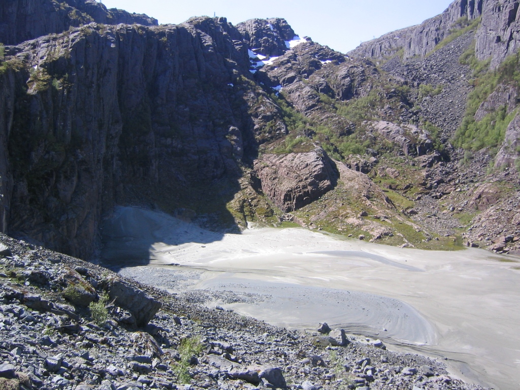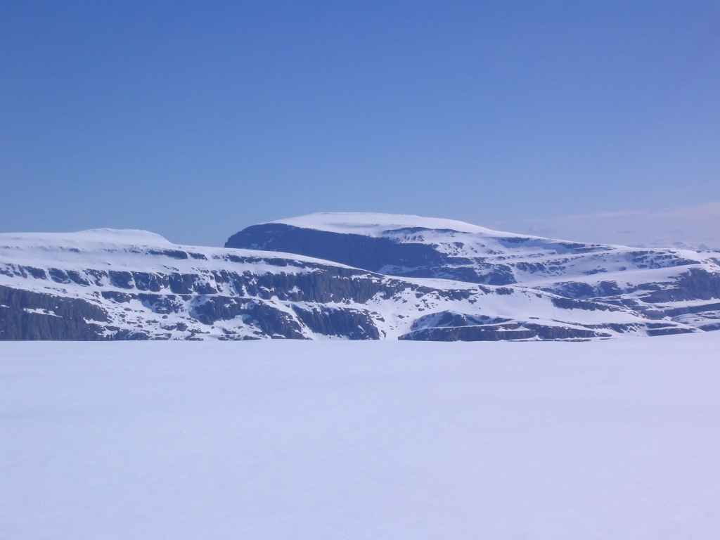 Det ser bratt ut på kartet å gå fra øst. I disse tider går det hele tiden små snøras i bratte fjellsider med svaberg så å gå opp fra øst ville jeg ventet med til lenger ut på sommeren. Det var i overkant med snø for fottur, men det gikk greit siden fonnene var så faste i fisken etter alt det varme været den siste tiden. For en måned siden hadde jeg 14 S&F-topper igjen, 9 er unnagjort de siste ukene, så nå er det bare 5 igjen. Er på jobb på Sunnmøre denne uken og om værlaget er OK kan det være jeg stikker innom en topp eller 2 på vei hjem igjen, ellers blir det ikke flere turer opp hit før det blir en godværsperiode på disse kanter av landet i juli.