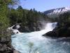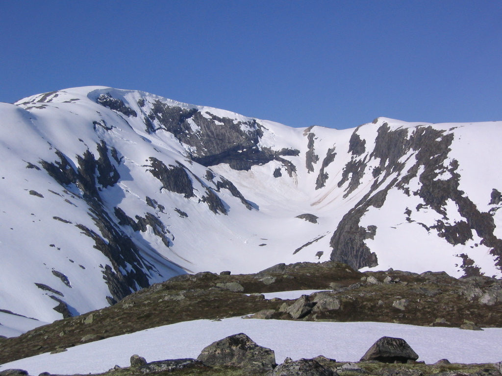 Jeg kjørt innover Jordalen på kvelden før. Veien opp er en attraksjon i seg selv, der den går gjennom tuneller og halvtuneller ved siden av et juv som er helt ufremkommelig. Ikke så rart at denne frodige dalen tilhørte Fresvik tidligere, ettersom adkomsten over fjellet var eneste mulighet da. Jeg betalte pliktskyldigst mine bompenger for å kjøre inn den innerste setra, men der ble jeg snytt. Etter kun kort kjøring lå en diger snøfonn tvers over veien og dett var dett. Velvel – det var en fin kveld, så jeg bare slanget meg i gresset og krøp i posen under åpen himmel etter hvert. Fjellbonden hadde tydeligvis fått dårlig samvittighet, for etter solnedgang dukket han opp med traktor og fjernet fonna. Nest morgen kjørte jeg lykkelig innover dalen, men kom fortsatt ikke helt frem. Litt sykling med ski på stanga frem til det var helt håpløst med snø gjorde nytten. Deretter var det skitur oppver mot Rjupeskard, før jeg svingte opp på breen 1648 moh. Nok snø for en god stund her enda. Fresvikbreen kan se ut som den har minket i størrelse sammenlignet med kartet, og en knaus nordvest for breen(1625 moh) vil muligens overta som kommunetopp for Vik i Sogn om breen smelter ned noen meter til. Turen gikk så videre gjennom en del lange tuneller til Aurland. Blåskavlen på 1809 meter over havet skulle få avslutte min lille Vestlandsturne. Jeg tråklet meg opp med bil fra Aurland til om lag 1300 moh og fant en fin rygg opp til toppen. Her var jo faktisk folk! Det er tydeligvis flere smågale folk som går på ski i stedet for å dra på stranda når sommeren er som varmest! Deilig avslappende nedkjøring igjen og kjøring tilbake mot Østlandet på kvelden. Litt merkelig å komme hjem til 32 varmegrader og ta skiene ut av bilen. Et lite bad gjorde også godt!
