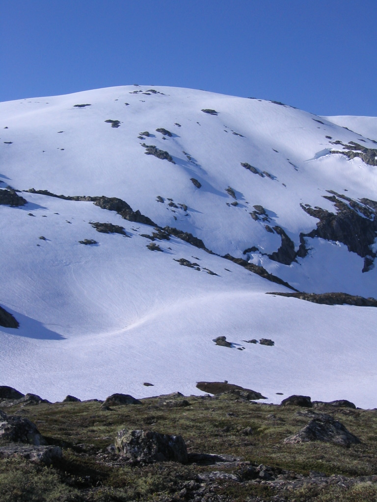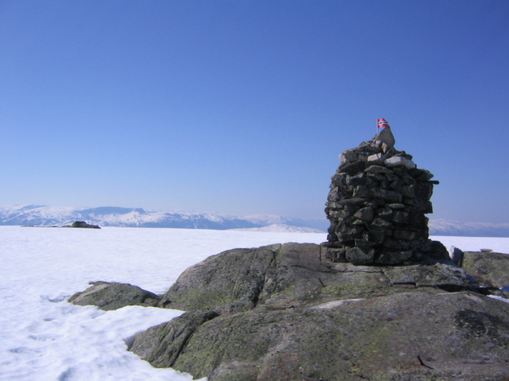 Det var blitt sent og langt kvelden før, og det var herlig å sove en natt ute i lyngen oppe i Reimegrend. Jeg lette litt for å finne stien som krysset jernbanen og videre ned til broen over elven, men fant da frem i sommernatten til slutt. Natten ble likevel ikke helt rolig, togene lister seg ikke akkurat forbi en sovende fjellvandrer. Jeg la ut fra Reimegrend etter nøye vurderinger av utstyr. Man starter på ca 450 moh og opp til høyde 1073 moh så det stort sett ut til å være bart. Jeg valgte derfor bort skiene og ruslet opp til fots. Over hovedelven var det bro, men av kartet kunne jeg se at jeg måtte krysse en sideelv på et eller annet sted. Heldigvis var det bro her også, for side-eleven var også flomdiger i varmen. Ski kunne ha vært greit på det øvre partiet, men jeg tror likevel det var et godt valg. Her er jeg midt på det nedbørrike Vestlandet, men ikke en sky å se i noen retning. Heilt fantastisk! Dobbel bonus ble det også for denne toppen er høyest i både Voss og Granvin! Grunnet mange lange turer dagen før ble det med den ene toppen denne dagen.