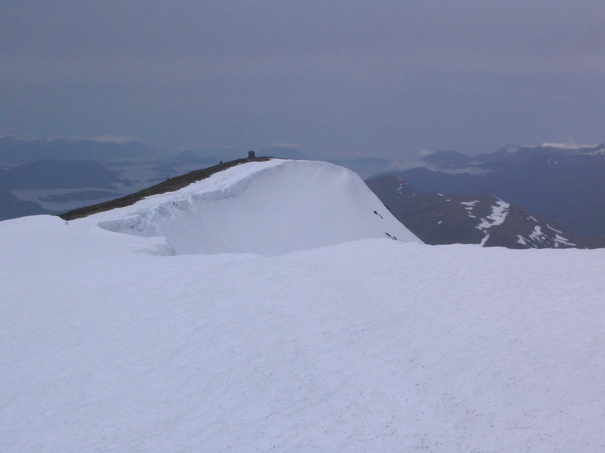 Det som er litt spesielt med Frostatinden er at varden ble bygget opp fra grunnen av for 2-3 år siden. Jeg traff en kar på toppen som hadde vært med på arbeidet. Den gamle varden var totalt nedfallen og 12 mann dro til topps med spett og hakke for å bygge ny varde. De holdt på i 4 timer, så varden er et godt ukesverk. Når man først setter igang med en slikt arbeide, burde man jo bygge varden på toppen ! Nå skal det også sies at der varden stod var det bart, mens på det høyeste punktet lå det fortsatt en stor fonn. Vedlegger bilde tatt fra det høyeste punktet ned mot varden fra midten av juni i fjor.