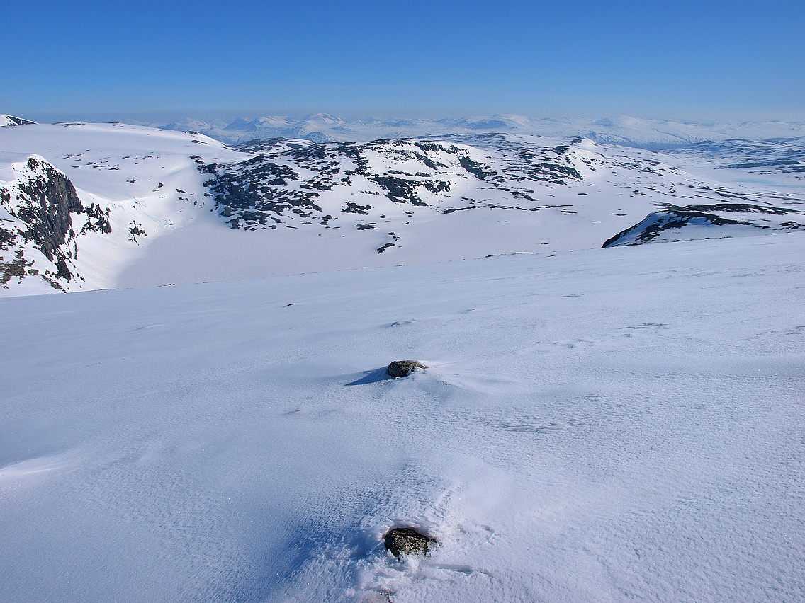 Hehe, skjønte du var sliten da tekstmeldinga tikket inn etter turen. Men det har du jaggu grunn til også! Med en sånn sekk og et sånt antall høydemeter, er det en prestasjon å gjennomføre! Men på en vårtur som dette finner du alltids rennende vann til langt opp i fjellet. Så å fylle alle tanker kan jo utstå de første 1000 hm? Også rimelig ulikt deg å bli så kort ved vardene. Du har jo i sannhet evnen til virkelig å suge inn og nyte inntrykkene der oppe, for så å skatte dem djupt i sinnet resten av livet. Viser ekte naturglede det. Og er man alene, så forsterkes det hele 3x. Men her du har jo bildene også da. Må si du har fått "schwung" på dette nå Øyvind, ikke bare gode opptak, men flott presentasjon også. Og her viser du et utvalg som kompletterer teksten på en ypperlig måte, og derved gjør rapporten enda mer helstøpt. Gleder meg til disse gromtoppene. De står vel på programmet denne sesongen, og dette eglet meg opp skikkelig! Sjøl synes jeg bre er spennende, så en omgåelse av denne blir neppe tilfelle. Kan tvert imot foretrekkes. Men sola har jo ennå ikke snudd Øyvind, så vi har stadig muligheter. Vi har jo snakket om spennende ting under tregrensa også vi..? Takker for en original og spenstig rapport, med veivalg og turmål man ikke leser så altfor ofte om. Og heldigvis så er det oftest med slike "jævlige" turer som med militæret - det er artigst etterpå! Så nyt lavlands- og latmannslivet i Drammensmarka nå - ta et bad i bekken, og drikk hølen tom! Hørs! - Snowman -