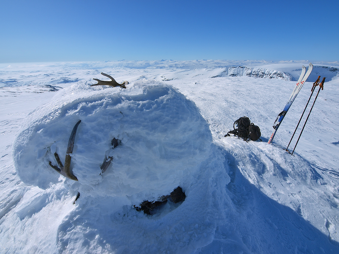 Maimorgen Ute på de lett rimhvite slåttene i Sjåk sto elgene temmelig så tett, da jeg fór forbi der i demringslyset v/ 04-tida. Noen sto på kne lik giraffer for å nå ned til beitet, og også en 3-4 hjort ble observert like ved vegen, deriblant en flott kronhjort også. Jeg er snart framme på Billingen etter nær 4t kjøring hjemmefra. Målet mitt er Gråhø/2014 i Reinheimen, et fjell jeg har myst langsynt på over flere år nå, men alltid fra himmelrendene lenger sør. Nå skulle jeg endelig prøve å nå den, med planlagt skimarsj inn vestfra Billingen, en ganske dryg tur på snaue 35 km t/r og ca. 1300hm, hvorav de første 800hm er fordelt på de første 12 km av anmarsjen, en relativt snill åpning, hvis man ser bort fra selve lia opp fra dalen. Jeg forlater bilen kl. 04:30, og krysser Frøysa på brua over til noen hytter like ved. Deretter går jeg et par hundre meter på bena langs noe som likner et gammelt skispor, opp langs Frøysas sørside. Men skaren er meget tynn, og jeg detter jamt igjennom, så jeg setter på skia og rusler på et smalt snøleie langs elva oppetter lia. Det er digre smeltegroper rundt enhver trestamme, så jeg blir gående å vagle på smale snørygger i krik og krok oppover fjellfuruskogen. Med ski på bena føtter jeg meg over en og annen bar lyngrabbe også. Skogen her er spesiell, med særdeles grov og gammel fjellfuru, med lite undervegetasjon i et åpent og trivelig skogslende. Ordentlig praktskog, der enkelte tørrkragger er intenst grønngule av ulvelav, denne giftige laven som i gamle dager ble brukt som "rottegift" mot ulv i utlagte åter. Elva sjoer friskt i et ganske skarpskåret lite juv på min venstre side, og et sted oppunder snaufjellet er jeg utpå kanten og kikker nedi en gufsen rå fossehøl, der vanngyvet kvervler i tynne slør oppetter de våte kalde bergveggene, selv om vassføringen ennå ikke er allverden, enda midten av mai snart er nådd. Jeg vinner fort høgde, og dalsida er overraskende og gledelig kort . Etter et par bratte snøbakker opp og vekk fra elva, flater terrenget litt ut, og snart er det kun enkelte stenrabber som bryter snøflatene. Bak meg har fjelltoppene vest for Ottadalen fått et blekrosa skjær, og foran meg løfter en gulhvit glorie seg stadig høgere på himmelen. Like før soloppgang nå. Alt er stille - ikke et vindpust. Kun et vágt sus høres nede fra elvedalen ennå, og et følge på tre snøspurv sirrer nordover i morralyset foran meg, og jeg kan høre deres småpludrende plystring lenge etter at jeg mister dem av syne. Føret er fast og fint, skia setter nesten ikke spor i noe som likner et tynt grovkornet rimlag oppå skaresnøen. Jeg strener radig innover, vil gjerne litt høgere opp for å se soloppgangen inne på fjellet. Kl. 05:10 møter jeg sola idet jeg skjærer over en lav bakkekam . Jeg har gått ca. 4 km, og stopper da for å ta et par bilder av fjella bak meg. Særlig Tverrådalskyrkja i sørvest og Skridalaupen vestafor ser fløyelsmjuke og drømmende ut i den pastellfargede vårmorgenen. Det anger av snø og skare, og idet sola bryter horisonten, puster en mild føhnvind fra vest duften av bar og røsslyng opp fra skogsliene ute i dalsida. Jeg formelig drikker lufta der jeg står, og nyter stunden andektig i lange drag . Ei heilo kommer plystrende inne fra fjellviddene østafor, og flyr medsols rett over hodet på meg, med vingene forgyllet av det flate sollyset. Ellers er alt preget av fullkommen ro. Tilfreds tar jeg en fem-minutter, drikker litt, og spiser en banan. Så bestemmer jeg meg for å ta av fellene, og legger på litt universalklister istedet. Tuba er kald og hard, og de kalde skisålene gjør ikke utsmurningen enklere. Jeg setter derfor skia ned i snøen, med svartsåla vendt mot sola. Et par minutter senere går det da greit å gni ut klisteret. Så er det bare å pile videre. Vegen er lang, men dagen er særdeles ung... (i motsetning til meg!) Kanonføre Idet jeg tar iveg på de nysmurte skia, utbryter jeg "Oi!" for meg selv. Skia føles rent vektløse, og jeg skyter fart som en hare idet jeg tar første stavtaket. Man er jo vant til å gå på feller for det meste, med glid som uhøvlet plank, men dette var jo rene fryden! Skia sitter som et skudd også, og jeg farer innover med ren diagonalgang, til og med med en ordentlig glifase i hvert et steg! Uvant må jeg si, og jeg føler meg pigg og rent opprømt der jeg stiler innetter det bølgende hvite teppet mot morrasola . Sola mjukner fort det lille isete rimlaget også, så klisteret slites ikke nevneverdig heller, og jeg slipper å legge på noe mer av dette. Smurningen holdt hele dagen faktisk. Jeg vinner fort distanse innover. Stopper av og til og gyner, lyer på fjellstilla, værer lik en rev der jeg står, før jeg atter fyker videre med sansene vidåpne for alle inntrykk. Rart med det, når man ikke blir så forbanna sliten opp motene, så får man med seg så mye mye mer av opplevelsen. Et sted stopper jeg og stirrer mistenksomt på en oppreist lys "stabbe" på en barrabbe 500m nordafor meg. Jeg tenker snøugle, en fugl som i tiår har toppet ønskelista mi nå. Skal man kanskje få oppleve den én gang i livet, kan dette absolutt være plassen. Jeg holder stadig øye med stabben, mens jeg skjærer halvt skråss imot den over flatene. Men akk - idet stabben kommer foran en bakenforliggende større barflekk, får den visuelt en mye bedre kontrast, og jeg ser til min skuffelse at det bare er en lys og slank oppreist sten . Men men, ikke mye å klage over det egentlig, på en perfekt dag som denne! Jeg runder østover forbi en liten spiss kolle 1 km nord for vann/1495, nordvest for Stamåhjulet/1821. Like etter ser jeg inn Skarvedalen, og fjernt der øst ruver endelig den helkvite kuppelen på selve Gråhø/2014. Den ser nær ut, men Gråhø er diger og daldråget langdrygt, så det er lenger inn dit enn førsteinntrykket tilsier. Men skia sklir godt, formen er uvanlig lett, og jeg spiser meg sikkert innover 