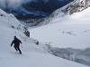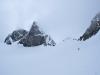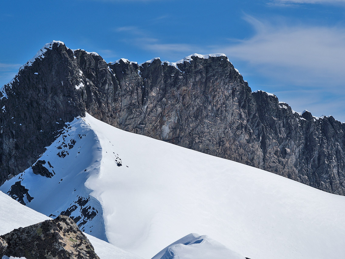 Legger også inn et større oversiktsbilde av sørflanken på Torfinnstindene, tatt fra M/S Bitihorn ute på Bygdin, (beklager kvaliteten, kun et utsnitt av skyggelagt fjell dette). Maksimer størrelsen i nettleseren for økt lesbarhet. Her synes de nedre delene av rennene, hvor særlig den vestre (venstre) kanskje kan synes litt vanskelig. Vil tro at den høyre renna til skaret Østre/Midtre er den enkleste, men man vet jo ikke hvordan det ser ut på mellomstrekket bak den "fortoppen" som stikker opp til høyre for snøflekken i øvre del av renna. Men det skulle undre meg om ikke den høyre renna på bildet (altså delvis skjult bak "fortoppen") skulle være minst like farbar som den øverste delen (eller som den mye brukte østrenna for den del). Forutsetningen er man klarer å følge renna så langt den går, og der oppe krysse over den ryggen som "fortoppen" danner, for så endelig å havne i den helt øverste delen av renna som bildet til Nils viser. Men kanskje kan dette være vanskelig, idet øvre del av denne høyre renna ser styggbratt ut, jfr. flybildet til Stig: https://www.fjellforum.no/oldLinkConverter.php?oldAttach=5404 Alternativt kan ryggen krysses lenger ned før "fortoppen", og over i den venstre renna ca. 2/3 oppe... Stemmer det Nils, de trakk litt venstre og opp til Midtre, uten å gå helt opp til skaret og egga. Antar de dreide av ca. 60-80m før skaret... -