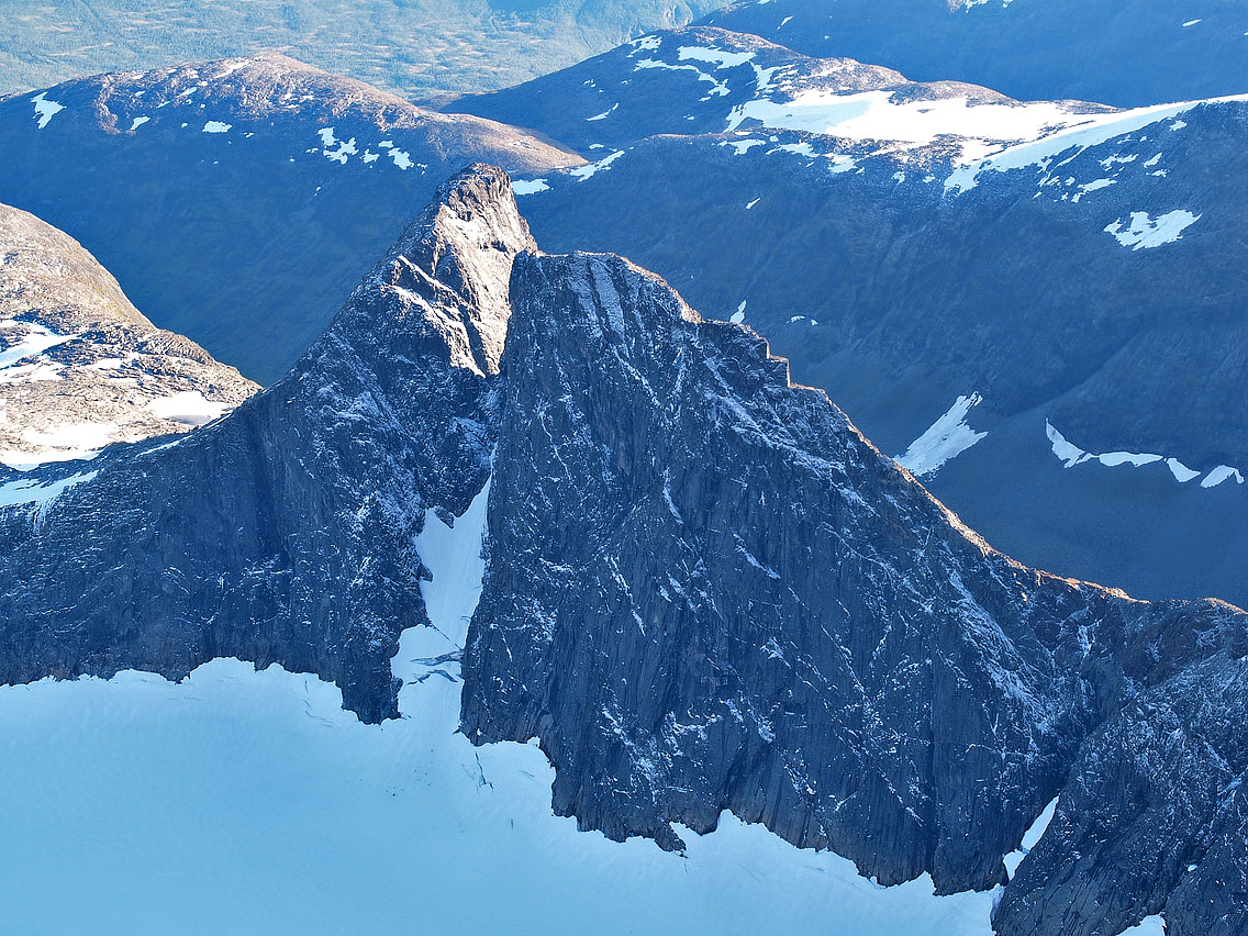 Har ikke peiling, men vedlegger et par bilder som kanskje kan si deg noe, slik disse så ut fra varden på Gjertvasstind 10.09.2005. Maksimer bidet Mannen.jpg i browseren, så kanskje et mulig veivalg lar seg vurdere derfra...