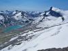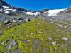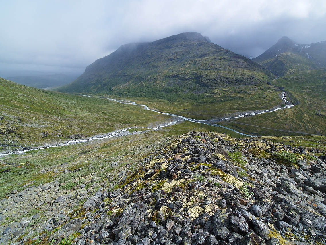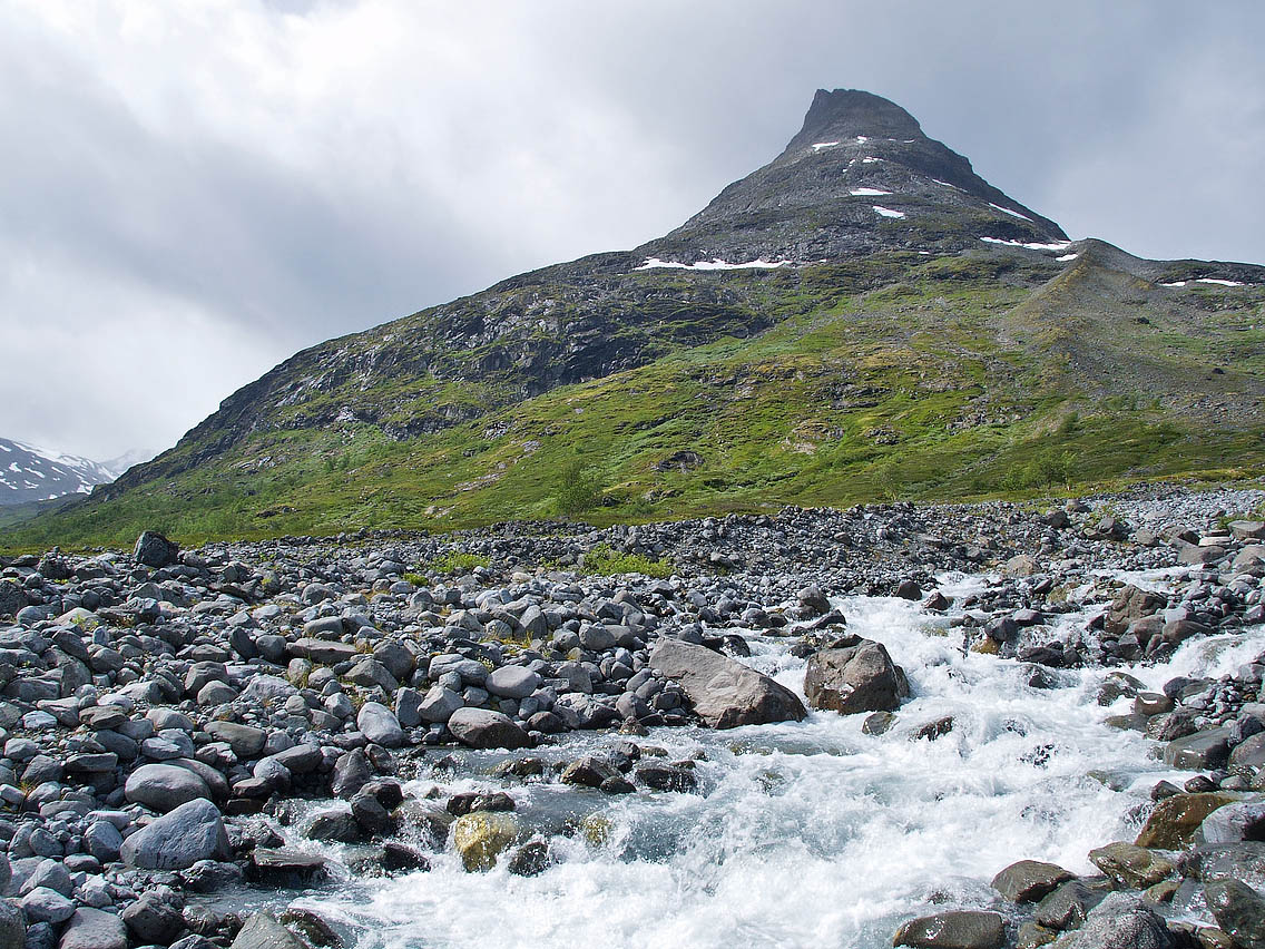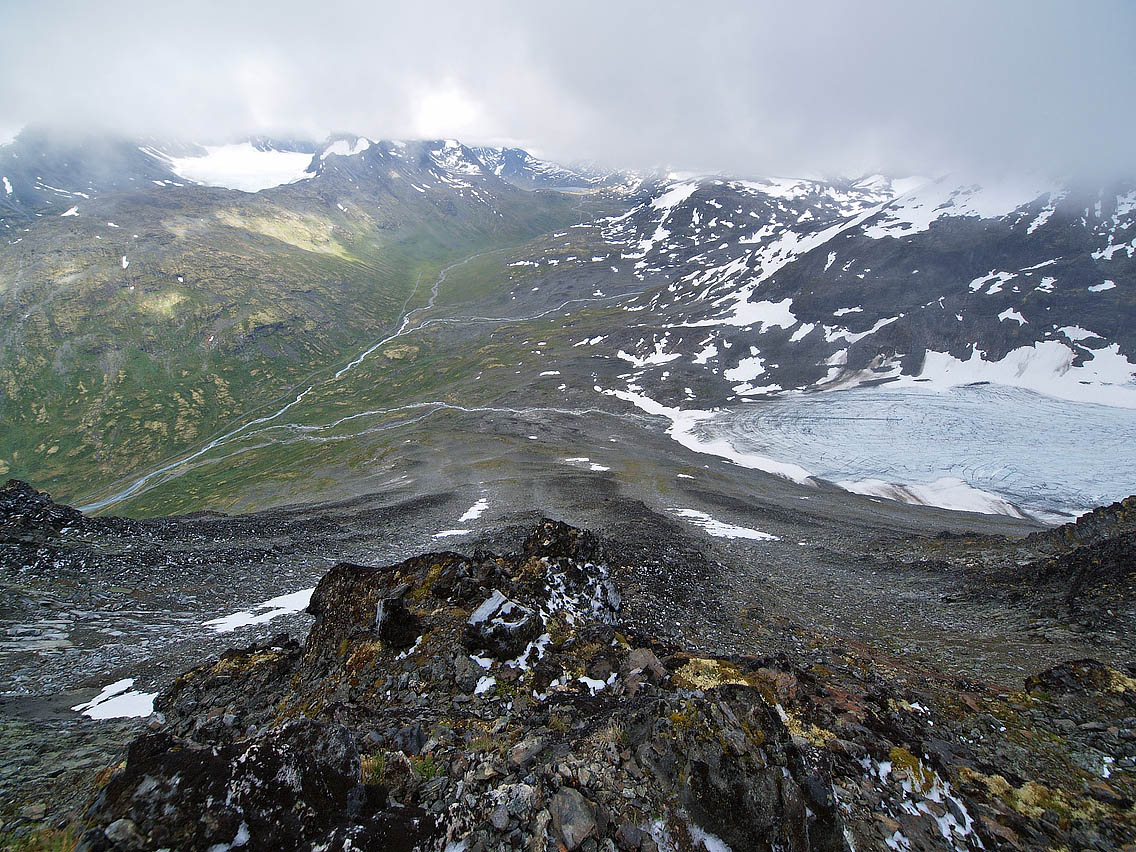 God tid Etter gårsdagens våte og kalde tåketur på Skagsnebbet/2003, håpet jeg at været hadde bedret seg idet jeg våknet i bilen i Leirdalen v/ 0730-tida. Jeg stakk et bustete hue opp over vinduskanten, og myste mot Storebjørn og Geite, som begge fortsatt stakk seg vekk oppi skyene. Det snodde surt fra vest, og skyene føk hastig langs de svarte bergflankene oppe i Tverrbotntindene over meg. Men jeg trøstet meg med at det ihvertfall var oppholdsvær. Egentlig var det meldt pent vær disse dagene, men ”so far, no good”. Nå er jo ikke Jervefonni/2001 (eller Storbreahø som den også kalles) noen langtur fra Leirdalen, så jeg tok meg god tid også denne morgenen. Klokka ble vel nærmere 10 før jeg endelig brøt meg avgårde. Denne gangen gikk jeg over brua der Storbreagrove når Leira. Jeg gikk langs åa et stykke, før jeg stoppet for å studere et vegvalg oppover fjellet. Jeg tok peiling på en gammel morenerygg beliggende til venstre på fjellfronten mot dalen, og videre derfra til ei stenrøys som kunne fungere som rampe opp gjennom ei sva/hammerrekke lenger opp. Lenger oppe mot toppen ville jeg gå langs sørsiden (venstresiden) av fonna som gir fjellet sitt navn. Fonna er egentlig er en liten breflekk, der nå selve isen flekkvis var synlig. Vegviser Langt nedenfra så jeg mot horisonten oppe i fjellsida noe som liknet en spiss tynn varde eller noe... Jeg tok peiling på denne, som ligger like nedenfor der grasvegetasjonen slutter, og fjellet går over i naken ur. Det viste seg å være ei stor slank stensøyle, som liksom er veltet og ligger flat akkurat på et høydebrekk, slik at ytterste halvdel ligger i været og peker som en enorm vegviser tilbake imot Leirdalen. Finner du denne engang i vilska og tåka, så vit at den peker omtrent tilbake på brua nedi dalen! Ufarlig Derfra var det bare å tygge høydemetre til topps, forbi et par røde olivinknauser langs fonnkantens sørside. Oppe på selve topplatået blomstret issoleia friskt overalt. Jeg satte meg ned og strøk forsiktig på en blomst, og hilste ærbødigst på skjønnheten, myk mann som jeg er . En iskald sno fra vest sopte over stenflata, varden var snøet og nediset, og både i vest og i nord kunne snøéler som slepte seg over fjelltoppene sees. De høgeste var alle borte i skyene. En melisdrysset Skarstind prøvde å stikke hull på skydekket med nåla si, men selv ikke den lyktes, skydekket forble liggende ned til ca. 2100 moh. De lavere toppene syntes dog, og vestafor meg sto en person i klar profil på Storbreatinden/2018. Jervefonni må sies å være et snilt fjell, ufarlig såfremt man vet hvor platåkantene i nord mot Veslebrean er hen. Jeg tuslet ut til dette brekket, og tok noen bilder, både tilbake på Skagsnebbet for å stile ut hvor jeg hadde gått dagen før, og over Veslbrean og den såkalte ”Portalen” i Bakraste Skagsnebb/2093. Denne massive og tilsynelatende overhengende hammeren på ryggen mellom Skagsnebbene, ser helt rå ut fra Jervefonni. Dog skal den vissnok ikke være så vanskelig å gå som den ser ut til, i ei ”innvendig” renne i hammeren slipper man visstnok igjennom uten utstyr eller særlig vanskelig klatring. Jeg var også utom en pynt mot bratta på sørsida, hvorfra man har kongeutsikt til isfallene på Storbrean. Herfra sees også godt forkningshytta på nunataken midt i Storbrean. Deretter gikk jeg tilbake samme veg som jeg kom, med et unntak - jeg gikk nedatt på selve fonna, helt ute på kanten mot bar ur. Litt mer innpå flata blir snøen fort for bratt, særlig nå som den lå så grunn oppå isen, fotfestet var ikke all verden, kjente jeg. Væromslag Jeg merket på nedturen at vinden stilnet, det klarnet opp, og det ble gradvis varmere. Det lovet godt for neste dags tur til Geite/2002. Så det var godt å blaske på seg litt kaldvann i fjeset nedmed åa, før jeg også denne dagen tok en kjapp dusj på Leirvassbu. Men klestørken slapp jeg da denne gangen...