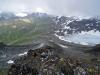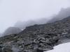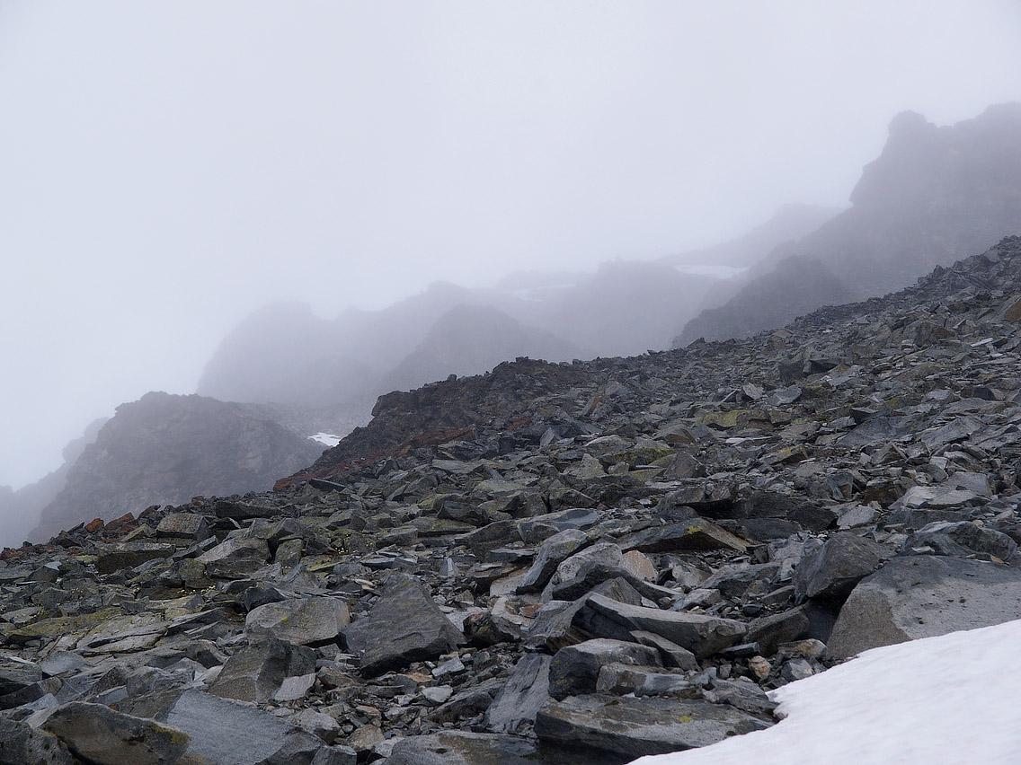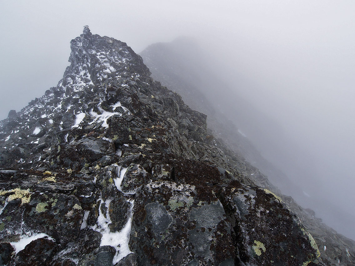 Stusselig vær Turmålenes høyder hørtes denne gangen ut som reneste trafikksikkerhetstipset: 2001 - 2002 - 2003, nemlig hhv. Jervefonni, Geite og Skagsnebb, dog ikke nødvendigvis i den rekkefølgen. Meningen var å ta disse sammen med Panda, men han måtte dessverre melde avbud i siste liten, så jeg tok likesågodt med en skumgummimadrass for å ligge i bilen i Leirdalen et par netter. Regnet trommet på biltaket da jeg våknet om morgenen, så det fristet lite å gå ut av den varme soveposen. Bilen sto vannrett og fint også, så jeg lå faktisk ganske godt på madrassen, selv om det tidlig ble vél lyst… Det endte med at jeg slumret inn igjen, og jeg sto ikke opp før v/ 10-tida. Da hadde været letnet noe, selv om skystrøket fortsatt lå ned til 18-1900 moh. Jeg valgte å begynne med Skagsnebbet. Jeg kjørte ned til Geitsetra, for å krysse Leira på brua der nede. Derfra vaglet jeg meg greit over Hurra, som fosser grå og blakk ned moreneura innunder Skagsnebbet. Videre fulgte jeg så moreneryggen langs sørsiden av Hurra oppover, nesten helt til ryggen møter svaene i selve Skagsnebbet. Der oppe gikk jeg så av moreneryggen, og traverserte så over hele østflanken på nebbet temmelig høgt oppe, på et markert 10-20 m bredt grus- og småstensbelte som som svakt stigende krysser hele flanken. Oppi der gikk jeg rett på en fjellrypefamilie, som med lavmælte mjauende lyder trippet duknakkede og sky vekk over stenura… Etter hvert som jeg rundet østflanken økte motvinden, og et stadig tiltakende regnvær drev inn fra sørvest. Jeg tok sikte på en liten hammer ved enden av grusbeltet. Vel framme ved denne, begynte jeg så å runde mer vestlig og oppover bratta mot rennene i Skagsnebbets sørflanke. Jeg hadde ikke lyst på å gå rett opp østryggen, da denne har et 5m dropp et sted mellom for- og hovedtoppen, og jeg hadde ikke med meg tau. I sørflanken drar vinden ytterligere på, og regnet går over i sludd. Jeg stopper og tar på meg en fleecegenser under jakka, samt både vanter og lue. Foran meg er nå det meste borte i tåka, og den lavbevokste ura begynner å bli svært så glatt. Vanskelig veivalg Jeg klorer meg oppover den første renna, og ovenfor meg materialiserer det seg etterhvert et mylder av hamre fram av tåkehavet. Manglende sikt mot toppryggen forhindrer meg fra å vurdere mulige vegvalg, så jeg satser på en port imellom to hamre på hver side av den neste renna vestafor meg. Jeg tar meg på løs og glatt ur over i den renna, og går oppunder den østligste hammeren. Denne er bratt og glatt, så jeg tar peiling på den nevnte porten, som viser seg å huse et sleipt og såpeglatt vannsikkel, med et ca. 3 m stupbratt opptak, så og si uten hverken håndtak eller fothyller. Jeg famler her litt på begge sider av vannsikkelet, men gir raskt opp. Så jeg trekker meg tilbake i retning den første renna igjen, og finner da ei smal hylle i den østligste hammeren, som skrår opp imot et pittelite skar imellom hammeren jeg er i og en liten knaus/blokk til høyre for denne. Her holder jeg på å gå meg fast. Den svarte navlelaven sveller i regnet, og berget blir svært glatt, så jeg har knapt fotfeste. Under meg er det nær loddrett en 7-8 m, før den svapregede og bratte renna overtar... Men jeg trekker inn magan, og smyger meg så mjukt jeg kan videre, satser mest på håndtakene, samt på å nærmest lime klærne innpå berget. Phui! Lettet når jeg endelig det lille skaret, og derfra er det greit videre oppover ovenfor hamrene. Julisnø Der når jeg et lite snøfelt, og føtter meg videre opp på dette. Vel forbi snøen kommer jeg plutselig opp på selve toppryggen, og varden ligger like til venstre! Tåka er klam og tjukk, og et nær vannrett snøvær prikker på jakka og i ansiktet. Et tynt krav av nysnø ligger på stenene og varden, og mot øst toner ryggen raskt bort i tåka mot fortoppen. Det hele er kaldt, skumt og ødslig, så jeg tar kun en liten sjokoladebit og en slurk drikke, før jeg returnerer. Nedatt går jeg ørlite lenger øst enn der jeg kom opp, men tvinges snart av hamrene og glatte svapregede renner tilbake til omtrent der jeg gikk opp. Her går jeg meg også på nedturen nesten fast igjen, kun en 4-5 meter unna der jeg sto og glodde på tur opp! Men jeg har intet valg, og med samme teknikk som på oppturen, åler jeg meg nedatt på ei hylle nærmere hammerfoten, og derfra til venstre, og når endelig toppen av renna hvor jeg først kom opp. Svaene i renna er for glatte til å følges, så jeg går stenryggen langsmed, helt til jeg når et 200 m langt snøfelt i renna. Dette følger jeg til endes, for derfra å vakle meg nedover bratt, løs og nesten usannsynlig glatt ur - ikke moro i det hele tatt! På denne glatta vil jeg ikke gå tilbake østflanken, men trekker mer rett ned til dals for å få mer vegetasjon å gå på. Dessverre besto denne etterhvert av tett og søkkvått kjerringris og vijukratt, så ur og sten i bunnen var vanskelig å se, og dermed også vanskelig å gå på. Og nå høljeregnet det igjen, og jeg var etterhvert blitt skinnvåt. Men jeg hadde bare å følge dalsida langs Leira nedover mot brua. Omsider nådde jeg så Hurra, sa ”Hurra!” idet jeg hoppet over denne og kunne se brua og bilen igjen. Etterpå dro jeg og tok en dusj på Leirvassbu, hang klærne på tørkerommet, og parkerte så igjen bilen på nattplassen min. Der stekte jeg pølser på primusen - inni bilen! Så litt sliten etter all balanseringen på glatta, kunne jeg bikke meg ned i soveposen, varmt og tørt, og høre på regnet som fortsatt trommet på biltaket. Med god samvittighet over å ha brukt uværsdagen til å få et nytt 2k-kryss, sovnet jeg godt inn. Men før jeg sovnet var neste dags tur bestemt - det skulle bli Jervefonni!