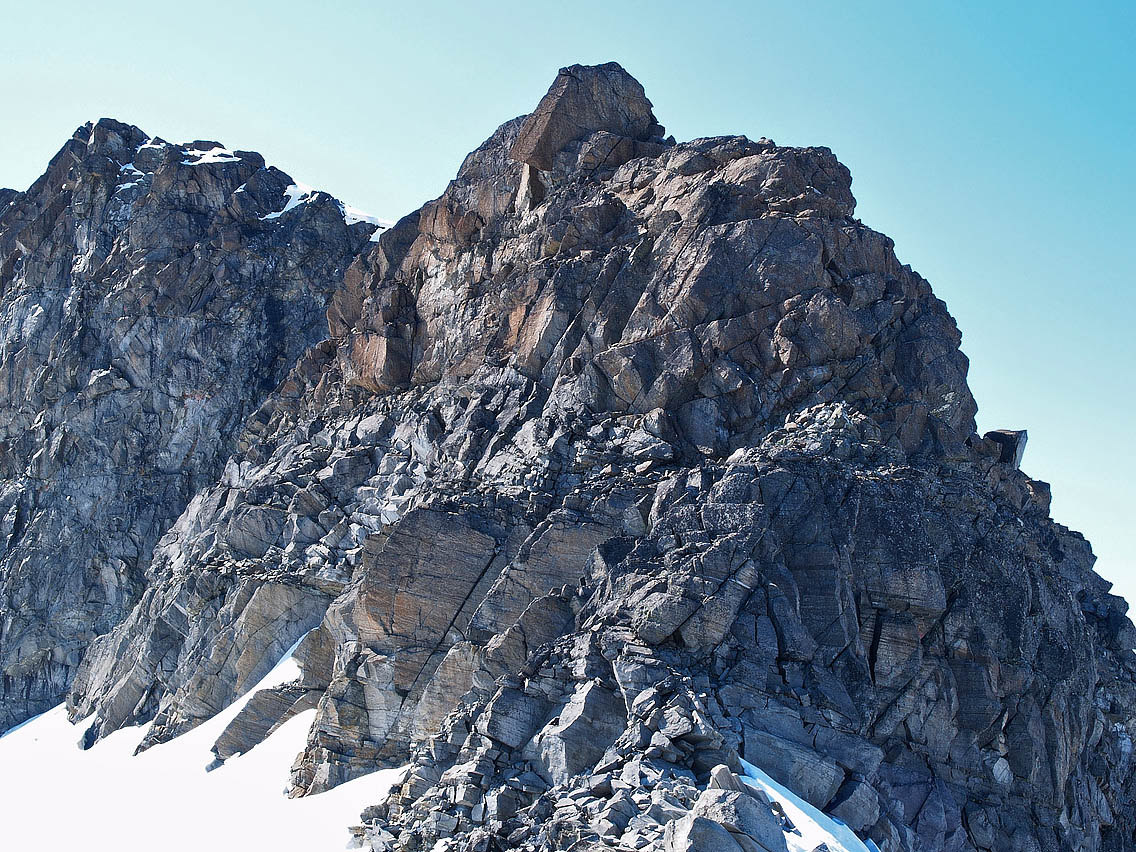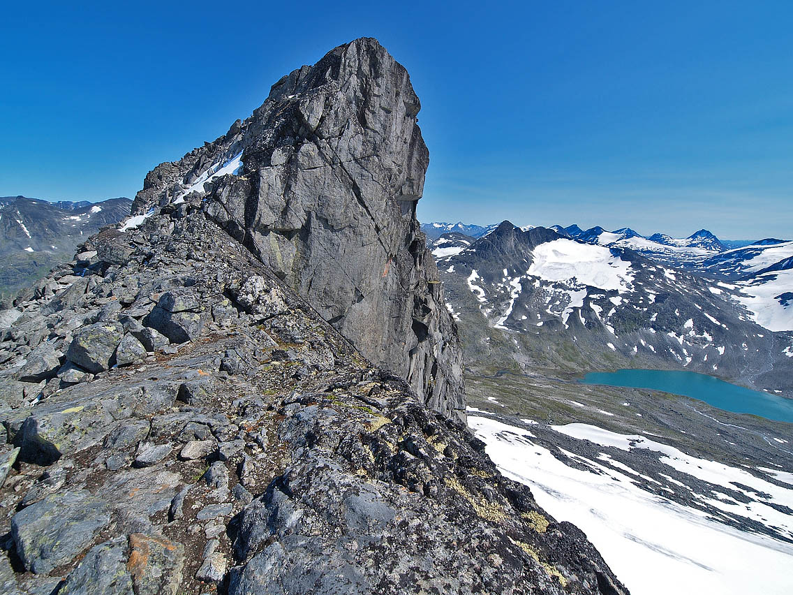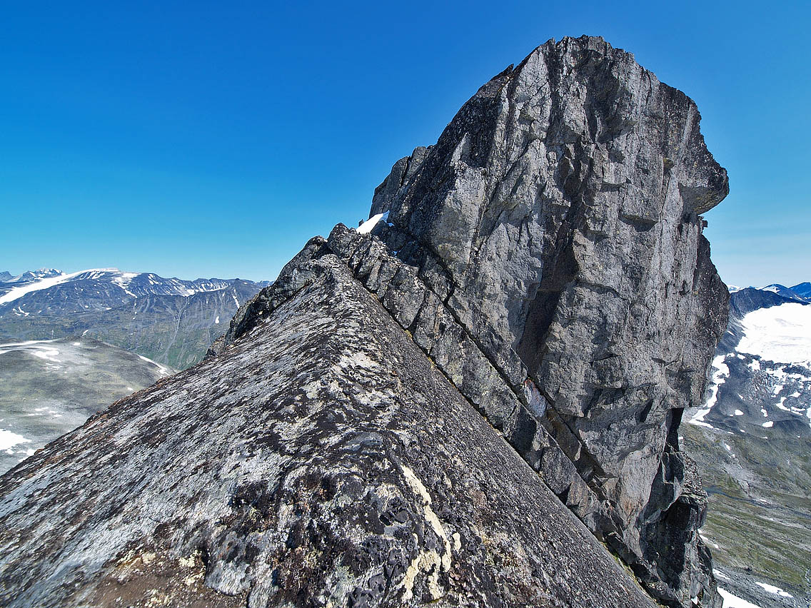 Spennende tur! Var sjøl på Geite 15/7, og gikk egga vestover mot Sokse bort til første hammeren langs egga. Var et stykke oppe i den, men valgte å snu av flere årsaker. Så dog ut til å at ruta opp var først å traversere ut til venstre (sørsida), og så opp litt lenger bort på hammeren. Vedlegger et bilde av hammeren tatt fra egga vest for Geite. Kunne du tegne inn vegvalget ditt opp på bildet? Ellers var det pr. 15/7 flere store og for det meste snødekte sprekker i breen sør for egga, der du krysset på nedtur til Leirdalen igjen. Disse røpet seg sett fra oven kun med enkelte hull i snødekket her og der, så jeg håper du fulgte nedkanten av breen langs den lange moreneryggen som drar opp fra Tverrbytnet i retning Sokse. Hvis ikke var du kanskje heldig...