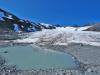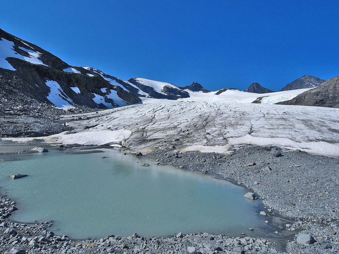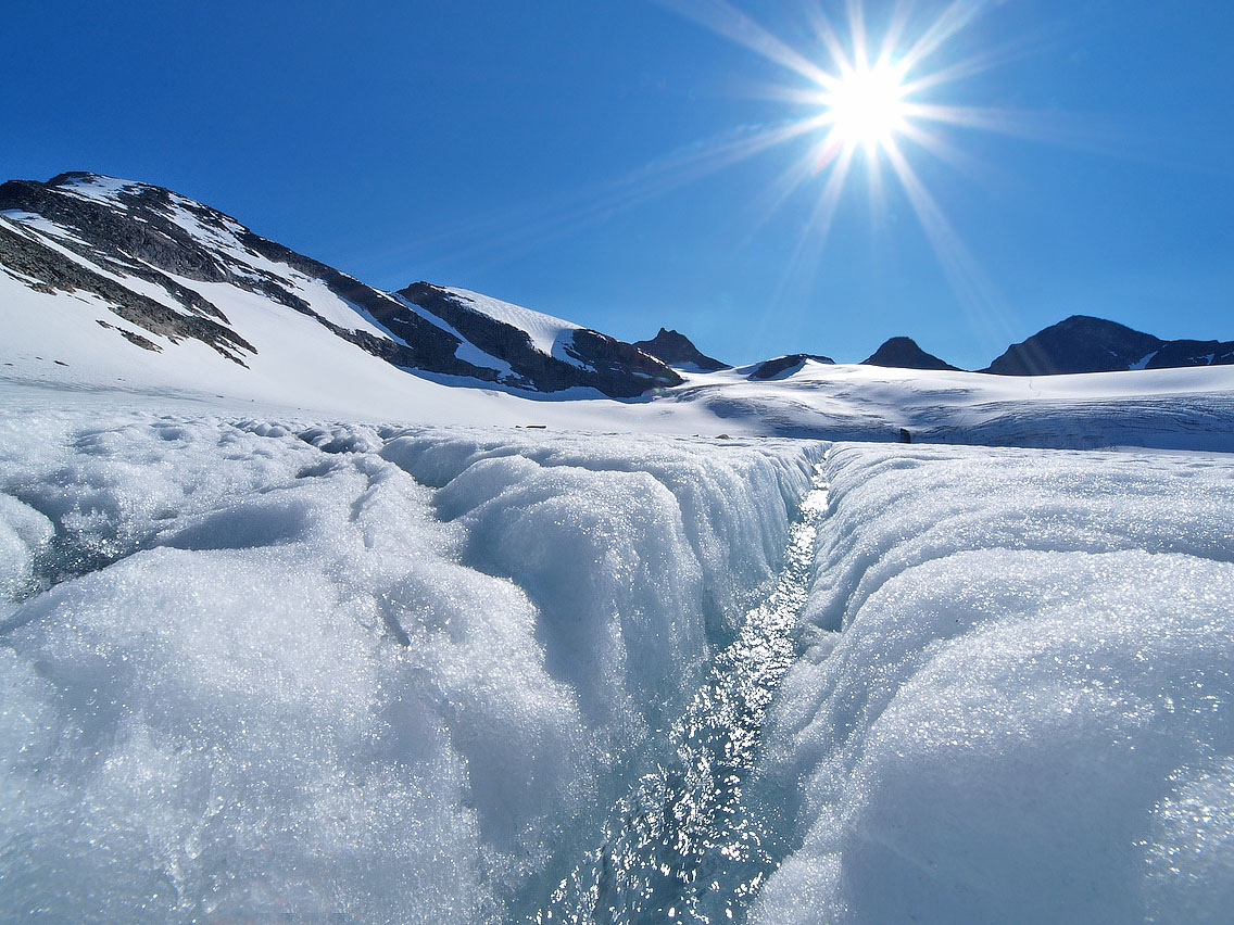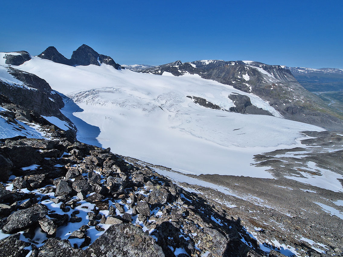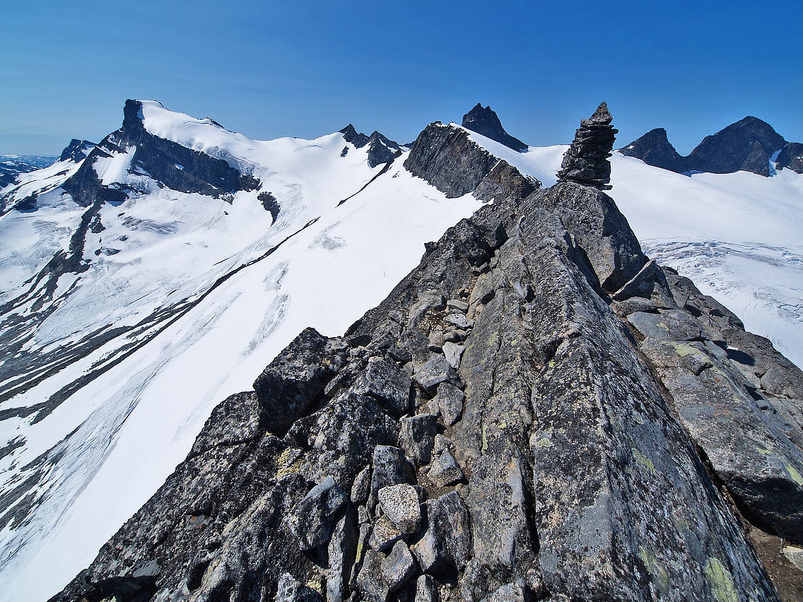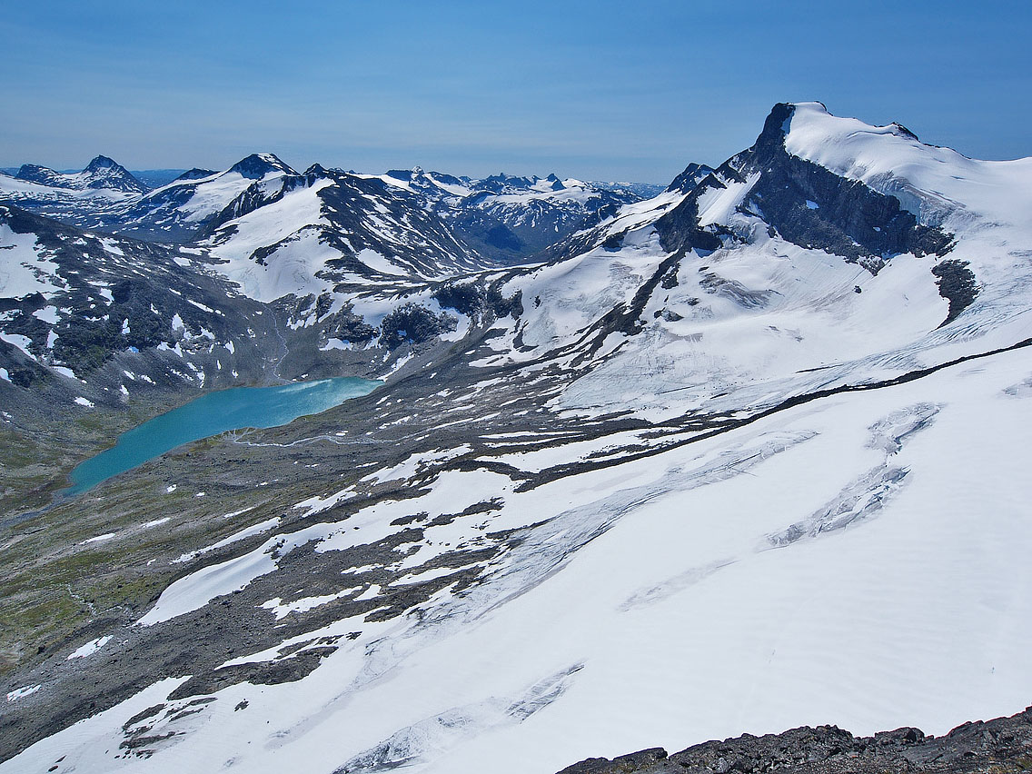 Endelig godvær Jeg våknet allerede kl. 0445 etter andra natta i bilen i Leirdalen, og hørte denne morran hverken vind eller regn. Derimot hørte jeg noen snåle dunkelyder i bilen, og oppdaget snart ei diger sautikke som sto og gnog på bilpanseret! Jeg vrengte opp framdøra på bilen og gaulet stygt, og tikka tok vel nesten baklengs salto, før den på stive ”krogenesben” nispurtet i rak linje nordover og forsvant, mens et knippe råferske saumøkkuler trillet ned i grøfta foran bilen. Jeg gliste høgt for meg sjøl der jeg satt . Bra åpning på dagen! Deretter så jeg rett opp i dagens mål som glødet lakserødt under solgryet: Geite/2002. Himmelen var klar som ei speilglassrute, og jeg var klar som et egg! Men jeg hadde svært god tid, og slumret tilfreds litt til før jeg sto opp. Jeg tvang i meg et par brødskiver (hater mat om morran!), før jeg som på gårsdagens tur til Jervefonni, atter kjørte ned til brua v/ Storbreagrove. Derfra plystret jeg like glad og fornøyd som Veslefrikk innover langs åa, i retning svaene som stiger opp før grusflatene innover mot fronten på Storebrean. Det gode liv dette! Jeg hadde beskuet breflata på Storebrean oppe fra Jervefonni/2001 dagen før. Breflata var snøfri og gråblå, og ingen seriøse sprekker eller breglepper var å se noensteds, så planen var å gå inn omtrent midt på breryggen ca. 1,5 km, før jeg skulle opp ei snøflanke mot bandet/1753 mellom Rundhøe/1822 og Geite/2002. Hyggelig nerd Vel oppe v/ brefronten blir jeg vár 2 karer som sitter på huk mellom grushaugene ved brekanten ute til venstre foran breen. Etter å ha tatt et par bilder fra haugen foran breen, tusler jeg ned til dem, for å se hva de holder på med. Det viser seg å være en professor m/ assistent, en skjeggete og bebrillet nerd fra Wales, som var professor i geomorfologi (læren om erosjonsmassers tilblivelse og bevegelsesdynamikk). Han fortalte at han hadde tatt sin doktorgrad på data fra Jotunheimen allerede i 1979, utgitt 160 vitenskapelige publikasjoner på emnet, og at han hadde ligget i telt i Leirdalen i 6-8 uker hvert eneste år de siste 35 år Nå hadde han kun et år igjen før pensjonisttilværelsen. Hvis noen så et par større gule mønetelt langs Leirdalsvegen ca. mellom Skagsnebb og Jervefonni i sommer, så var det leiren hans. Vi snakket lenge om emnet, som jo er særs spennende synes jeg. (han kunne ikke norsk, men snakket heldigvis ikke walisisk til meg heller!) Så spurte jeg ham om forholdene oppe på isen, om evt. breglepper m.m. ”Aner ikke”, svarte han. ”Jeg er aldri på isen - jeg er geomorfolog, ikke glasiolog!” Det viste seg at han aldri hadde vært på isen! Tenk det’a - sitte på huk v/ brefronten og pirke i grusen i 35 år, og aldri vært på isen! Helt utrolig, spør du meg. Da er man jaggu ekte nerd! Men assistenten hans syntes det var fint og morsomt på breen, men kunne ikke opplyse noe om de rådende forhold på tidspunktet… Nedsmelting Jeg tar på stegjerna og rusler iveg opp iskappa på Storebrean. Den er veldig løs og ”linsete” i overflata, så egentlig kunne jeg klart meg uten stegjern, ikke brattere enn det er oppover her. Overflata er også gjennomskåret av et utall små bekker og vassrenner, og det klukker, siver og suser overalt. Her skal jeg si det smelter unna! Og masser av finere sten og grus ligger overalt i isen og suger solvarme, og aksellererer smeltingen ytterligere. Et trist skue for meg som breelsker. En sval fallvind møter meg oppover isen, og alt er bare nydelig. Vel framme utenfor snøflanken jeg hadde tenkt å gå opp mot Geita, finner jeg et salongbord av en sten. Der setter jeg meg og tygger i meg ei brødskive, og drikker litt. Det rennende vannet i ei blå lita isrenne er friskt og helt uten bismak av noe slag. Rundt meg står svarte kjemper som Sokse/2189, Kniven/2133 og Store Smørstabbind/2208. Jeg ser også sporene av et følge som har gått isbratta rett opp fra brebassenget og videre i retning St. Smørstabbtind. Fra et bergheng i nord buldrer et lite isras ned, vannet muller og mumler i og oppå breen, og en lun føhnvind hvisker i det store rommet som brebassenget danner. Ellers er jeg alene med den store naturen, og alt føles så godt og riktig . Jeg nyter hvilen og sola i lange drag, før jeg igjen hufser på meg sekken, og tar iveg opp den solmjuke snøflanken mot bandet oppunder Geite... Utsikt grand lux Ura videre fra snøflanken er tørr, fast og fin, og snart er jeg oppe på bandet. Der oppe ligger en enslig kampesten av en helt annen bergart enn ura rundt, sikkert brelagt dit en gang i tiden. Oppover mot toppen på Geite brattner det til, med enkelte små sva og knauser. Men her finnes ingen vanskelige punkter, og jeg leter meg greit opp, og pluselig er varden like over meg til høyre. Noen titalls meter til, og brått når jeg egga som er skarp og rettlinjet, og en alldeles overveldende utsikt åpenbarer seg. Det enorme volumet over Tverrbytnet er som å ha selve himmelrommet under seg - under horisonten! Et stort sus fra bekker og smeltevann sjoer tungt gjennom lufta, og langt der nede lyser Tverrbyttjønne jadegrønt og blinkende under den høge julisola. Rett i front kneiser Stetind/2020 svart og stolt, og ute til høyre lyser den drivkvite ryggen på Storebjørn, som står som en diger knyttneve mot horisonten. Himmelen er blank og blå, og jeg ser dem alle, jotne bak jotne, hele gradskiva rundt, til øyet blir stort og vått... Langs egga Jeg hadde sånn halvveis tenkt å gå vestover egga til Sokse Ø-1, som er oppgitt til 2064 moh, med en tvilsom PF10. I ettertid har jeg hørt at dette er gal høyde, at toppen ligger nærmere selve Sokse/2189 enn tidl. anmerket, og at høyden er 2100 moh. Like vest for toppen på Geite ligger to vertikale hammere på en 7-8 meters høyde, som begge greit omgås litt ned i nordflanken. Egga videre fra den første til den andre hammeren er artig, et glatt møneformet sva med gode bøttetak oppe på selve egga. 