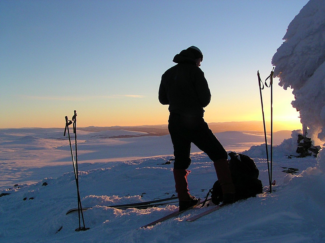 Å jada, blink det! Da var lista komplett - igjen! Bildet tatt 15.02.2004 kl. 16:03. Den turen begynte med regn og stiv kuling fra nord, og etter 8 timer med grovkornet snødrev rett imot, så ettermiddagen slik ut fra toppene. Og da vi kom tilbake til bilen ved Brimi Fjellstue, blinket stjernene blanke på en bunnsvart himmel, høgt over de sovende fjell... Og siden denne ble løst så bråkjapt, så får vi prøve en som kanskje er hakket verre da? Hvor står Roger og nyter kveldssola her?