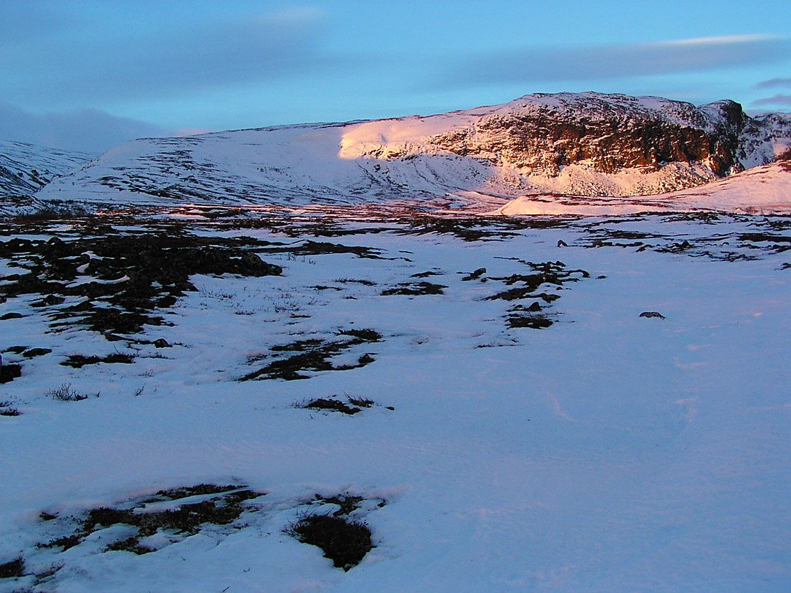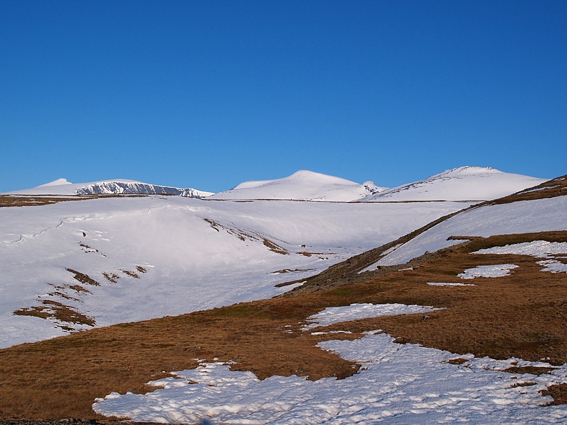 Merkelig hvor lite snø det pleier å være i disse områdene. Sjøl da jeg gikk over 2k-toppene der i april i år, kunne jeg ha gått lange strekninger på bena, jfr. vedlagte bilde tatt langs Storhinde 28.04.05. Snøforholdene i disse helt østre områdene av Jotunheimen minner mye om østre Rondane egentlig. Man må nesten påregne skibæring uansett når man går på vinteren. Bra dere fant pluggfeste for teltet ihvertfall!