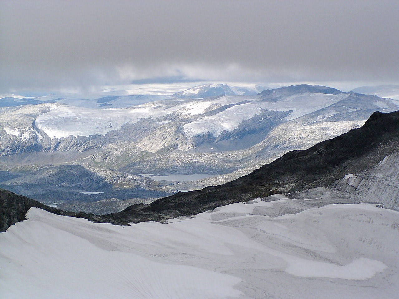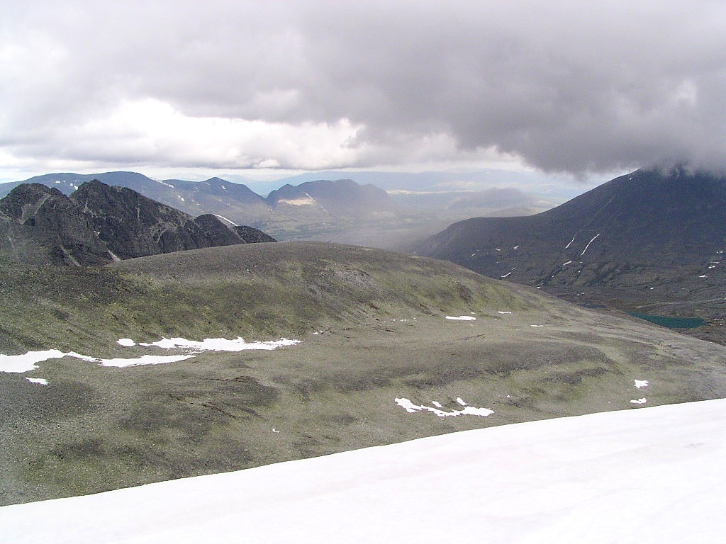 Søkke ta! Du imponerer igjen, Nils! Du er jo et levende leksikon på dette da! Bildet er tatt 25.08.2003, og vi ser vestover nettopp fra Bakarste Skagsnebb/2093, over bandet mellom Hurrbreatind/2060 og Veslfjelltind/2157. Bakenfor hildrer Breheimen. Fremst sees Moldskredvatnet/1238. Til venstre Liabreen, og bak den, opp mot skyene, ligger Spørteggbreen. Den mørke høgda i høyre bildeside er Liabrekulen/1910, og det tunge høgdedraget bakerst midt i bildet er Grånosi/1775 NØ for Spørteggbreen. Hva skal vi gjøre med'n Nils da folkens? Han er jo kav umulig å sette fast jo! Jeg får trøste meg med at'n i det minste ikke har løst gåta mi fra s.7 ihvertfall...: https://www.fjellforum.no/oldLinkConverter.php?oldAttach=1444 Ser at Fjellfinn's siste fortsatt står uløst, men ikke aner jeg hvor det skvalpeskjæret ( ) er hen... Men her tåles jo to samtidige har jeg sett! Så derfor - over hvilke fjell sleper regnbygene her? Og hvor står jeg og tar bildet? Nok ikke av den vanskeligste sorten dette, men litt "folkelige" skal jo oppgavene være også, for å opprettholde en viss interesse?! (hmmm - når jeg ser på skjermen nå, så ser det jo ut som jeg har mistet ei appelsinkasse her! )
