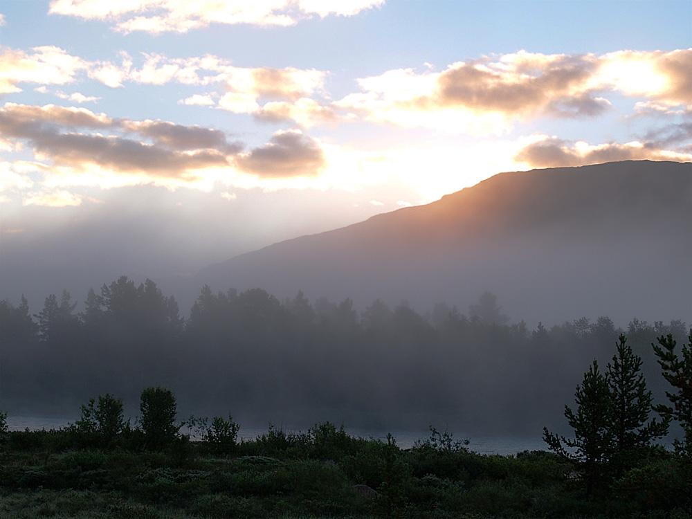Neida, det var faktisk slik! Bildet er tatt 26.03.2005 kl. 19:07. Det ble et fantastisk lys idet sola gikk ned, så jeg måtte bare ta et par bilder i all hast, da jeg hadde det litt travelt med å komme meg ned fra fjellet før det ble mørkt. Men det ble det likevel - se turreferat her: https://www.fjellforum.no/index.php?app=forums&module=forums&controller=topic&id=2657 Kun en bitteliten metning er pålagt, fordi CCD'n i en digital SLR (speilrefleks) normalt gir noe softede og fargesvake bilder. Slik etterbehandling er nærmest standard med slike bildebrikker, får å "nå igjen" originalen, altså slik det så ut i det reelle motivet. Men slike bilder gir jo knallharde kontraster mellom et landskap i djup skygge, og en knall lysende himmel. Dynamikken mellom høy- og lavlysene er nær 5 EV (steg), nær max av hva en bildebrikke klarer å svelge. Derfor er beste løsning som regel å kompensere kun + 2/3 til 1 steg, for ikke brenne ut himmelen. men da blir landskapet meget mørkt, så dette må "hentes" fram i digital postprosessering. Der løftes da lavlysene opp en 2-3 steg for å skjelne detaljene i landskapet. Uvegerlig drar man dog på seg noe digital støy i de løftede arealene, men med nennsom hånd kan man lage et noenlunde spiselig kompromiss...