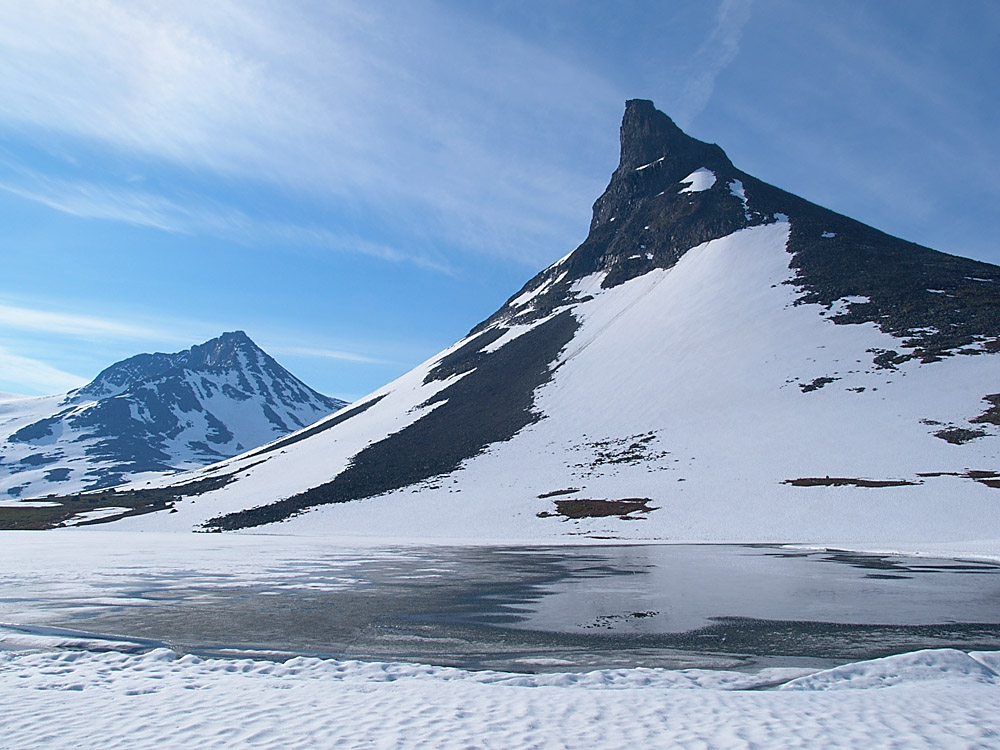 Ha'kke peiling, men det er lov å tippe. Tipper Vangsen/1782 i Jostedalen. I så fall et fjell jag aldri har sett... (mulig vi skimtet østsida av den fra Dyrhaugsryggen i våres, men derfra ser den ihvertfall ikke slik ut!)