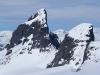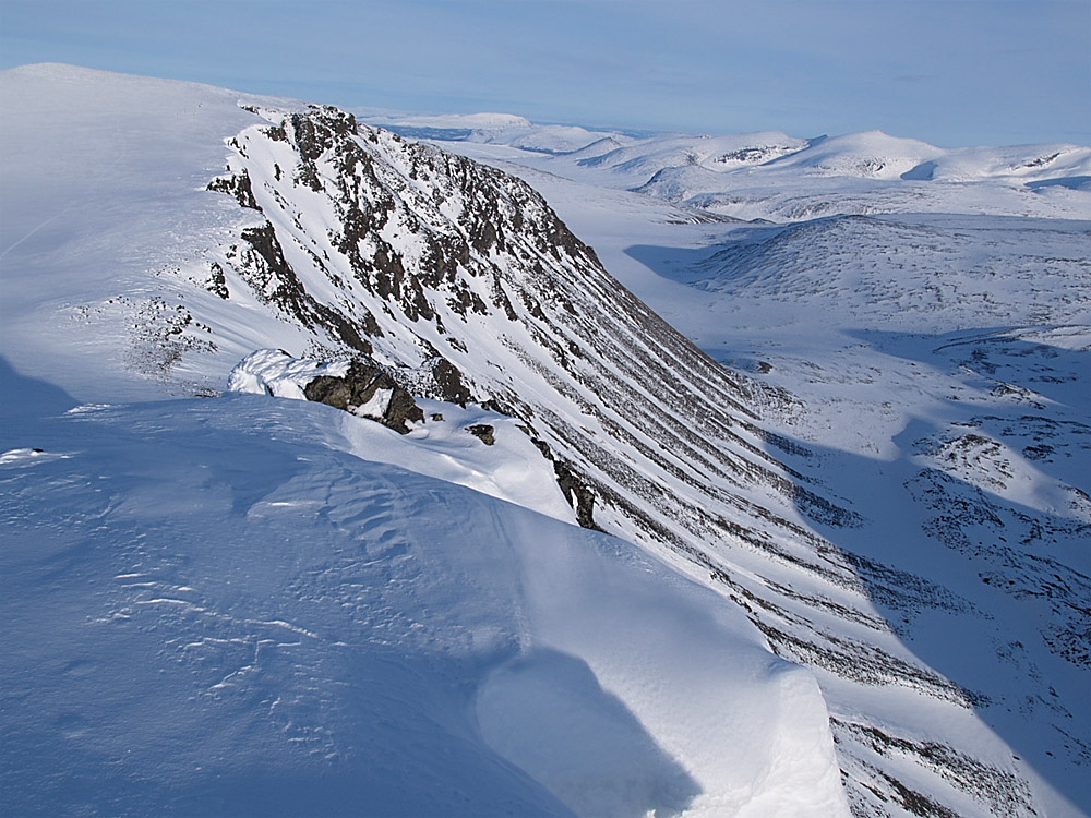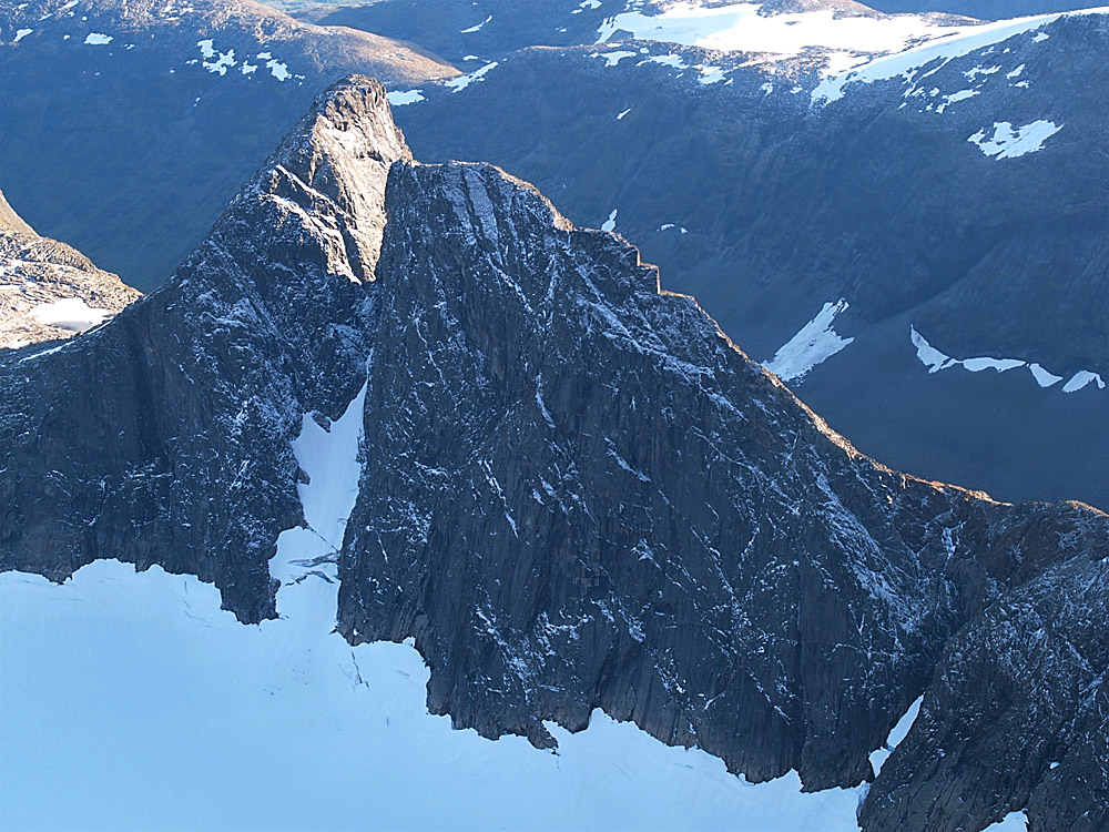 Joa, kan skjønne det. Blir nok ikke jeg som sleper deg dit heller. Bare for å skremme deg ytterligere, så sjekk ut bildet for nærmere detaljer. Ikke god å rå med denne kjerringa! (ikke denne heller... ) Merk de gigantiske trappetrinnene på nordryggen. Med stup på begge sider også, så er ikke dette akkurat bærplukkerterreng!
