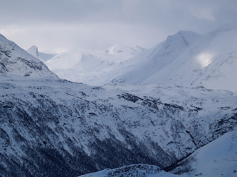 Så bare for å roe deg ytterligere, her kommer et til fra samme tur/kveld. Men her skal jeg røpe hva du ser: Hestbrepigg Vestre/2139, sett tversover både Visdalen og Bøverdalen. Merk reinsdyrtråkket over snøflatene...