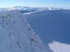 Vi dro 2 mann fra flatbygdene kl. 0300. Det var vindstille, -7º, tindrende stjerneklart, og en diger blank måne sto høyt på den bunnsvarte stjernehimmelen. Planen var å gå 6 2k-topper fra Stornubben NØ til Nautgardsoksle. Værmeldingen så bra ut, riktignok med sterk vind på vestlandskysten. Godværet vedvarte til vi var langt oppi Sjoadalen. Da forsvant månen bak lave skyer... Vi ankom Hindseter i mørket kl. 0600. Mens vi gjorde klart ski og sekker, dro et par lette vindpust forbi bilen, og minuttet etterpå rydde de første spredte snøkorn ut av frostlufta (-8º). Vi gikk fra bilen kl. 0645. Det sjoet nå tungt i furuskogen. Vinden kom rett fra nord, og over en morenerygg oppe i lia løftet et lite snødrev av kammen. Derfra ble det gradvis bare verre. Oppe på Hindflyene dro det på skikkelig, så lettjakker ble byttet med anorakker, og fleecehalsene kom på. Snødrevet ble suksessivt både tettere og høyere, og snart var alt borte i snørokk og whiteout. Det ble tungt å gå i motvinden, men heldigvis lå det 6-8 cm puddersnø over flyene, så fellene ga godt feste. Enkelte steder var pudderet blåst av, og på disse isflatene var det nær umulig å gå, ikke engang fellene ga feste her. Vi jabbet trottig på, og gikk påpasselig strakt langs kompasskurs 320º direkte inn i hvitføyka. Vi nådde etterhvert bratta som planlagt, i svangen mellom Hindnubban og Stornubben NØ. Der tok vi en kort pause, og åt ei tæla brødskive. Innholdet i drikkeflaskene var nå blitt til sørpe. Disse ble derfor flyttet fra sekkelommene og inn i ryggsekken, inntil ryggen, og beskyttet av reserveklær. Herfra ble vi begge iskalde på henda, så bivuakkvotta kom på, samt også finlandshette. Hendene ble tvert valne uten votter, såpass at det faktisk var vanskelig å få votta på igjen! Vinden økte stadig, og oppe i stigningen måtte vi stå stille i lange raft, og bare klore oss fast. Etterhvert begynte vi nå direkte å blåse overende i kastene. Øyevipper og skjegg frøs til, så litt isbryting måtte til i ny og ne. Vi oppdaget på hverandre at vi nå fikk hvitroser i kinna, så ytterligere tetting rundt hodet var påkrevd. Hettene ble snørt ned, og finlandshetta dratt opp, så kun en liten sprekk var igjen til øynene. Dette medførte jo at all pusting og pesing bak finlandshetta dannet kondens og ising. Finlandshetta frøs dermed helt til, og ble derfor enda tettere og verre å puste i. Den ble til slutt som ei isete planke foran fjeset, og satt etterhvert for min del fastfrosset i skjegget, og sto nærmest som en forskaling rundt hue! Endelig oppe på bandet øst for toppen, ble vinden formidabel. Her blåste vi ukontrollert omkull flere ganger, hvilket kunne være skummelt nok i stenrøysa... Jeg sto stille sammenhuket mot vinden, klorte meg fast med med skia i fiskeben, og begge stavene pigget bakover til støtte. Når jeg da ser på stavene, så står begge stålstavene og vibrerer som kreppapir i vinden! Bråket og vindrammelet i anorakkhetta gjør nesten vondt. Vi må rope til hverandre på 30 cm avstand. Vestover langs toppryggen blåste stavene konsekvent vekk ut til venstre, så istedet for å løfte disse mellom stavtakene, måtte vi bare streke stavpiggene langs bakken mot neste piggtak. Det at man ikke kunne høre sine egne ski og staver, ga også en sær og undervannsaktig følelse av manglende kontroll. Der oppe brukte vi nok nær en time på de siste 500 distansemetrene mot toppen. Ved varden på 2049 moh ble valget derfor enkelt: Retur! Men returen var heller ikke barebare. Med diger anorakk, hette, ryggsekk og bladvotter omtrent til oppunder arma, ga 25 sekundmeter medvind skikkelig skyv i ræva utfor bratta! På de isete øvre delene var dette problematisk. Jeg prøvde å ta av skia, og gå på bena langs stenrabbene. Dette var heller ingen suksess. Når jeg tviholdt skia i hendene, hang stavene etter hempene og slang framover i hardvinden, og stuket imot såfort de nådde bakken, mens skia var nesten umulige å holde fast. Jeg var rett og slett en levende vindmølle! Og hvis man glapp taket på ei ski her, ja da var den bare borte... Men vi kjempet oss etterhvert langsomt nedatt til flya. Vi hadde håpet at vinden skulle løye litt der nede, men så skjedde ikke. Hele Hindflya sto i et et eneste brølende rokk ut mot dalen, og snødrevet sto nok 30 m høgt. Vi tok ei lynkort pause, gnog i oss atter ei bånntæla brødskive, uten drikke. Flaskene var nå bare is, selv plassert mot ryggen inne i sekken. Med -8º og 25 m/s er det effektivt -22 º. Vi ploget i nærmest total whiteout medvinds ut flya. Langt om lenge nådde vi dalbrekket, parallellt med Stor-Hinde på vestsida. Førstes nede i furuskogen løyet det hele. Her landet også snøfokket, og gjennom 30 cm silkemjukt pudder suste vi endelig ned på vangene mot bilen. I en bratt liten bekkedal skvatt jeg noe aldeles. Brått ble det et svare leven mellom bena på meg, idet en orrhane som lå i dokk under snøen, kavet seg på vingene mellom skituppa mine! Den løftet ut hellinga rett i min kjøreretning, vred på hue og skottet tilbake på meg, før den stupte ned over egga og forsvant i snødrevyret. Etter 9 timer i vindbråket, var det nydelig å sette seg i ly i bilen, tine opp gjenisede hetter og glidelåser, og etterhvert vrenge av seg ytterbekledningen. Noen små lettere forfrysninger varmet og klødde på kjakan, men ellers alt vel. Ikke et bilde var tatt - vi kunne som sagt nesten ikke ta av oss bladvotta, og det hadde blitt skavler i solblenderen på sjøl på 1/125 sek! Også jeg som hadde jomfrutur med splitter nytt digitalt speilrefleks! Og Roger hadde glemt igjen kamerabatteriet sitt... Så turen ble ikke som forventet. På tur nordover fablet vi om en lakserød soloppgang over Nautgardstind, med en diger blek måne på hosisonten over tinderekkene i vest... Istedet ble det en reéll påminnelse på hva vinterfjellet kan være. Dette ble min første 2k-topp uten å ha vært svett! Men vi var godt