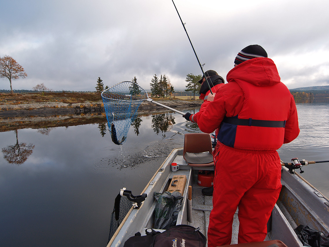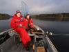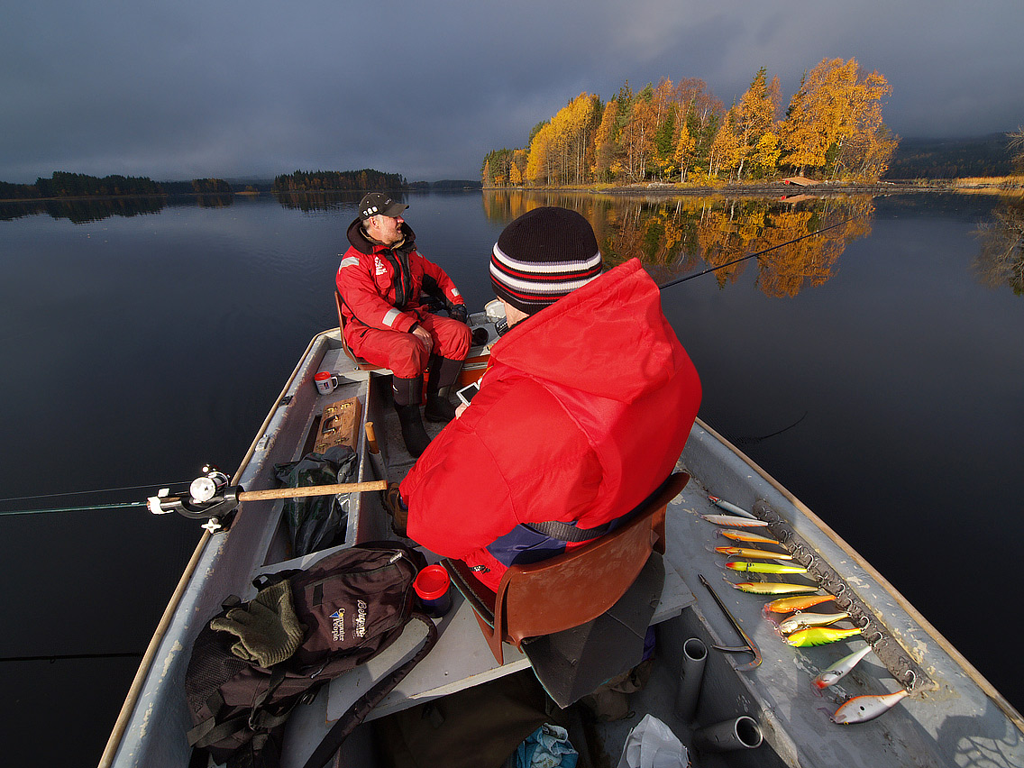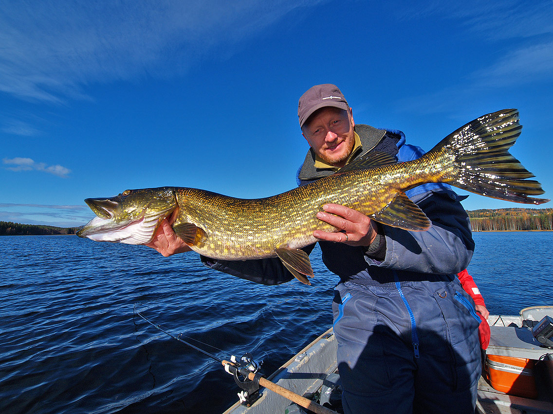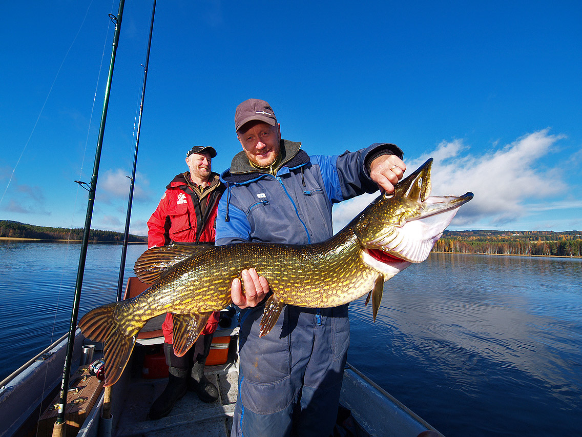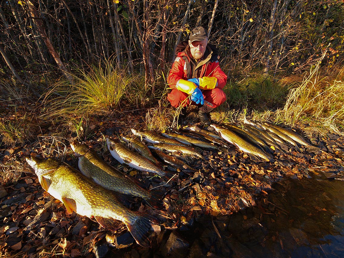 Slenger inn noen bilder fra dagens gjeddefiske. Flott oktobervær, men med noe tiltagende nordvestlig vind utover ettermiddagen. Det ødela eftasøkta, idet bettet som regel dabber sterkt av eller endog dør helt ut helt med vind mellom vest og nord i dette vassdraget. Men vi er godt kjente på vannet, etter 15 år med slik glitrende oktober-underholdning! Så vi har jo et og annet triks oppi ermet likevel... Vår største fisk her til nå er 11,1 kg, beste dagsfangst er 43 stk (m/ 61 fiskekontakter). Det utgjør en del kilo med slik fisk! Og det er på høsten gjedda er fin - hard, tung og grønn som ei magnumflaske. Velgjødd og rund etter en lang sommer. Ikke en slik slapp, slimete og slunken vårgjedde, som sårete og utgytt blir skrytt opp i alskens fiskeblader. Og den er mye sprekere nå også, rett trivselstemperatur i vannet i disse dager. Nei, medium september til ultimo oktober, det er gjeddetid. Det ble 19 i tallet i dag, en tur litt under middels (som sagt grunnet en spak eftasøkt). Hvor sa du? Hehe, si det - men det ligger på flatbygdene et sted! Hvor store sa du? Joa, skapelige disse, men de ligger et par-tre nummer etter de største...