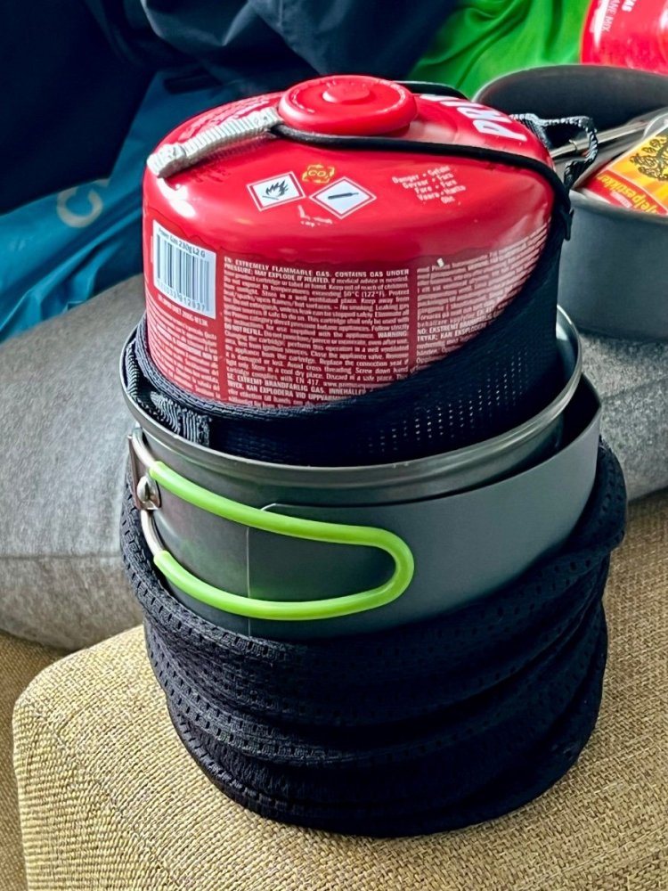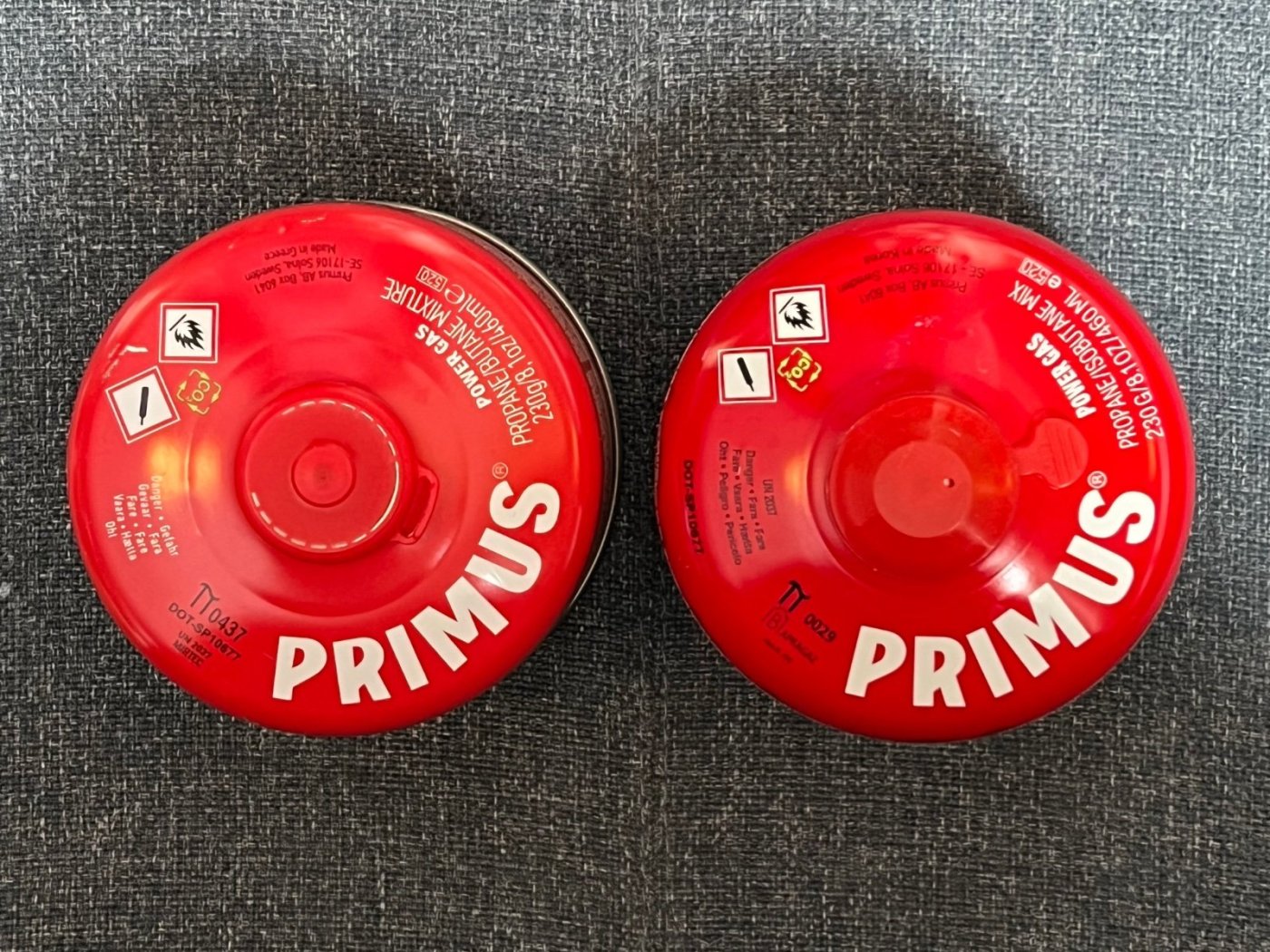 Primus har byttet produsent fra koreanske Taeyang (som de fleste bruker) til greske Camper Gaz. Ny til venstre: De nye 230g-boksene har litt større diameter, som gjør at de ikke passer i min Optimus Terra Weekend HE-kjele: (den går ikke lengre ned) Ganske irriterende, vil tro at en del andre kjeler/bokser også er laget for å akkurat passe en vanlig (dvs Taeyang) boks?