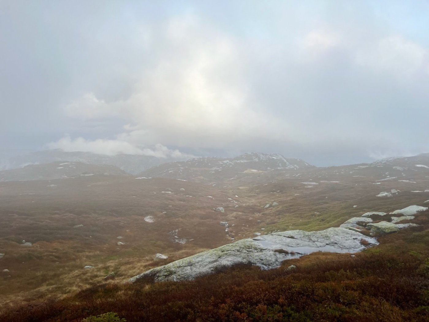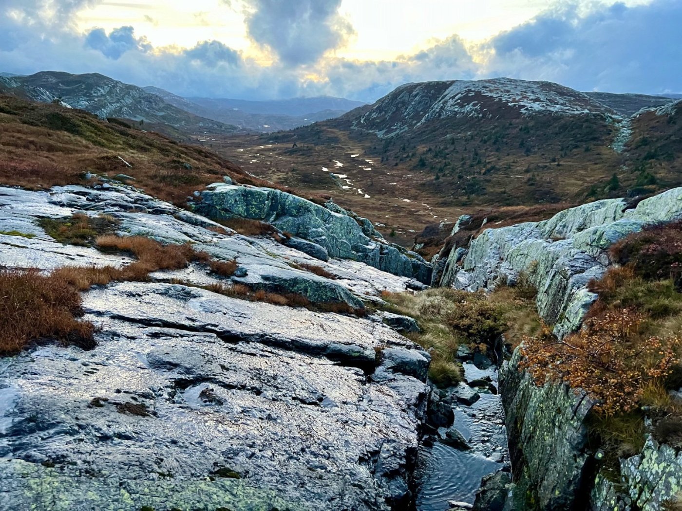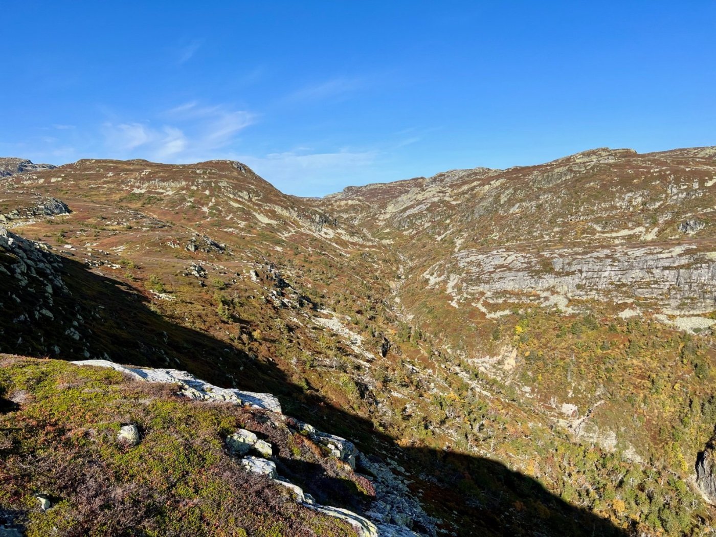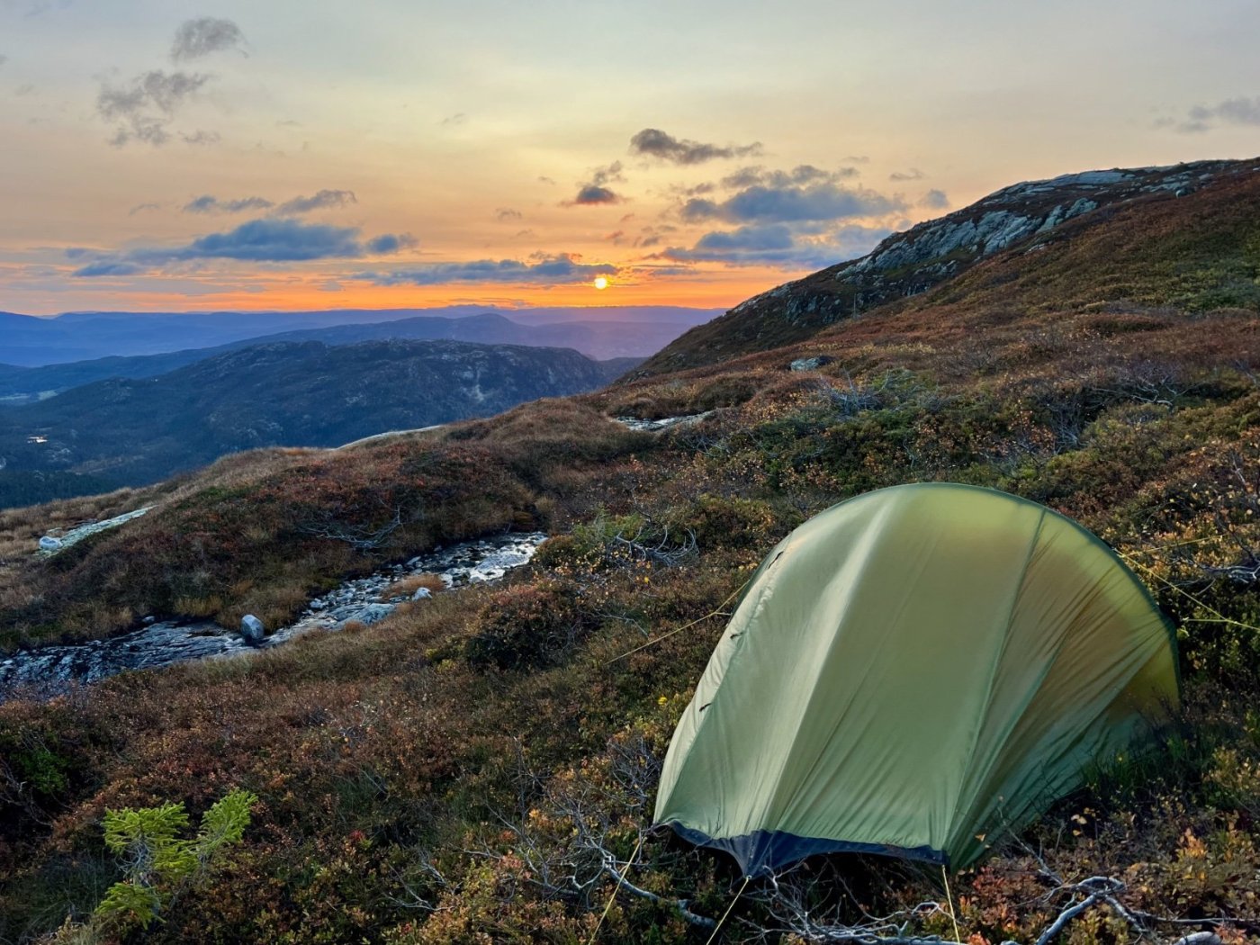 Tre flotte dager i Lifjell, inspirert av fine turrapporter fra @Kristian V., @Martin HJ, @Bjellesau m.fl. Fredag: Jønnbu - Skåråfjellholmen - Øysteinnatten - Dyrdalsfjellet (telt) https://www.strava.com/activities/9944661841 Fint vær da jeg startet ved Jønnbu, men tåken tetnet til og det kom noen regnskyll og litt vind. Dessverre veldig lite utsikt fra Øysteinnatten. Da jeg kom mot Dyrdalen begynte det å mørkne. Ville gjerne slå leir på nord-/østsiden av Dyrdalsfjellet da det var meldt mye vind fra sørvest. Ikke så mange flate partier som ikke var myr, men jeg fant en helt grei plass å ligge på. Fikk dog ikke spent opp teltet særlig bra. Lørdag: Hollane - Mjeltetjønn - Jøronnuten - Langetjønn (telt) https://www.strava.com/activities/9950855239 Blå himmel, men bra med vind. Fant en liten krok i le og med morgensolen i ansiktet hvor jeg kunne lage frokost. Målte 18 m/s i kastene, lå vel på 10-12 i snitt tenker jeg. Utrolig fin utsikt mange steder, særlig vestover mot Hollane da jeg kom ned fra Dyrdalsfjellet. Ble en god pause i solveggen i le på seteren. Flott å gå mot Jøronnatten hvor det var vidstrakt utsikt og mye vind. Nedover gikk jeg litt på måfå før jeg på denne siden fant et tips om en bra teltplass ved Langetjønn. Det viste seg å stemme bra, fin plass i le for vestavinden, selv om mesteparten var ganske vått. Noen få tørre kvadratmetre som akkurat holdt til mitt Ringstind 2 Nydelig kveld, men merket gjennom natten at det blåste heftig, blant annet mye susing fra noen bjørkekratt som stod eksponert til. Søndag: Valjuvsnatten - Valjuvet - Holmedammen - Kloppesteintjønn - Oksladalen og tilbake til Jønnbu https://www.strava.com/activities/9955922794 Da jeg våknet i 8-tiden var det nesten vindstille og kun litt morgendis. Lang frokost i solveggen. Utløpet av Langetjønn mot øst var utrolig pittoreskt, så det ble en del forskjellige motiver derfra. Siden jeg måtte tilbake til Oslo ikke alt for sent, la jeg ruta til Valjuvet via Valjuvnatten før jeg tok rakeste ved mot Jønnbu ned Oksladalen. Vinden løyet helt og det lille som var av dis forsvant, og det ble en fantastisk dag med flotte formasjoner og farger overalt. Såvidt jeg klarte å holde meg fra et bad i en av de vakre fossekulpene oppover Valjuvet!