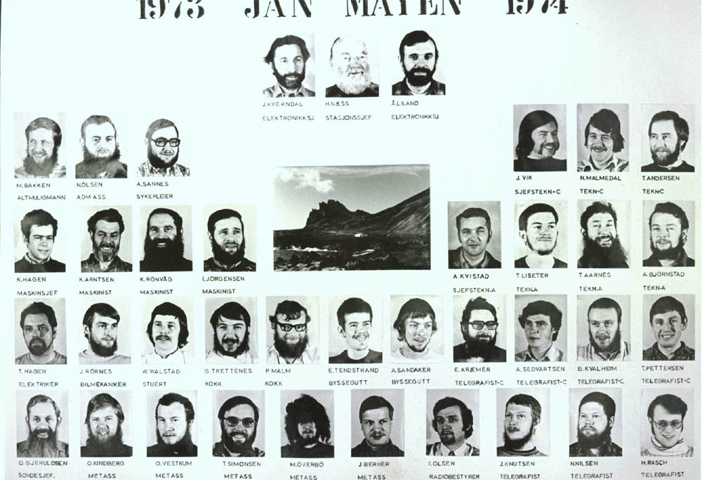 24. flott turrapport. hadde selv en bestefar som tjenestegjorde på jan mayen tidlig på syttitallet, og etter å ha hørt flere historier så har jeg alltid hatt et ønske om ta turen dit en gang. får håpe det ikke er påbudt med julenisseskjegg og sideskill à la syttitallet. legg spesielt merke til øverbø på nederst rad - skulle tro han satte standarden for afrofrisyre verden rundt dog, ryktene skal ha det til at han klipte skjegget og la det på hodet, muligens den første i norge til å teste ut hairextension