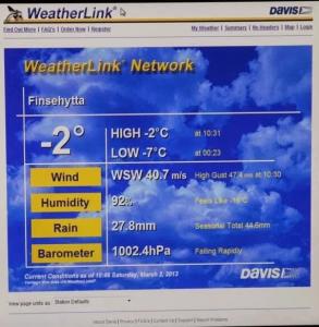 Finsehytta har en "værstasjon" på taket. Som sakt vet jeg ikke hvor riktig disse dataene er, men på en annen side: hvis en får økt vindhastighet over taket, så kan en regne med en får det over en snøfonn også. Poenget mitt er at på Finse må en forvente mye vær. http://www.weatherlink.com/user/finse/ Bilde fra 2.mars 2013