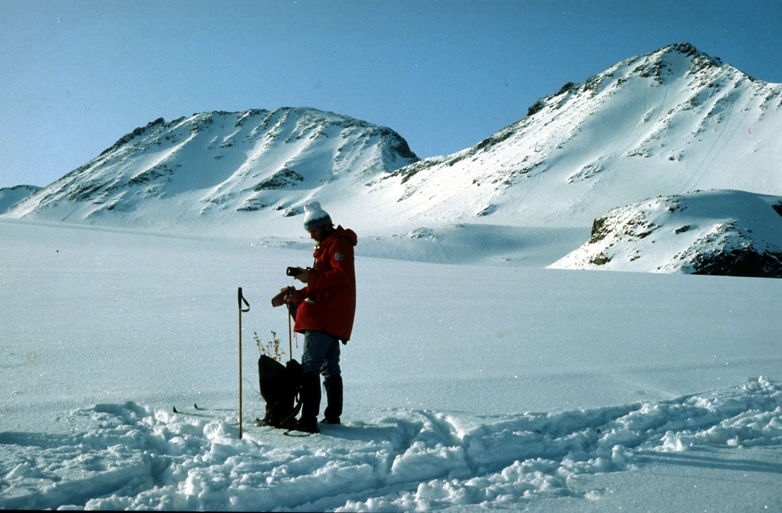 Det kan nok også være mindre snø. Se bildet under tatt 3. mai 2003 fra Nordre i retning Midtre Skagastølstind. Det hadde kommet ca 15 cm nysnø, men for øvrig var det lite snø det året. Det andre bildet er fra galleriene i Heftyes rute tatt skjærtorsdag i påsken 1990. Jeg tror påsken var tidlig det året. Det var en lang tur opp på Storen, med sikring også nedenfor hjørnet. For øvrig tror jeg jeg ikke ville tatt med ski over Skagastølsryggen for å få fin nedkjøring. Bedre å vasse i dalen enn å drasse på skiene. Hilsen Tore