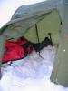 Våknet til overskyet vær på tirsdag, og ca. samme vindstyrke som på slutten av mandag. Vindretningen snudde tirsdag, slik at jeg fortsatt hadde vinden i ryggen da jeg tok av og gikk sørover til nordre biseggvatnet - mener å huske at det også var som meldt.   Mindre snefall denne dagen og tidvis sol innimellom.  På det værste var det ca. 500 meter sikt.  Slet noe med pulken over passet fra Biseggsakaret og ned til nordre Biseggvatnet.  Kort etappe på tirsdag.  Slo leir i nordenden av nordre biseggvatnet.  En del vind da jeg slo opp teltet utpå ettermiddagen (vind fra passet).  Valgte å bruke staver og ski som plugger i tillegg til snepluggene, laget av veistikker i plast, for å forankre teltet godt.  Måkte ned litt av teltduken siden jeg ikke hadde stormmatter.  Tetlet bel satt opp med ene kortenden mot vinden for å få mindre vindfang.  Bråkte en del i teltet denne kvelden og natta:) Men vind oppleves alltid mye hardere inn teltet enn det som reelt er.  Aldri noen fare med teltet - det sto faen med som støpt! Full kos inni teltet:)  Teltet er såpass stort (snøhetta camp 3 fra midten av 90-tallet) at jeg fikk alt av utstyr, inkl. pulken og drag, i forteltet.