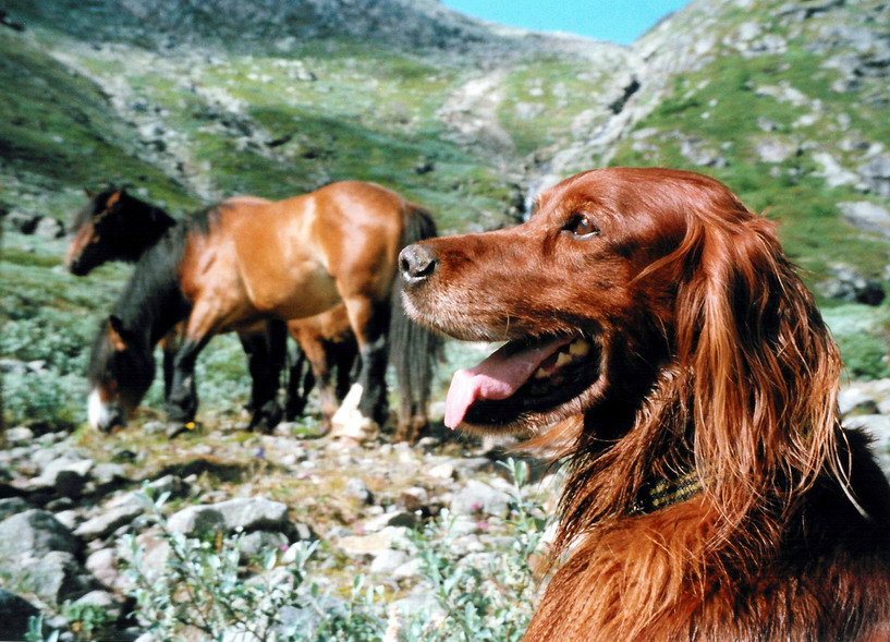 Jeg hadde for noen år siden en toppgal Irsk setter og vil påstå at slike hunder er de mest fasinerende vesner en kan ha med seg på tur. Så fort jeg kom over skoggrensa enset hunden dette og reiste seg i setet av fryd. Å slippe hunden løs og se den enorme kondisjonen er en opplevelse i seg selv. Fremkommeligheten var veldig bra og på høye steiner eller blokker på egger osv hadde han ingenting i mot å bli løftet opp. En kan banne på at en setter har løpt opptill 4-5 ganger lengere distangse enn det du har gått på en lang tur i Jotunheimen. Fargen på Irsk setter passer også utmerket inn i vakre fjellfarger, da særlig på høsten. Men settere er som sagt svært krevende å få mosjonert i den vanlige hverdagen. Dette er en av grunnene til at ny setter ikke frister meg, selv om jeg må inrømme at jeg savner hund på tur.