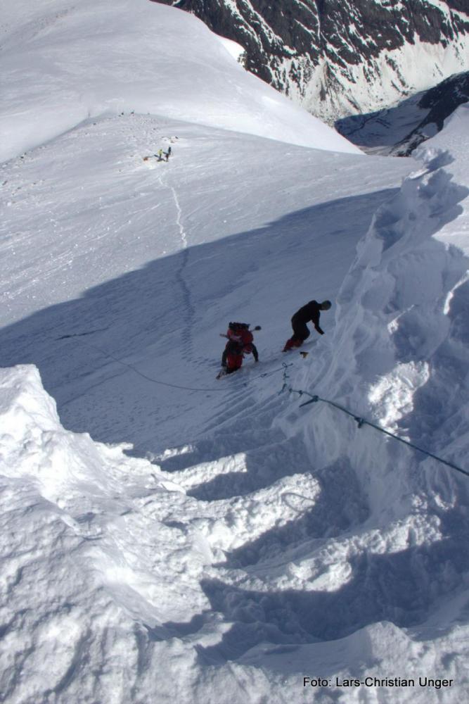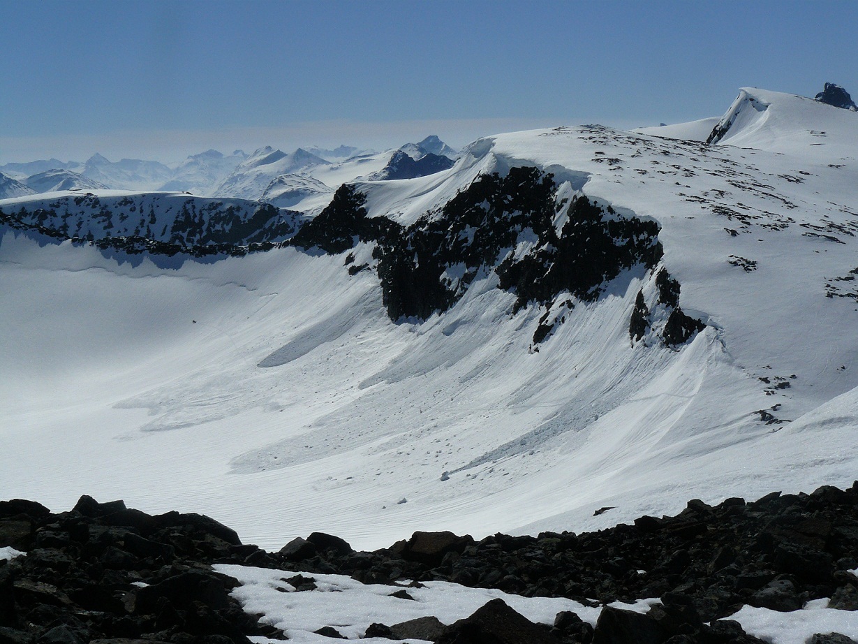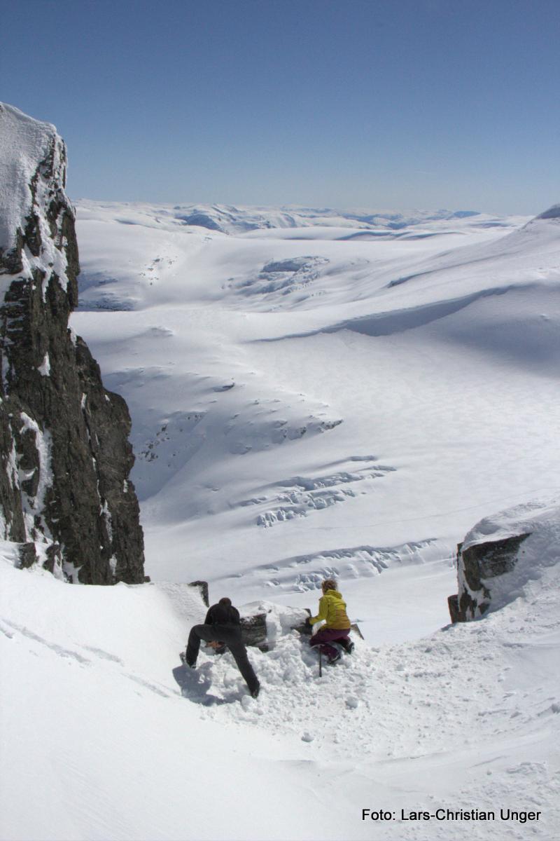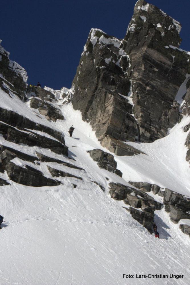 Godt å se du kom deg opp på Loftet den veien, må innrømme jeg var noe skeptisk da jeg hørte hvor du skulle og hvilken vei(da vi slo av en prat på rundt 1500 m.o.h.). Tok loftet fra Nordsiden dagen etter, og det var rett og slett en fantastisk tur(nedkjøringen). Livsnyter: Har noen bilder fra Store Smørstabbretinden i 13-tiden. Angående turfølget på vei opp på Bakarste skagsnebb(3 Bergensere), så har jeg et bilde av disse med deres heller dristige veivalg i disse skredtider: -