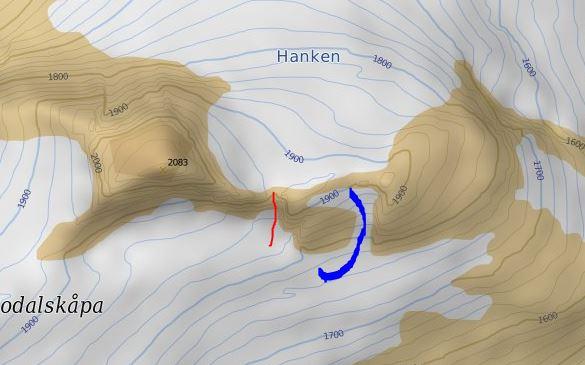 Hei Igjen, Renne Øst for Hanken ja. Rød strek = rapell, Blå strek = mulig å kjøre ned ved gode forhold/ferdigheter (40+ grader helning), vi sendte selve turgruppen ned med rapell. Bilde 3 er den beskrevne skavlen på Skålefjellet, 1905. Legger ved et bilde fra andre siden også, med Kåpa i bakgrunn. Jeg og en til gikk opp med Stegjern, isøks og spade og gravde oss gjennom + la opp fast tau til resten av turgruppen. Vi fulgte i hovedsak denne ruten: http://www.ut.no/tur/2.11000/ , og ja dette er virkelig en flott tur hvis fint vær Hvis du har stravakonto kan turen/ruten i sin helhet sees her; https://www.strava.com/activities/306905469 LC- 4 svar