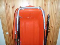 Hei, du kan f.eks gå innom en butikk som selger båtutsyr, så kjøper du to ringer (M 10 står det på de) med skruer og skiver som vist på bildene. (Disse ringene er rimeligere enn fjellpulkens egne fester). Bore/fil de to hullene i fronten på brettet større og skru skruene fra undersiden av bretttet inn i ringene. Eg valgte å ta løs popnaglene på draget og snu det, slik at draget kan pakkes sammen slik at hele draget ligger sammenbrettet i Paris pulken når det ikke er i bruk, veldig praktisk. Så tredde eg draget inn i ringene og popet fast delene på (det snudde) draget igjen.