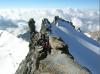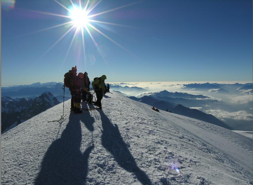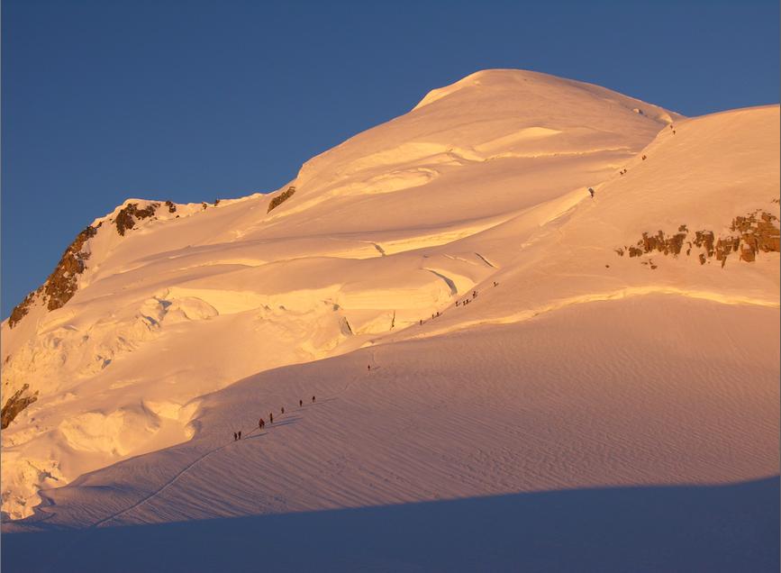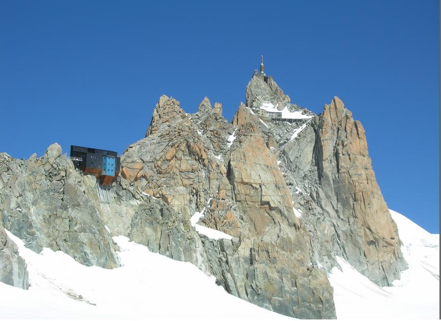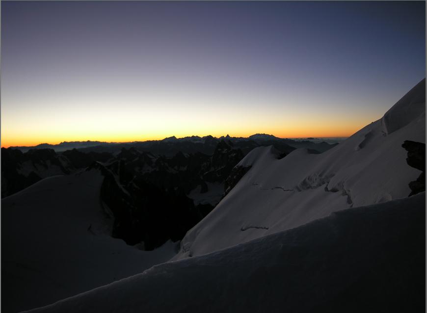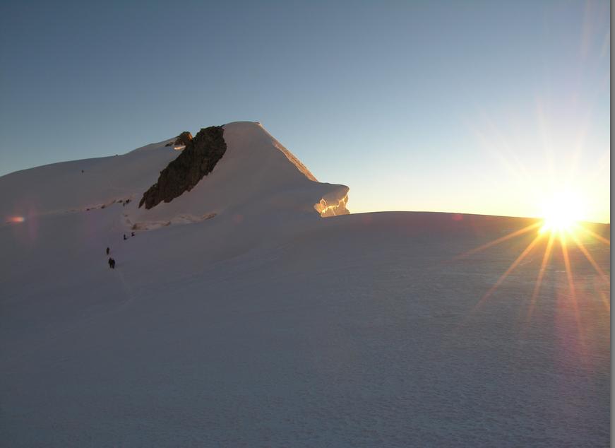 Etter en hviledag skulle vi nå være klar for The Three Monts Route, men om morgenen ringte guiden og sa at været var for dårlig til å gå på Mont Blanc denne dagen, om vi hadde fleksibilitet? Etter en time fikk vi ny telefon og gjorde avtale om å treffes to dager senere. The Three Monts er Courmayeur "sin" rute fra gammelt av. Guide Gourmayeur ble dannet i 1850, og allerede i 1863 hadde de sin første hytte oppe på Col de Midi med påfølgende første vellykkede føring til toppen. Vi derimot overnattet på Cosmiques. Stilig hytte, absolutt noe for seg selv, men søvn blir det lite av. Det blir noen timer hvile mellom 21:00 og 00:30. Frokost klokken 01:00 og så avgårde. Utrolig fasinerende å gå om natten slik. Lyset fra alle som beveger seg rolig oppover, stjernene og ikke minst lysene fra bebyggelsen langt der ned. Så morgengry, solstrålene som treffer Mont Blanc og ikke minst utsikten oppe på toppen. Landskapet er noe helt for seg selv. De enorme isformasjonene og sprekkene gjør Three Monts til et meget vakker tur. Alle kom trygt opp og ned, ca 11 timer T/R Cosmique.