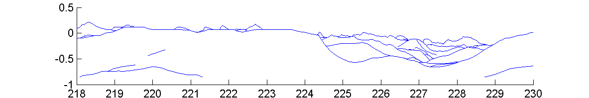 24. El Gringo, interessant med rapport fra Omnsfjellet som jeg har hatt gleden av å besøke flere ganger såvel i studietiden under kambrium-silur som i de senere år. Fikk interesse for hvilke topper du ser på bildet ditt i det fjerne mot sydvest. Tok derfor ut en terrengprofil, og den stemmer fint med ditt bilde (jeg har overdrevet skaleringen i vertikal retning). Fjellene er som følger: 219.3 grd. Vikesaksa 220.7 ” Fløtatind 221.4 ” Skrommelnebba (Øksendal) 221.8 ” Ryssdalsnebba (Øksendal) 222.7 ” Skjorta 224.4 ” Vengetind 225.5 ” Åbittind (Eresfjord) 226.5 ” Kjøvskartind 227.2 ” Kyrkjetaket 228.2 ” Klauva