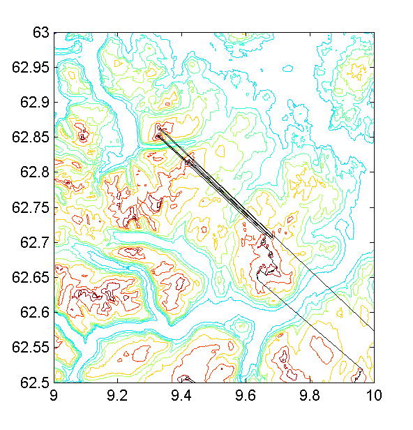Ettersom jeg hadde synsranden for Rendalsølen liggende på fil, plottet jeg ut denne (svart linje) overlagret kart for deler av Trollheimen. Kartet har koteavstand 100 m og starter med kote 600 m. Av dette framgår det at en fra Rendalsølen kan se Brattskarven, Blåøret, Svarthetta og de to Trollhetta-toppene i Trollheimen, og da naturligvis motsatt vei. Så Fjellfinn har nok observert riktig.